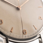 Jaeger LeCoultre Steel Dress Sword Watch 1950er Jahre - Edelstahlgehäuse - cremefarbenes Zifferblatt Nahaufnahme