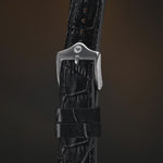 Das Armband aus feinem italienischem Kalbsleder mit geprägtem Alligatormuster bietet eine glänzende exotische Textur und ist gleichzeitig nachhaltig. Es ist nur 2 mm dünn und passt sich Ihrem Handgelenk vom ersten Tragen an perfekt an. Die einzigartige spitz zulaufende Form ist eine diskrete Ergänzung und bildet einen würdigen Rahmen für Ihre klassische Vintage Uhr.