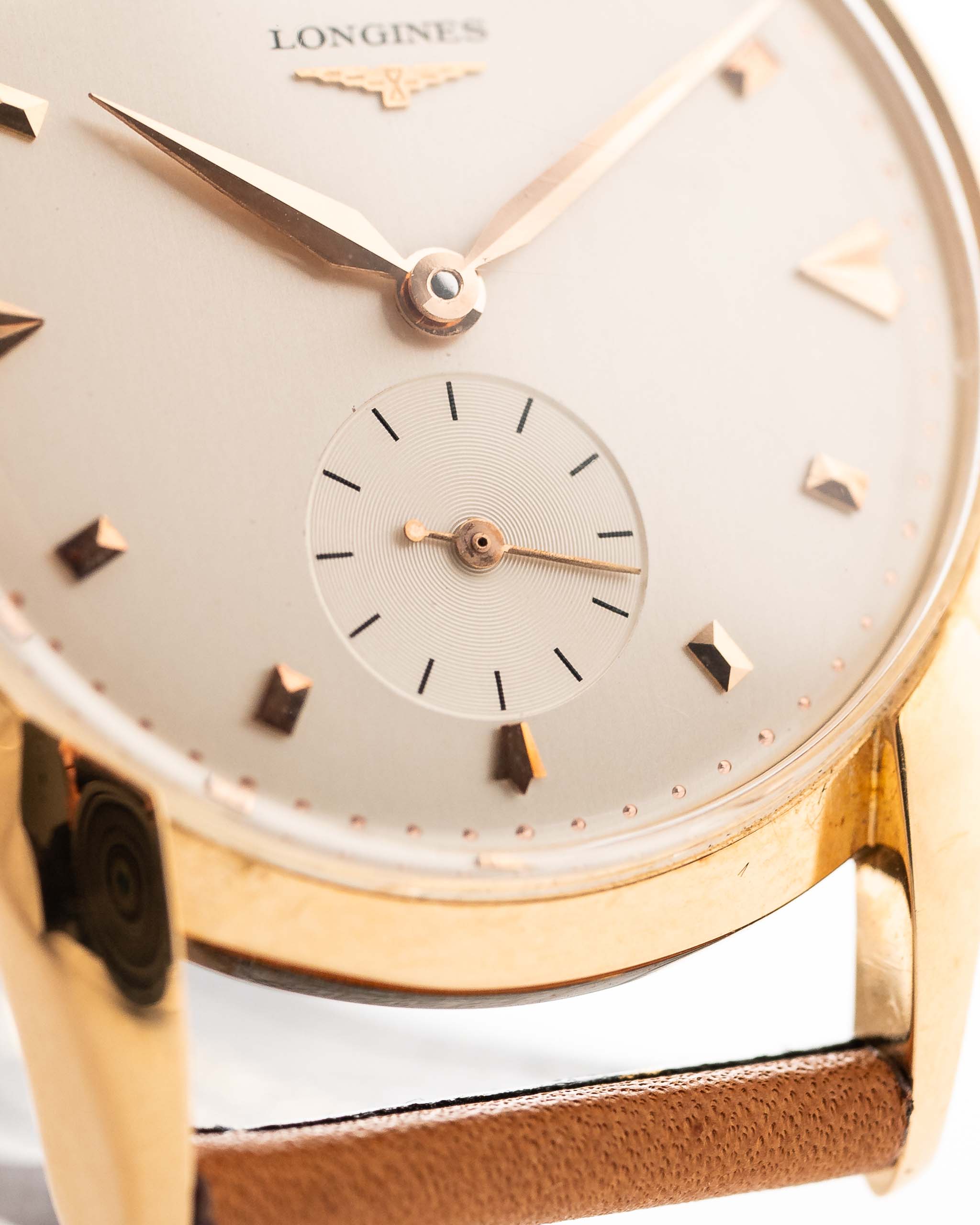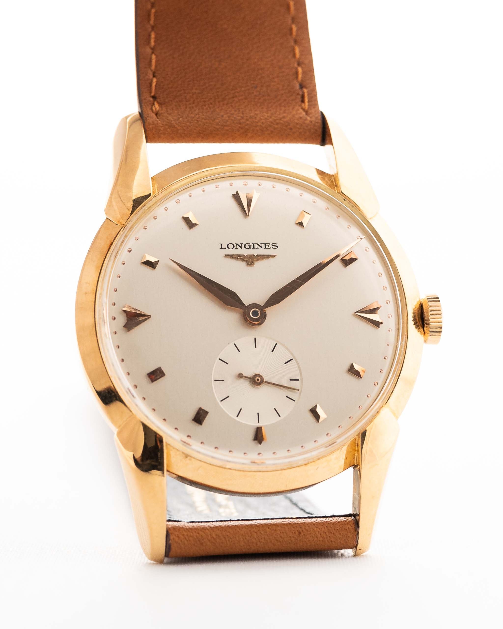 Dieser exquisite Longines-Zeitmesser aus den 1950er Jahren ist ein wahrer Beweis für die zeitlose Raffinesse der eleganten Designsprache der Marke.