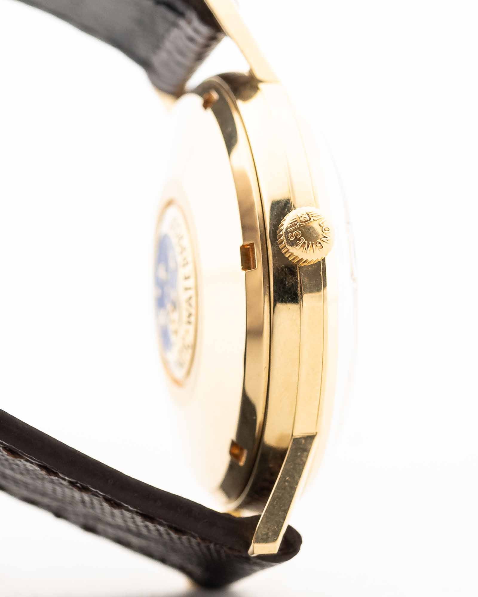 Diese Referenz 9025/25mit einem eleganten Gehäuse aus 18 Karat Gelbgold befindet sich in ausgezeichnetem Zustand und verfügt über das zuverlässige Longines-Kaliber 291, das für seinen reibungslosen Automatikaufzug und seine robuste Konstruktion bekannt ist.