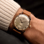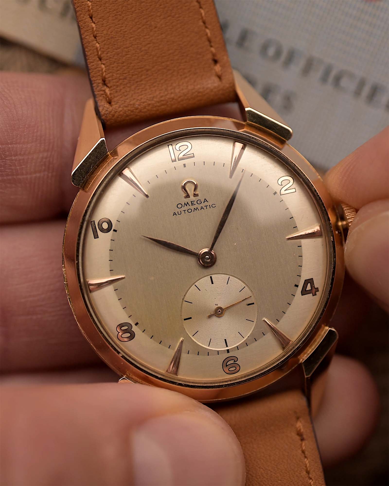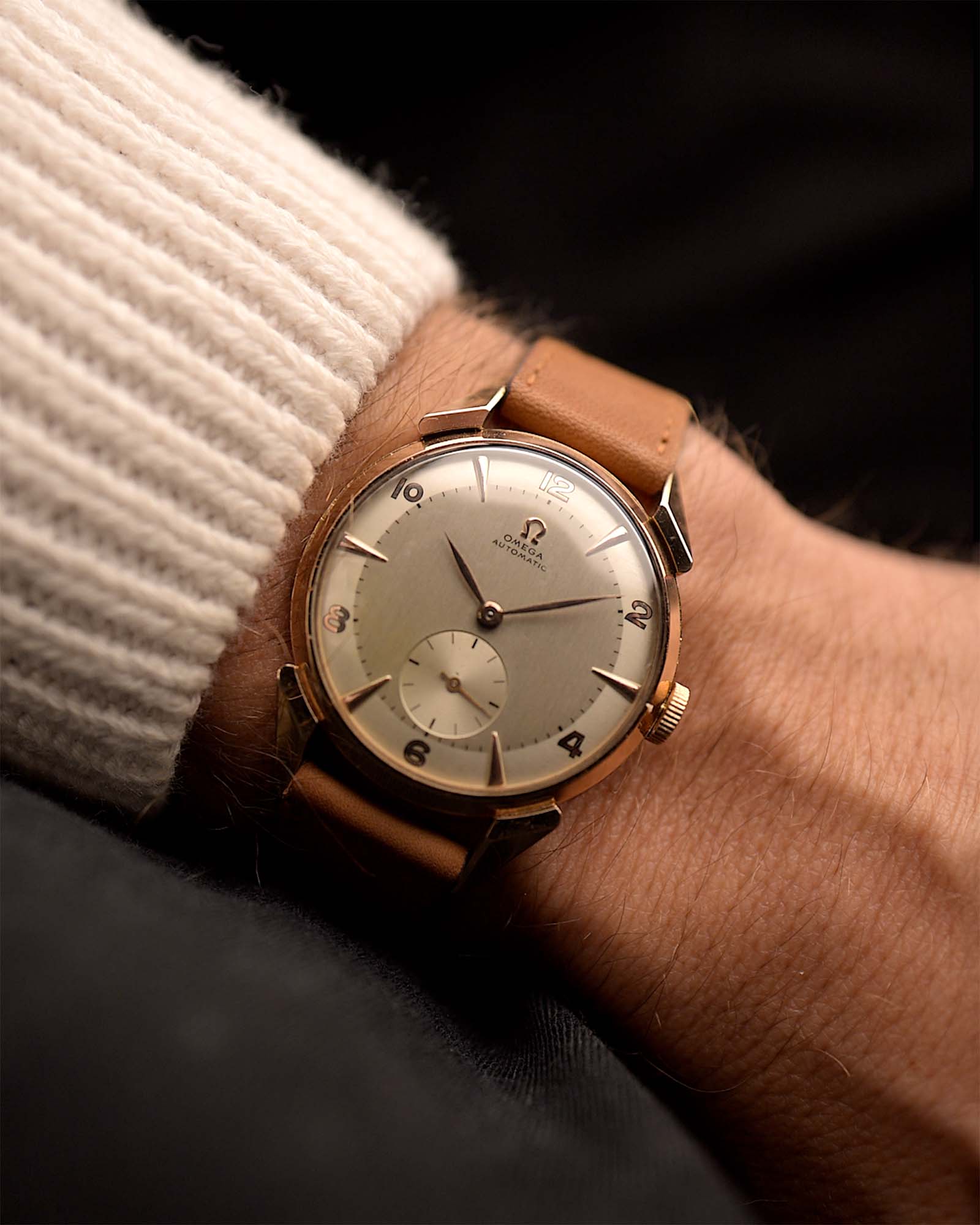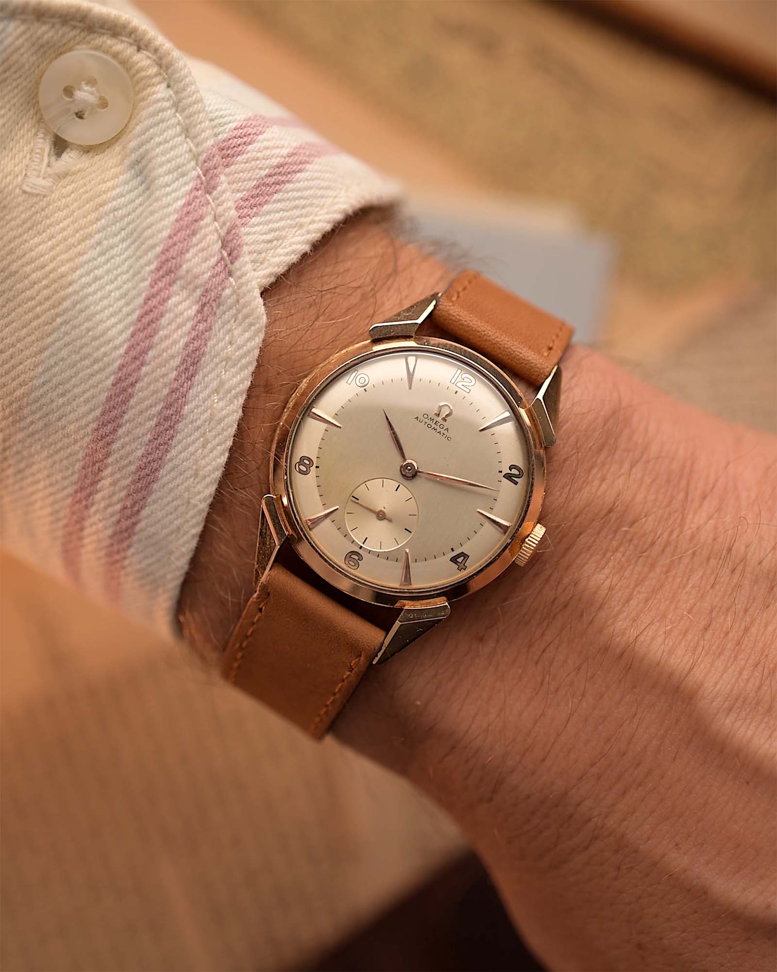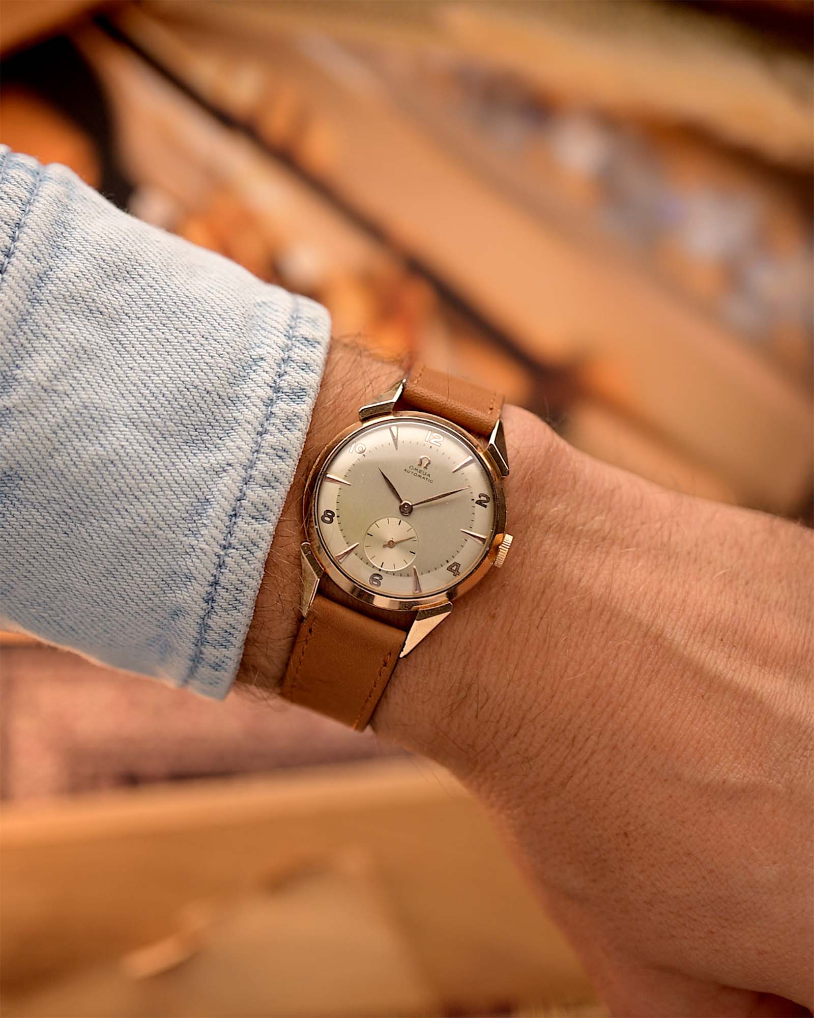 Im Inneren tickt ein frühes Omega-Stoßstangen-Automatikwerk, eine charmante Erinnerung an die Pionierarbeit der Marke in der Automatikuhrmacherei.