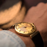 Das Zifferblatt aus Gold mit Sonnenschliff und mit Onyx eingefassten Stabindexen bietet einen subtilen, aber luxuriösen Kontrast. Angetrieben wird die Uhr vom Chronometer-zertifizierten Kaliber 561, einem der renommiertesten Automatikwerke von Omega aus dieser Zeit, das für eine exzellente Mechanik sorgt, die zu dem raffinierten Äußeren passt.