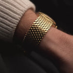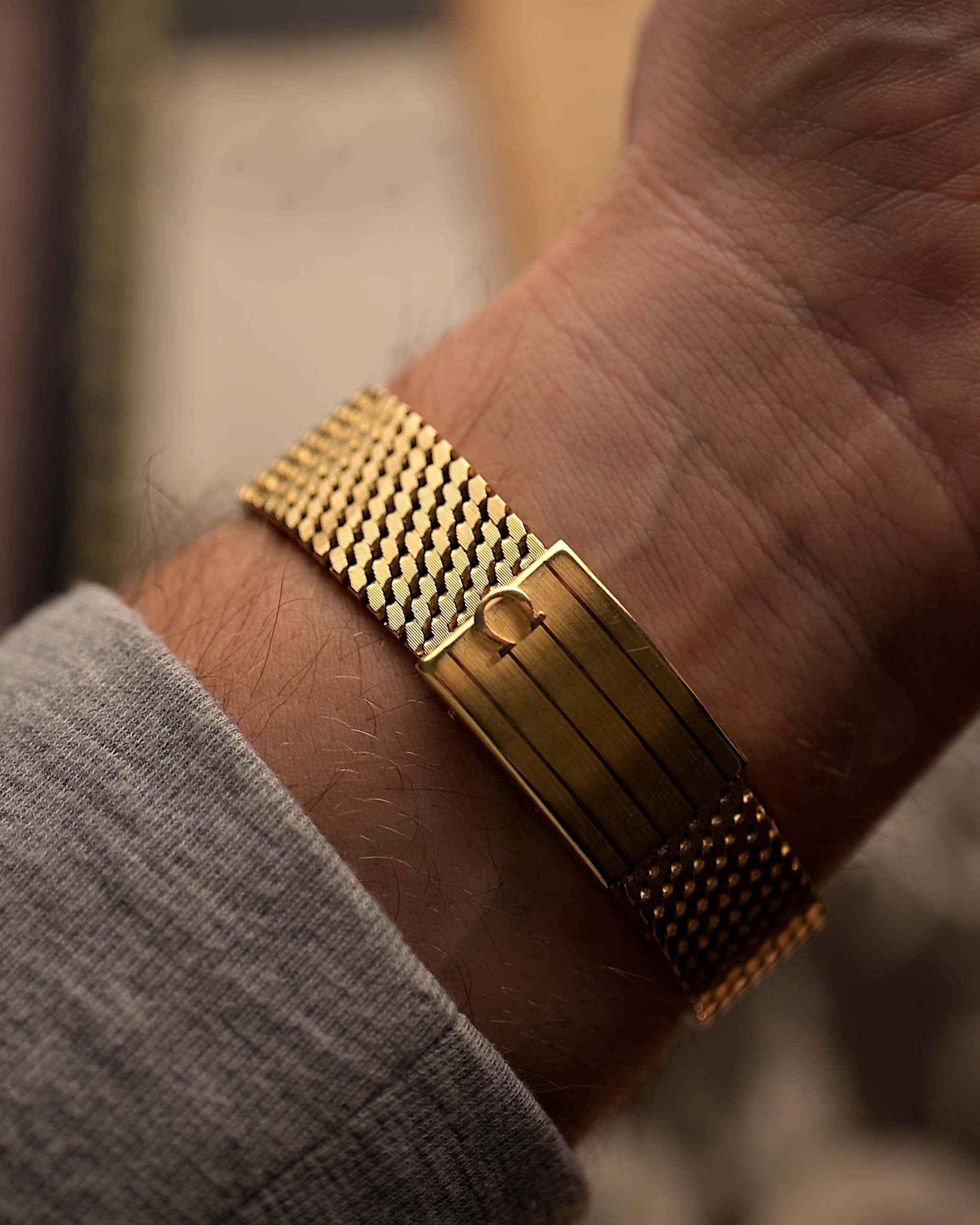 Goldene Vintage-Uhr von Audemars Piguet, die sanft mit beiden Händen gehalten wird.