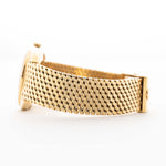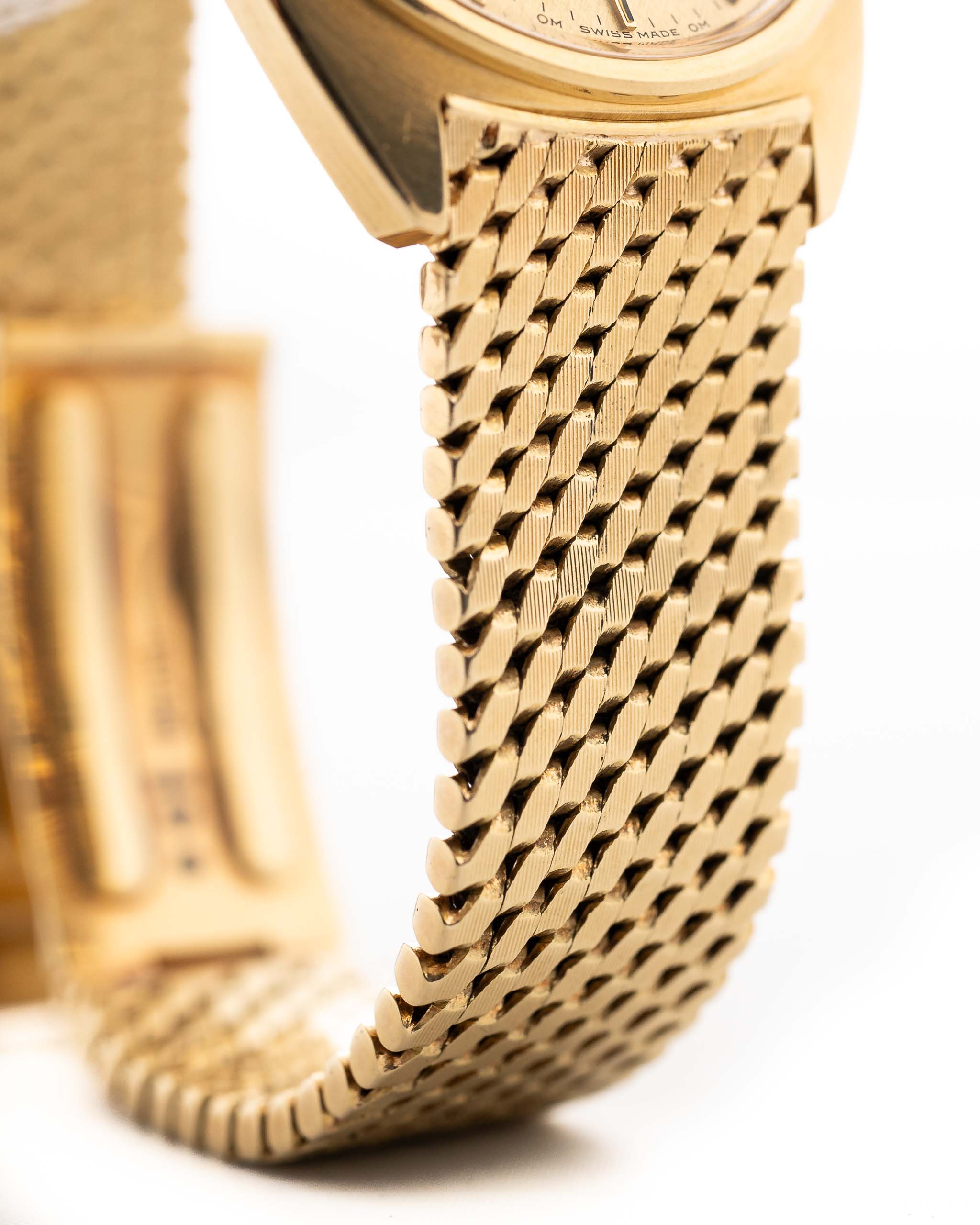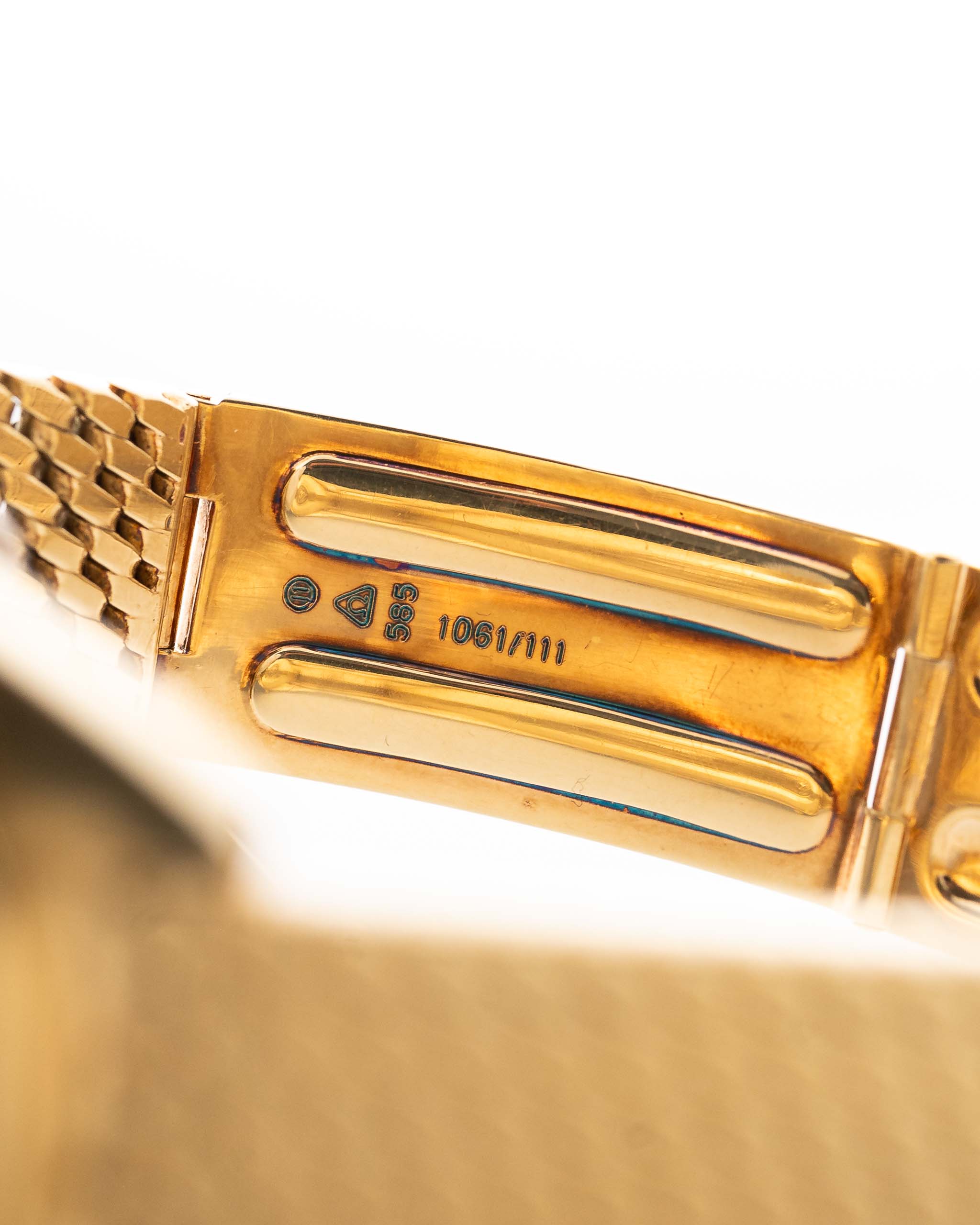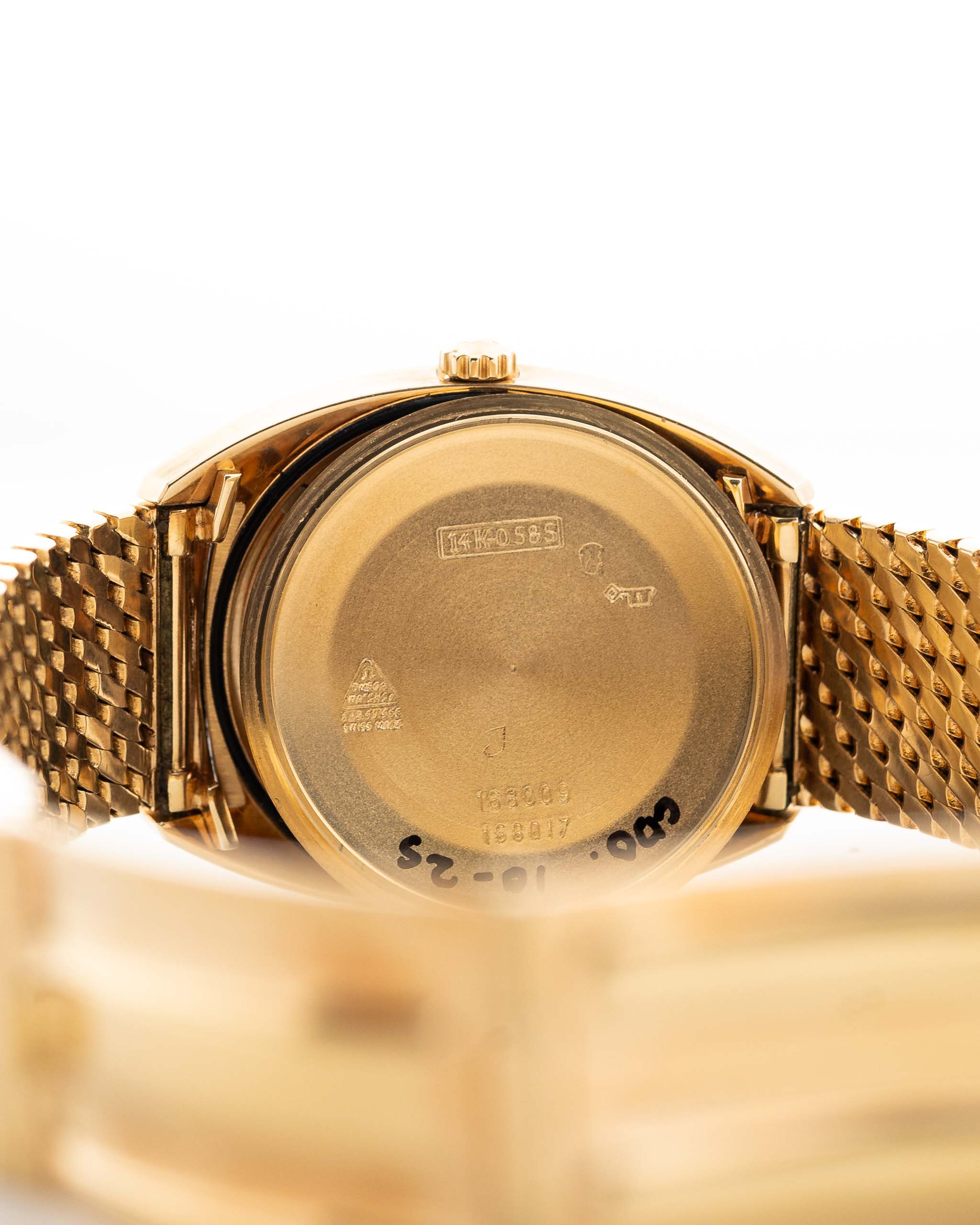 Dieses Exemplar aus massivem 14-karätigem Gelbgold verfügt über ein perfekt erhaltenes goldenes Leinenzifferblatt mit schlanken Strichindizes und passenden Dauphine-Zeigern. Die subtile Textur des Zifferblatts fängt das Licht wunderschön ein und bietet ruhigen Luxus aus jedem Blickwinkel.