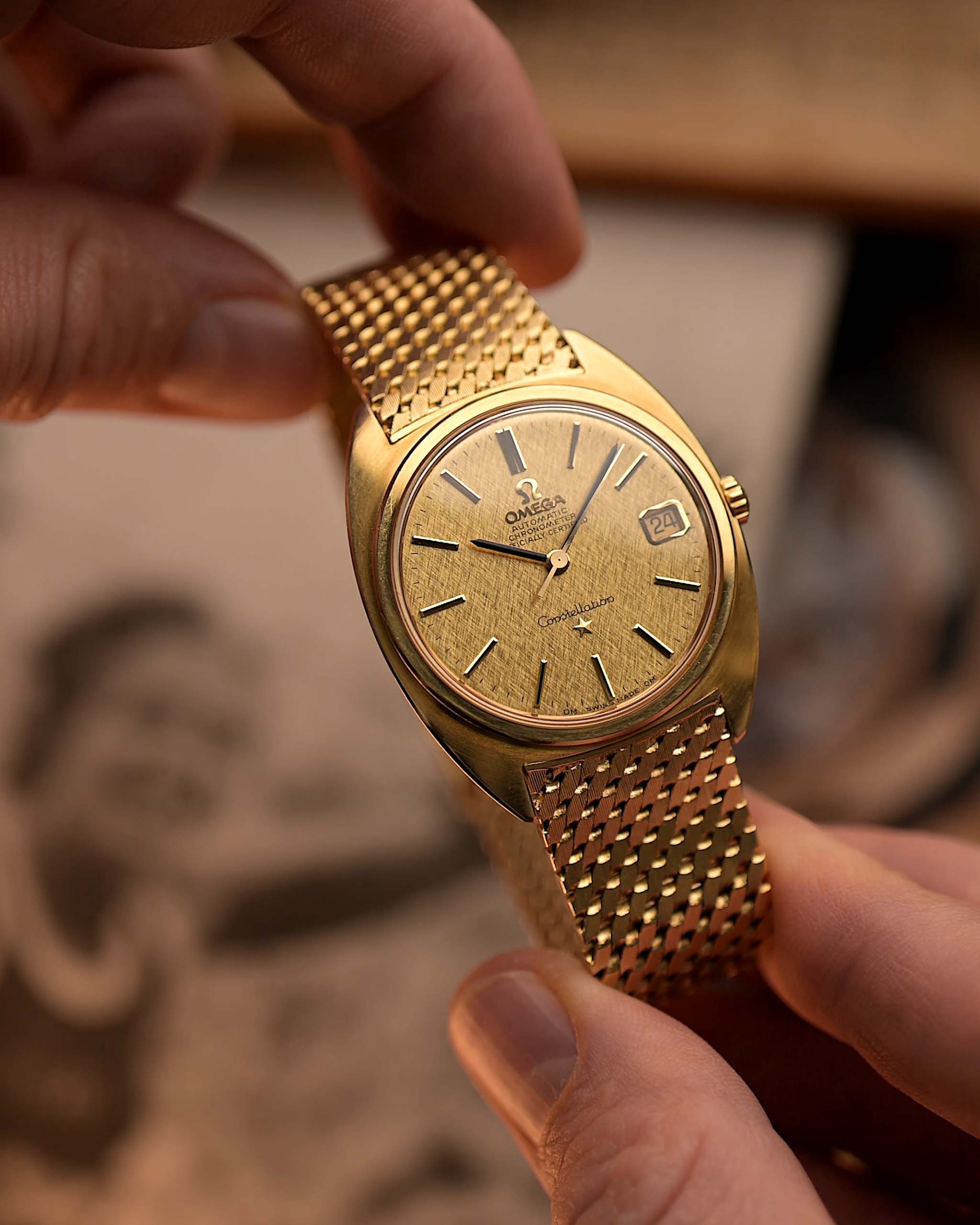 Die Uhr behält ihr originales 14-karätiges Gelbgoldarmband, eine seltene und sehr begehrte Konfiguration, die dieser Constellation ein nahtloses, integriertes Aussehen am Handgelenk verleiht. Im Inneren schlägt das chronometerzertifizierte Kaliber 564 von Omega, ein Uhrwerk, das für seine Zuverlässigkeit und Präzision bewundert wird - das mechanische Herz eines langlebigen Klassikers.