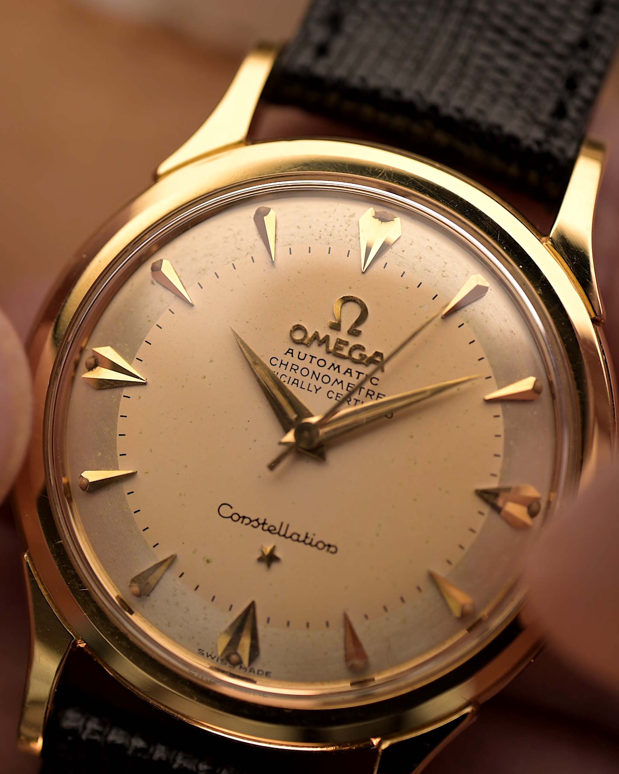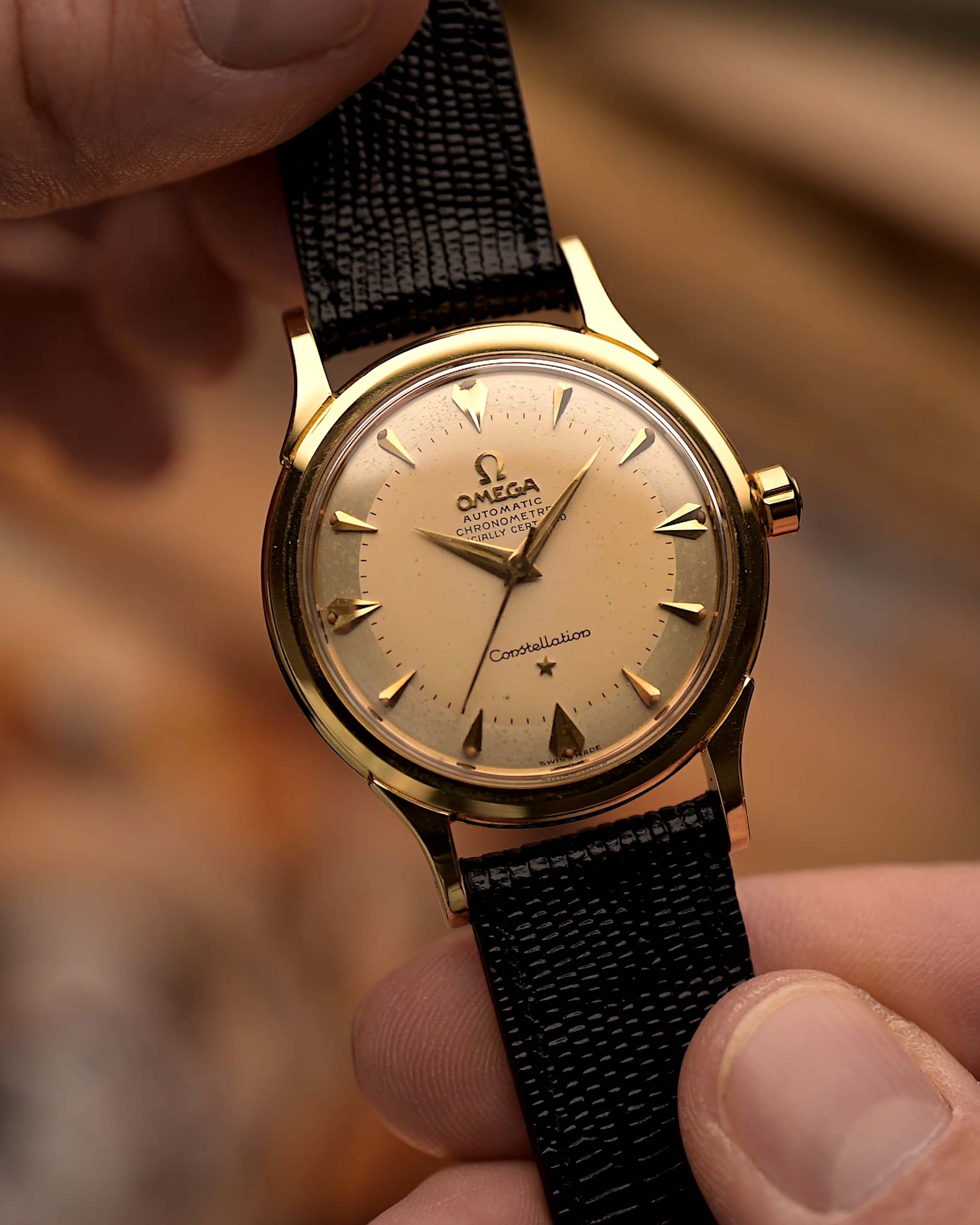Die 1954 eingeführte Omega Constellation sollte der Rolex Datejust Konkurrenz machen - und diese frühe Referenz 2782 ist ein fantastisches Beispiel für diese Mission. Mit ihrem 35-mm-Gehäuse aus 18-karätigem Gelbgold, dem klassischen zweifarbigen Zifferblatt und den markanten Dolchmarkern ist sie ein tragbares Stück Uhrmachergeschichte.
