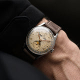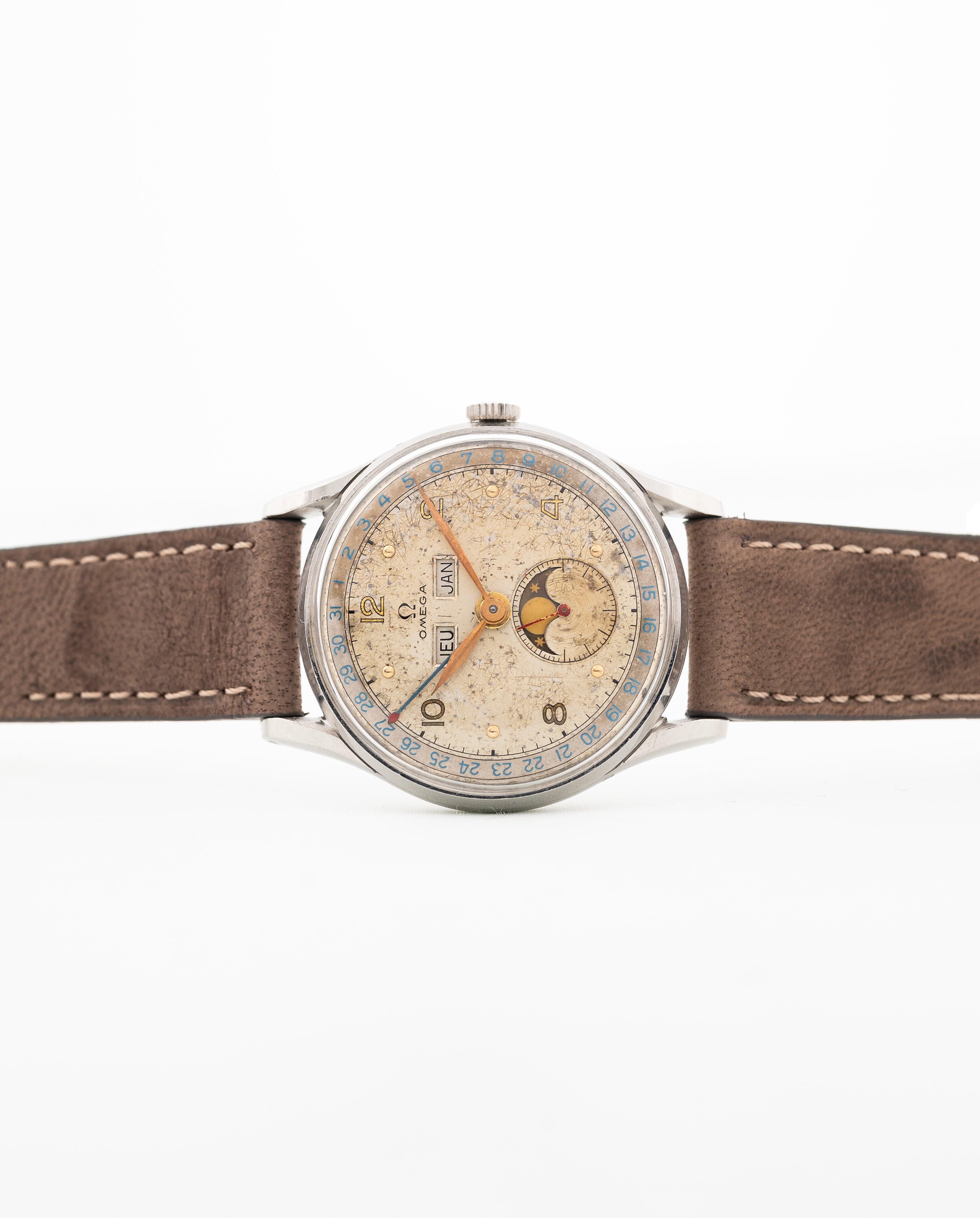 Das Zifferblatt hat in der oberen Hälfte Tages- und Monatsfenster und in der unteren Hälfte eine Mondphase in der großen Subsekundenanzeige. Das äußere Gestell auf dem Zifferblatt ist mit einem auffälligen blauen Datumsring versehen. Die Blattzeiger sind alle in hervorragendem Zustand, ebenso wie der gebläute Datumszeiger aus Stahl - das Zifferblatt hat eine starke und warme Patina entwickelt.