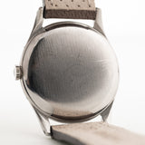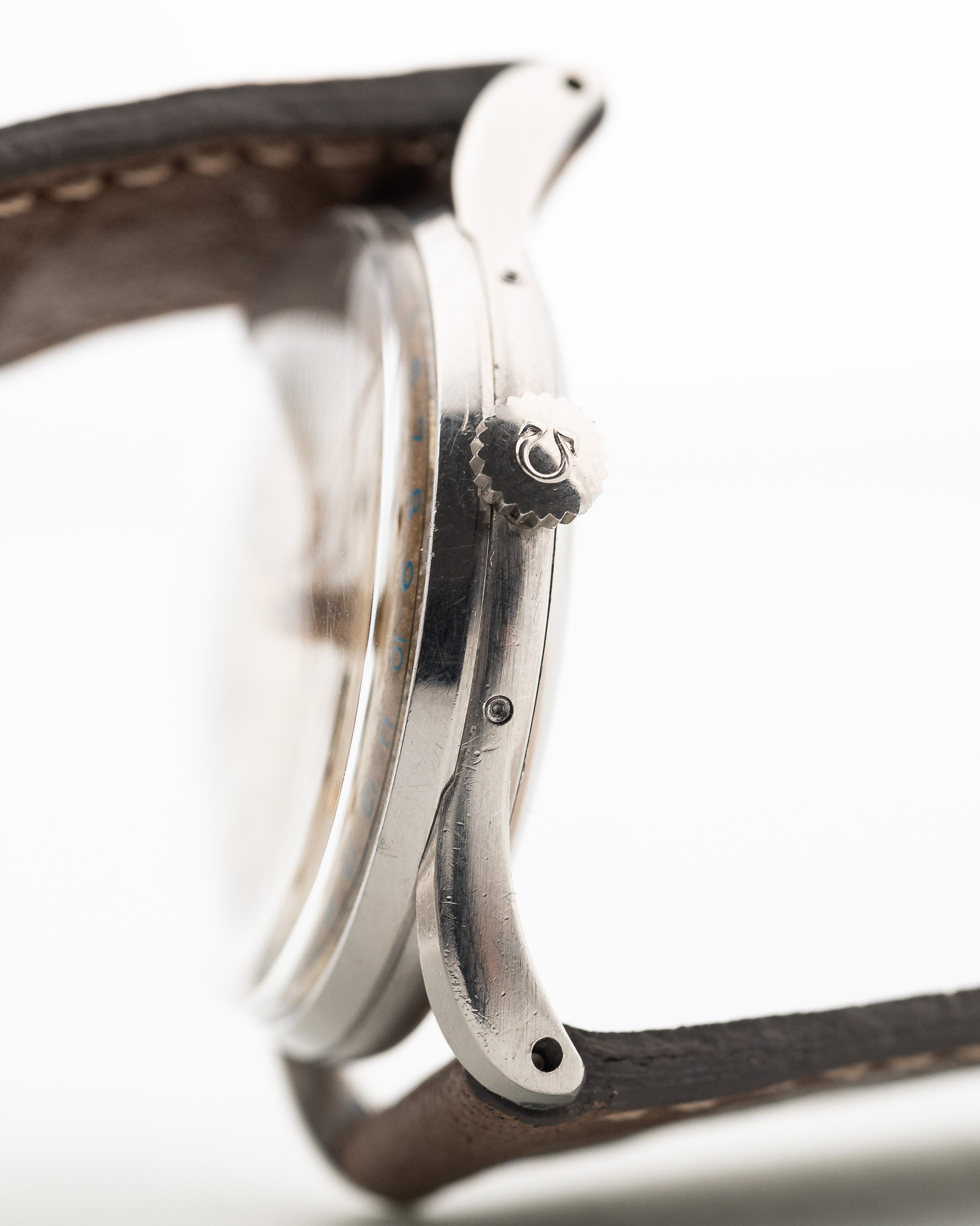 Die Omega Cosmic wurde 1947 eingeführt und war bis 1956 die prestigeträchtigste Uhr im Katalog der Marke. Dieses Exemplar ist eine Referenz 2471-1 aus Edelstahl, misst 35 mm und beherbergt das auf Lemania basierende Uhrwerk Omega Calibre 27 DL PC.