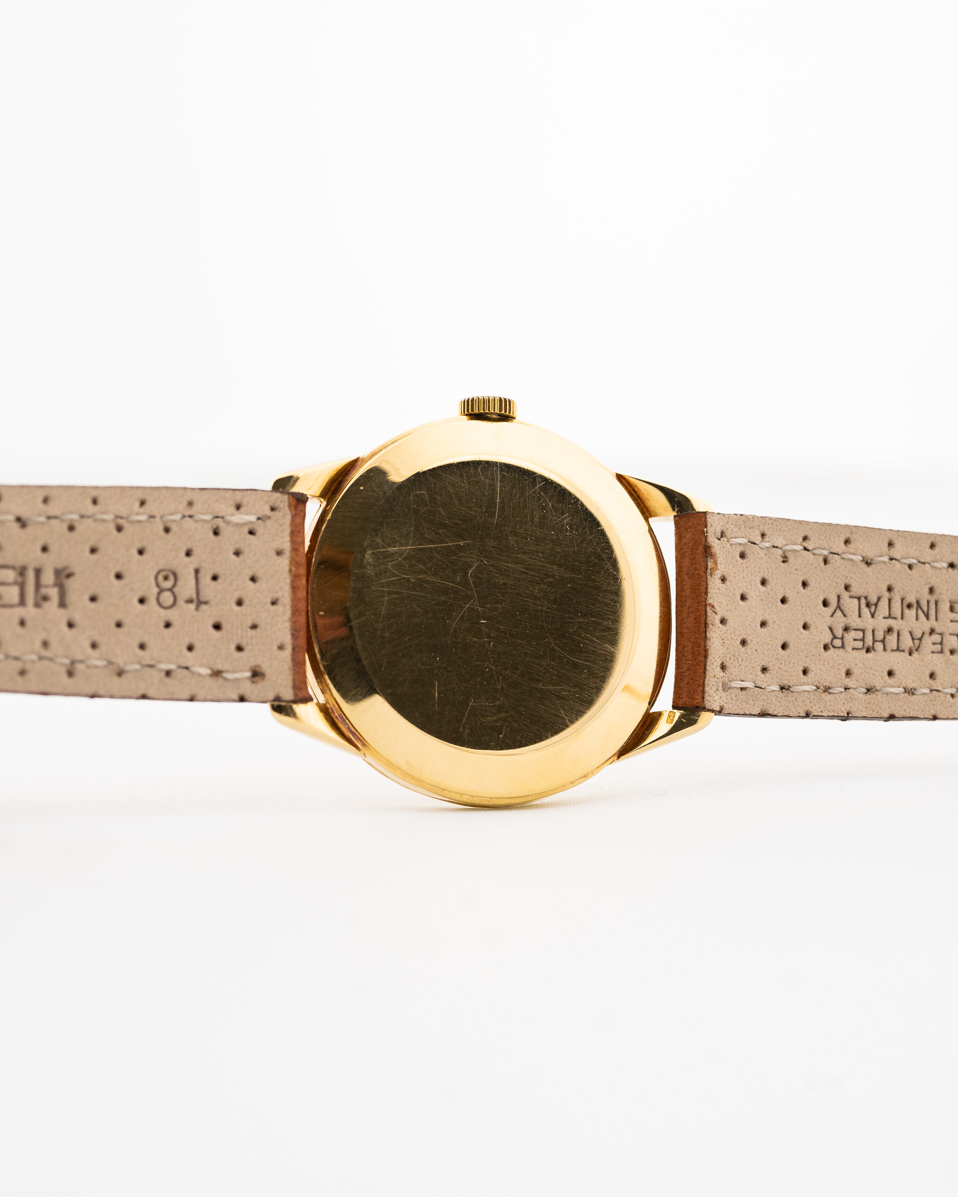 Dieses Exemplar sieht nicht nur gut aus, sondern ist auch solide. Ausgestattet mit einem 35-mm-Gehäuse aus Gelbgold, geraden Bandanstößen und einem wunderschönen Zifferblatt aus Gelbgold mit Onyx-Indizes, ist diese Uhr wirklich unschlagbar.