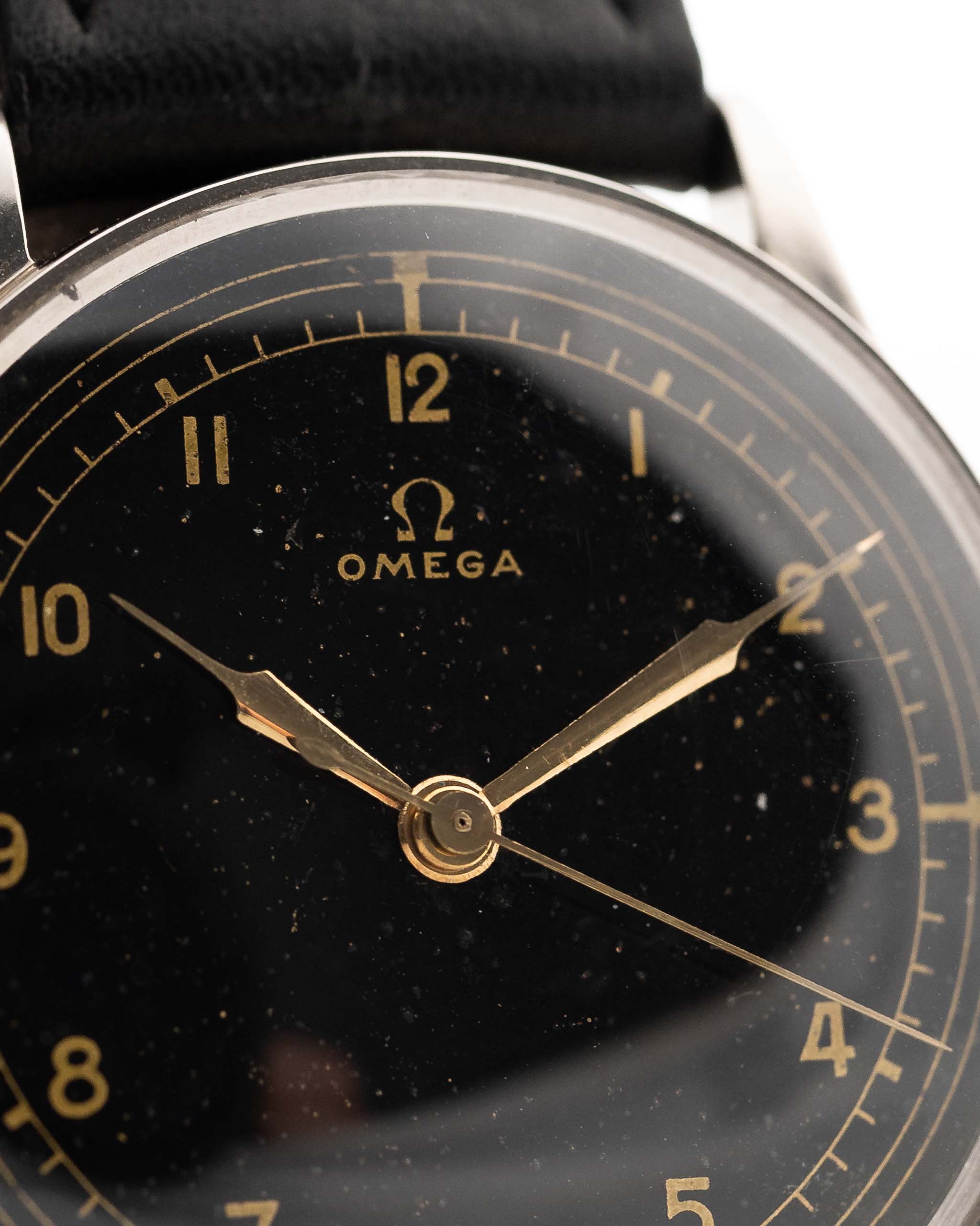 Diese Omega von 1935 ist ein außergewöhnliches Beispiel für die Schweizer Uhrmacherkunst des frühen 20. Jahrhunderts - und ein wahres Sammlerjuwel. Ihr schwarzes, glänzend vergoldetes Originalzifferblatt mit goldenen arabischen Ziffern, passenden vergoldeten Spritzenzeigern und einer Minutenanzeige strahlt Eleganz und Charakter aus. Zifferblätter wie dieses sind nur selten in einem so schönen Zustand erhalten.
