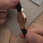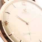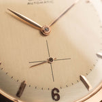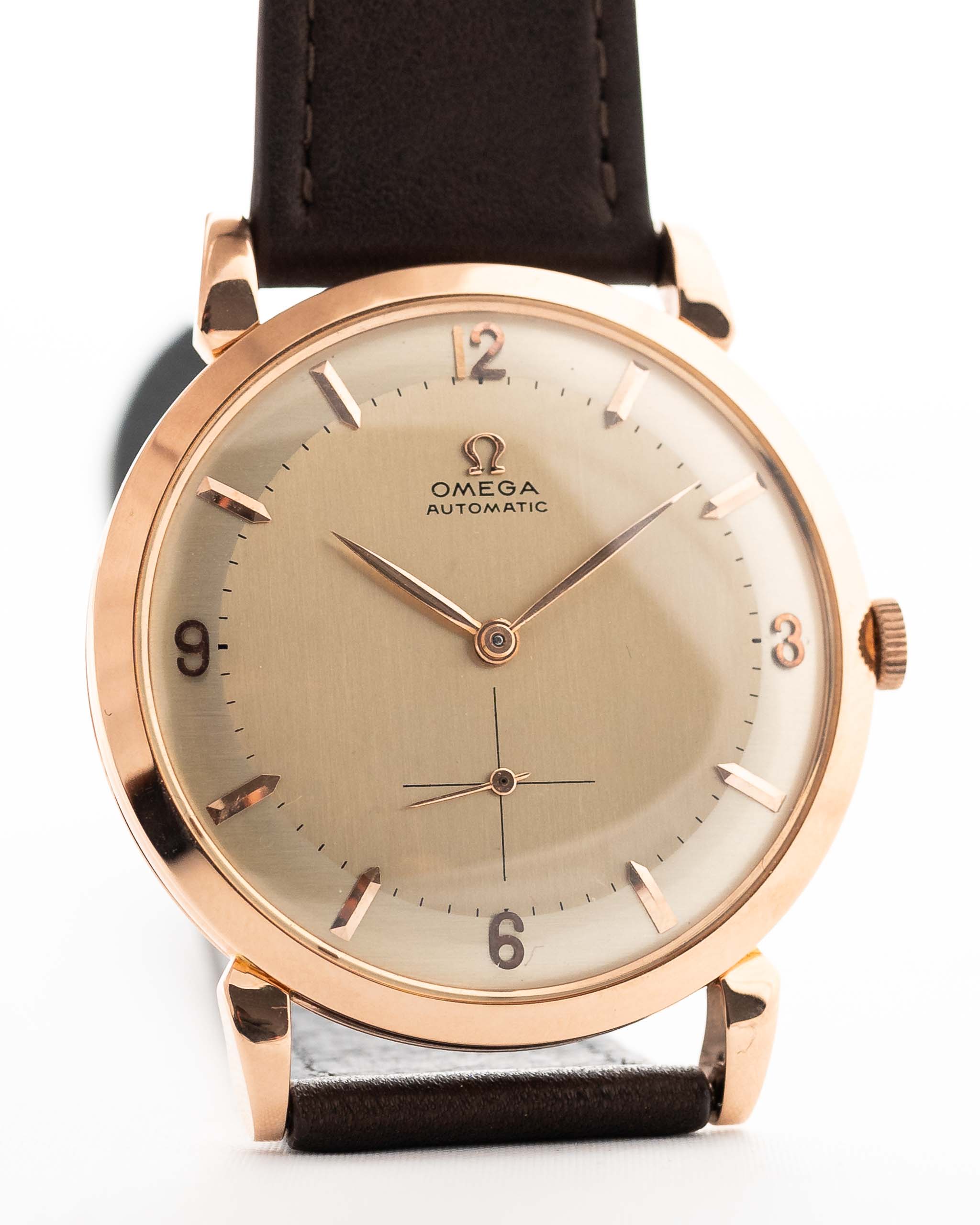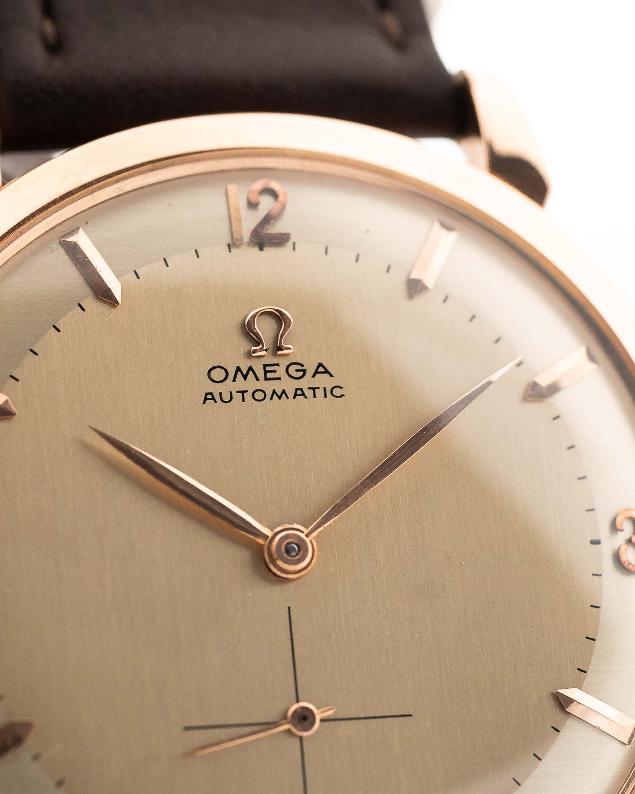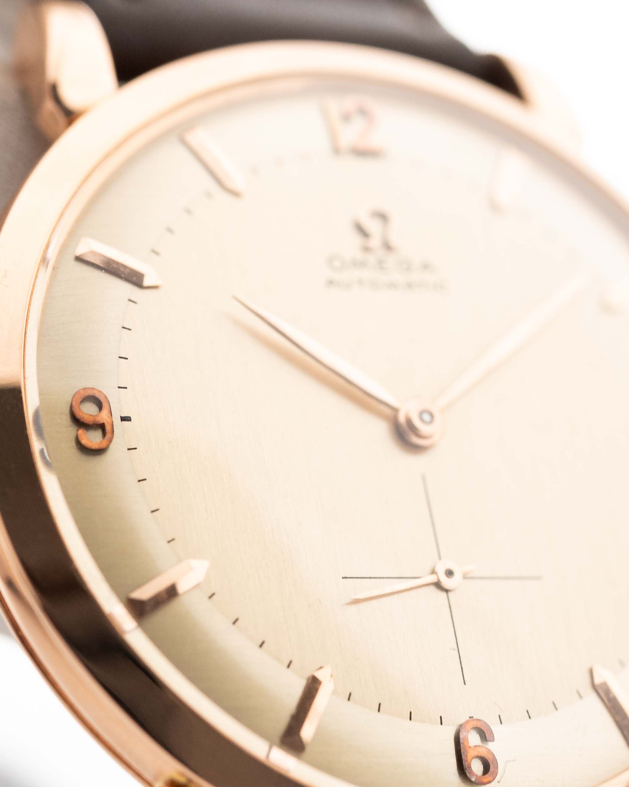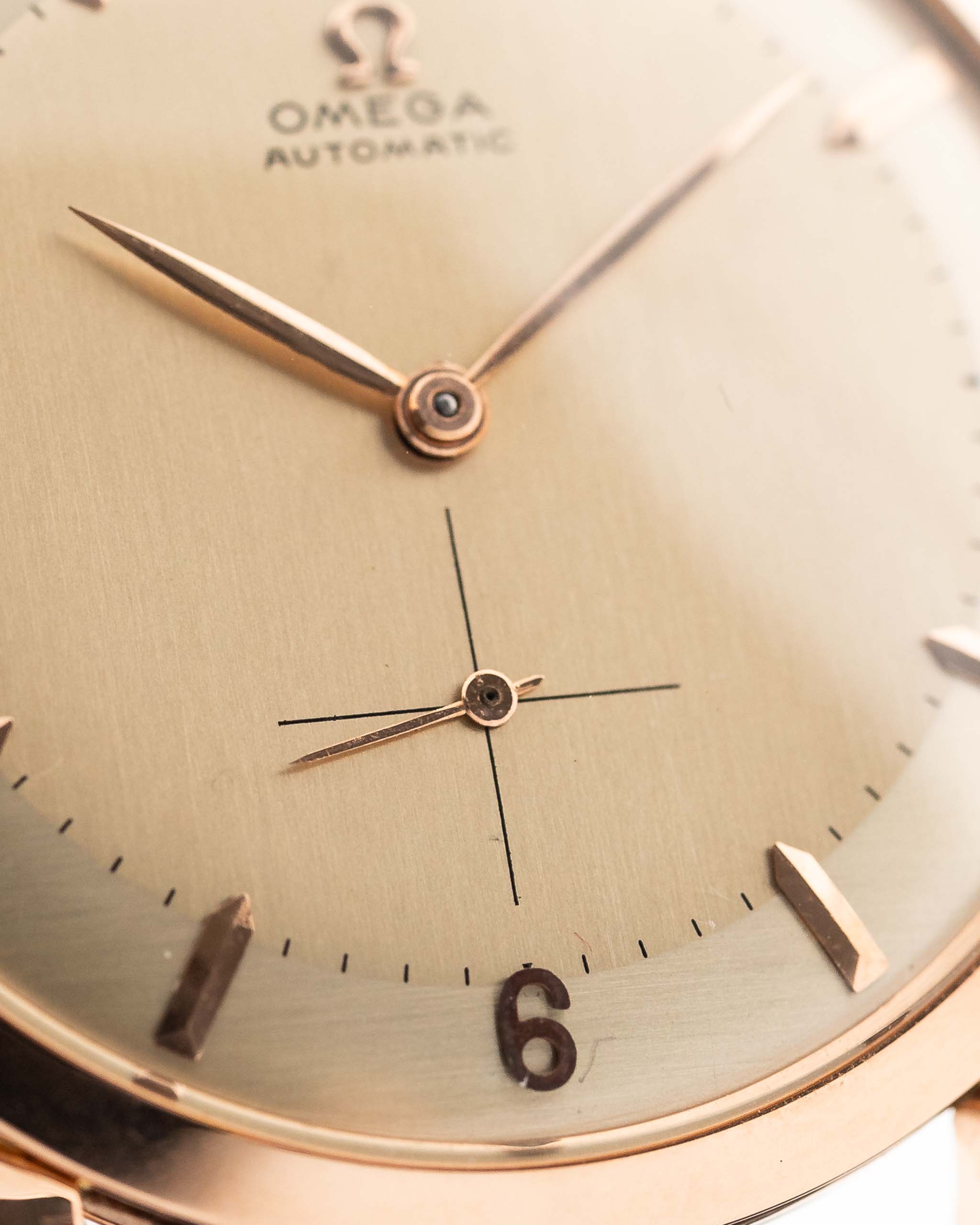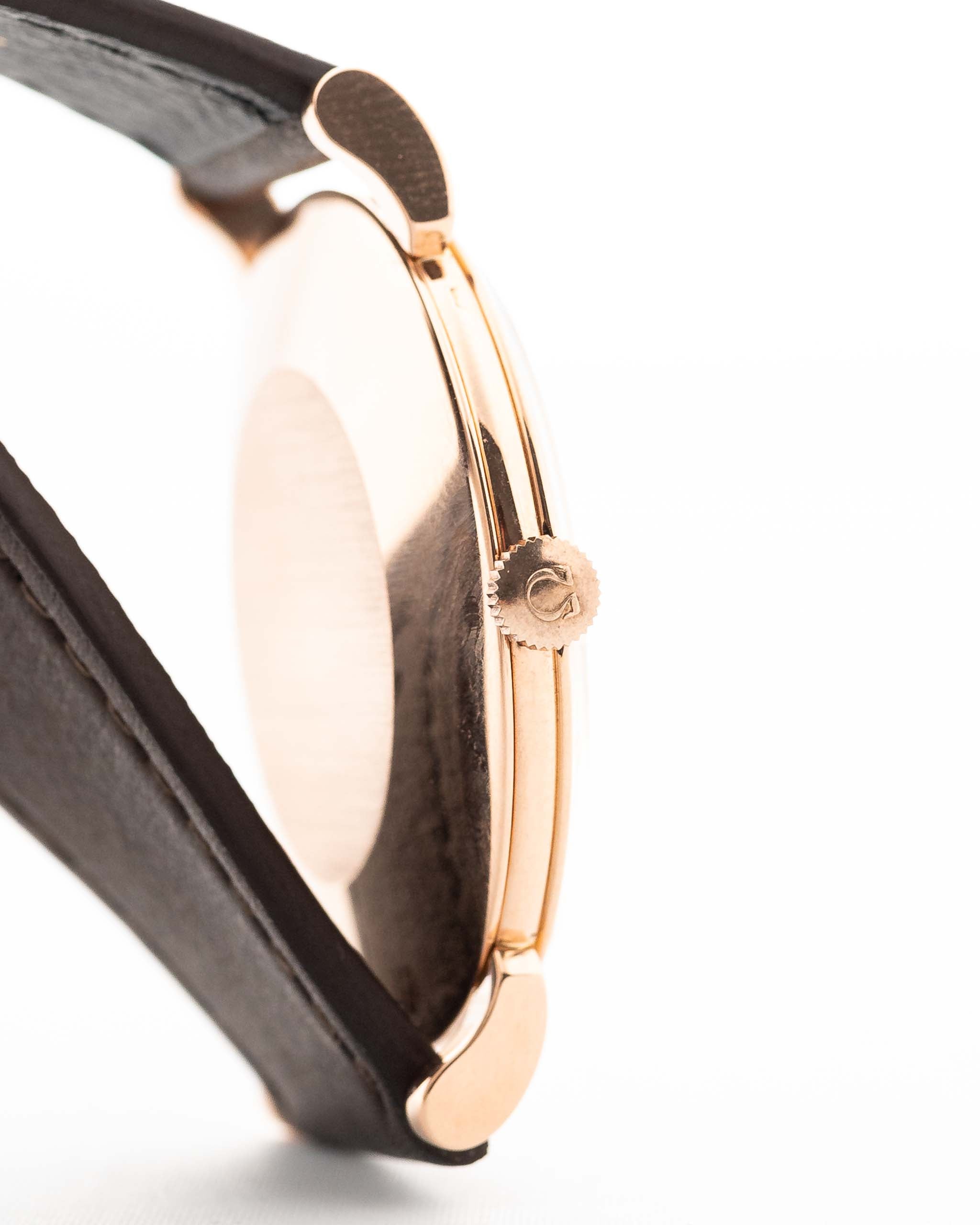 Diese Omega von 1944 hat alles, was Sie sich von einer Armbanduhr wünschen - ein riesiges 37,5-mm-Gehäuse, ein großartiges champagnerfarbenes Zifferblatt mit kleiner Sekunde und schönen Zeigern aus Roségold, ein appliziertes Omega-Logo und sehr elegante, überlagerte Indexe aus Roségold. Das Tüpfelchen auf dem i sind die großen, nach unten gedrehten Bandanstöße.