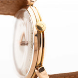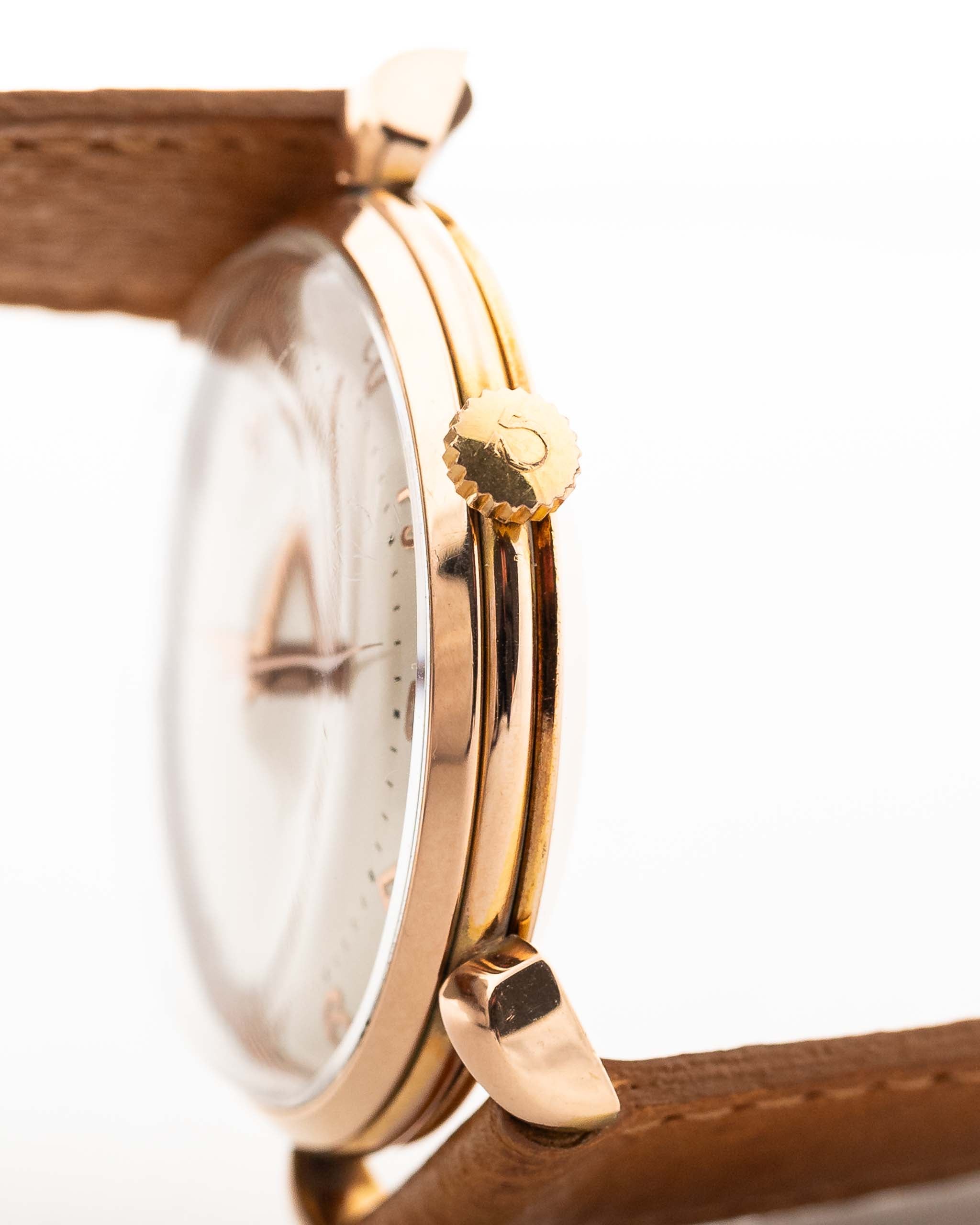 Diese Omega von 1947 hat alles, was Sie sich von einer Armbanduhr wünschen - ein gut ausbalanciertes 37-mm-Gehäuse, ein helles und leicht zweifarbiges Zifferblatt mit rosafarbenen Art-Déco-Ziffern, schöne roségoldene Zeiger und ein appliziertes Omega-Logo. Die wuchtigen tropfenförmigen Bandanstöße und das rosévergoldete Gehäuse sind das i-Tüpfelchen.