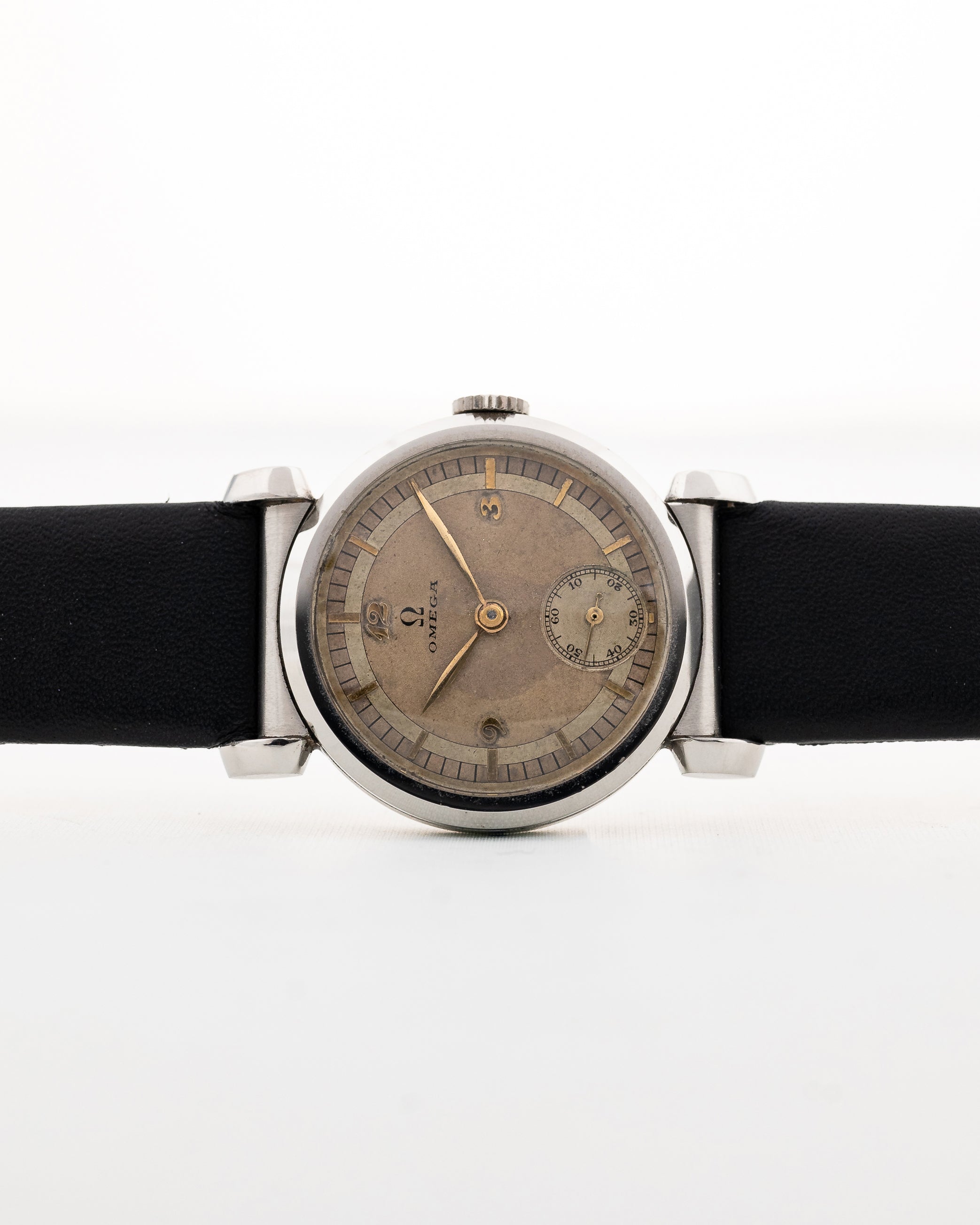 Diese Schönheit bietet ein großartiges Gehäusedesign mit einem fantastischen Zifferblatt aus dem Jahr 1943. Aufgrund des großen Durchmessers von Ansatz zu Ansatz trägt sie sich eher wie eine 35 mm Uhr.