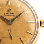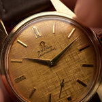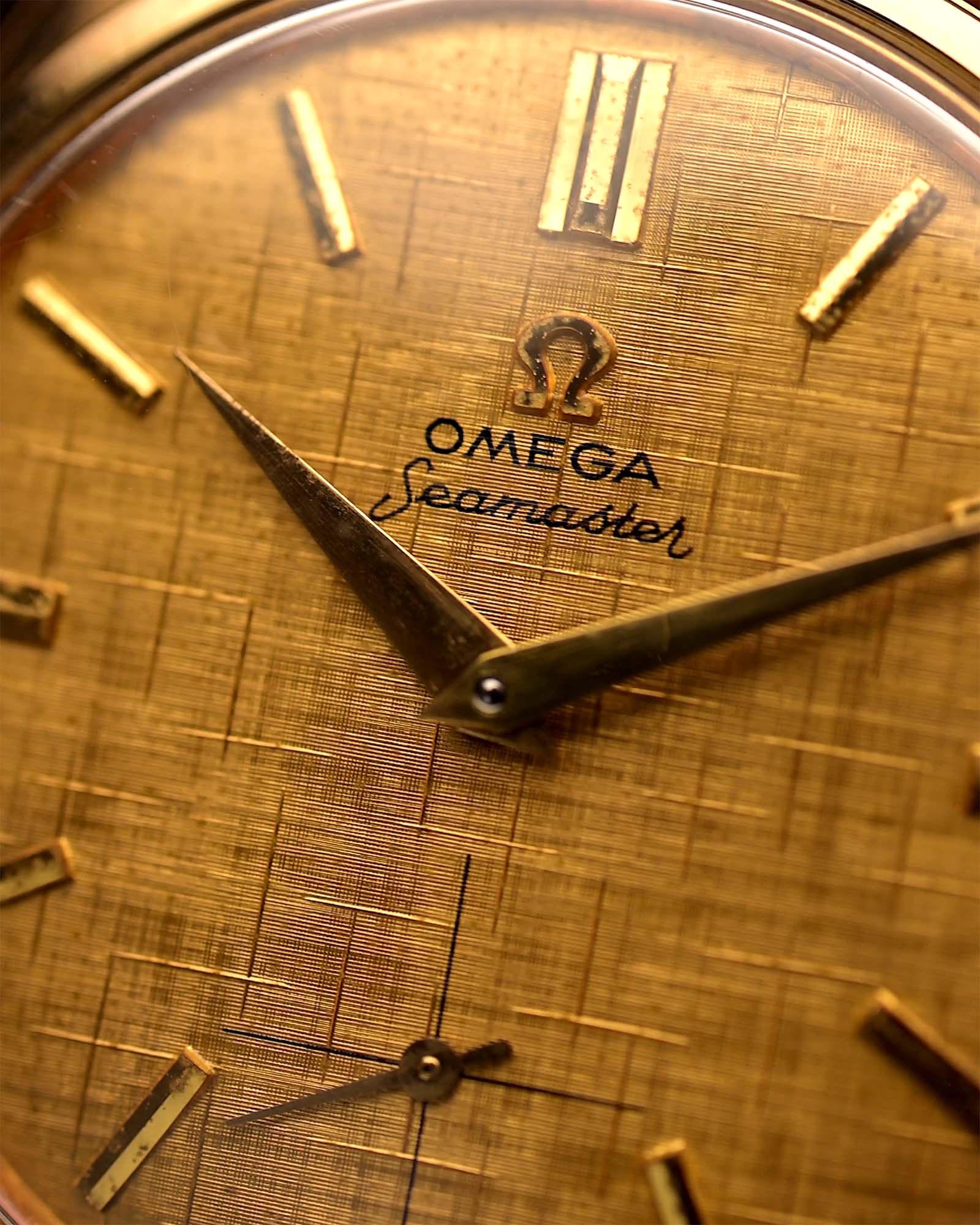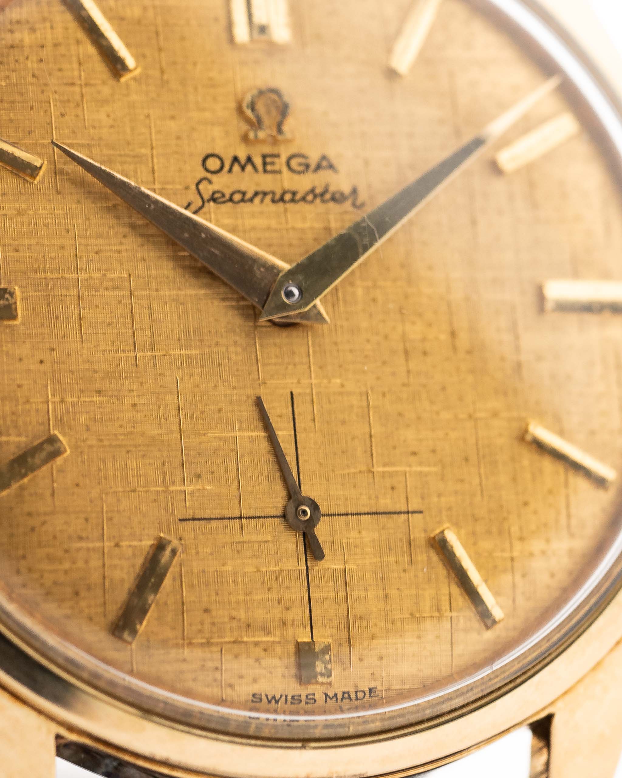 This Omega Seamaster Ref. 2990-1 from 1958 pairs timeless mid-century elegance with rare dial texture and presence. The 36 mm gold-plated case wears large for the era, enhanced by its clean proportions and slightly downturned lugs.