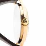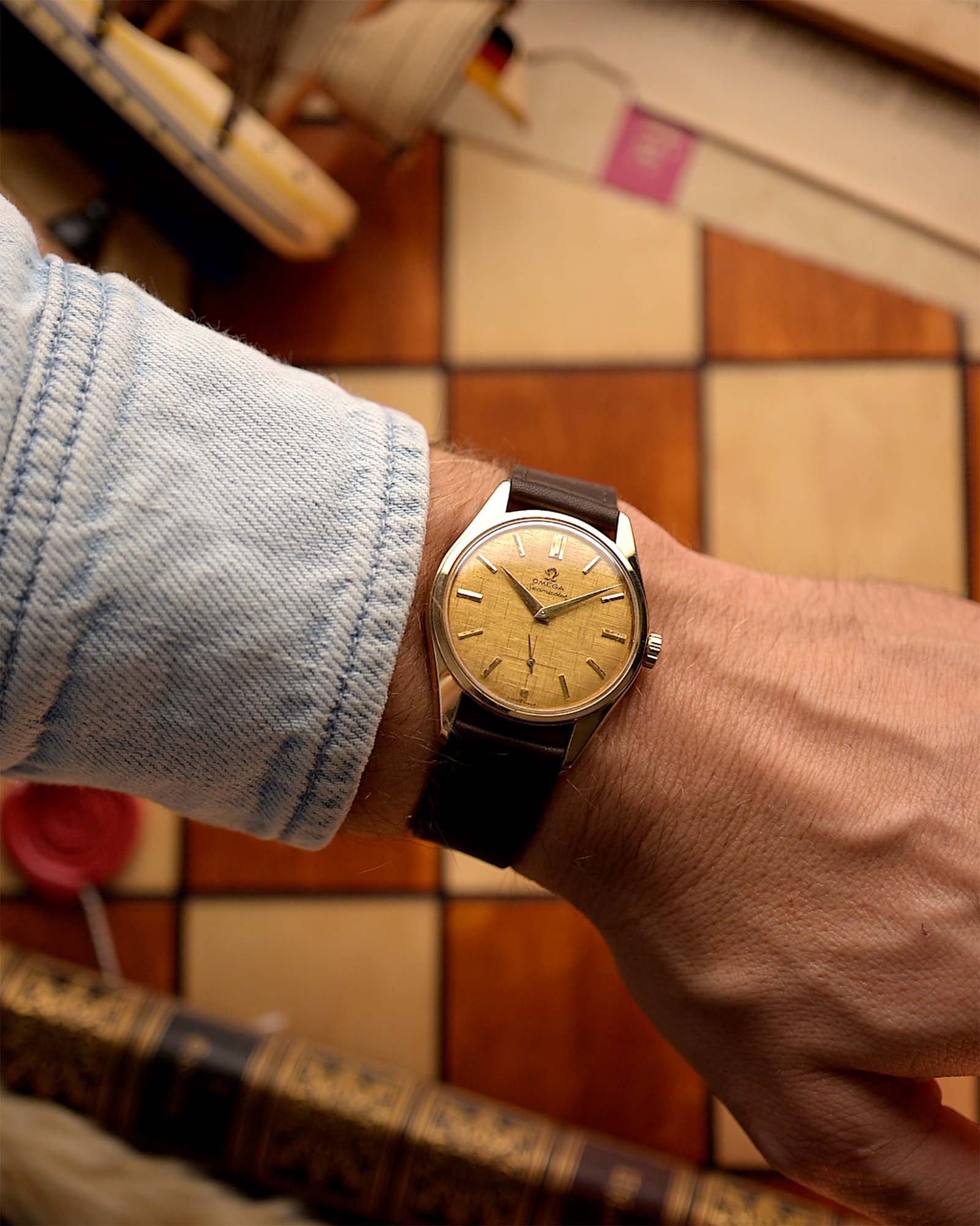 What truly sets it apart is the original golden linen dial — a beautifully preserved surface with rich texture that plays with the light. Framed by gold-tone hour markers and dauphine hands, this dress watch blends understated charm with unique refinement.
