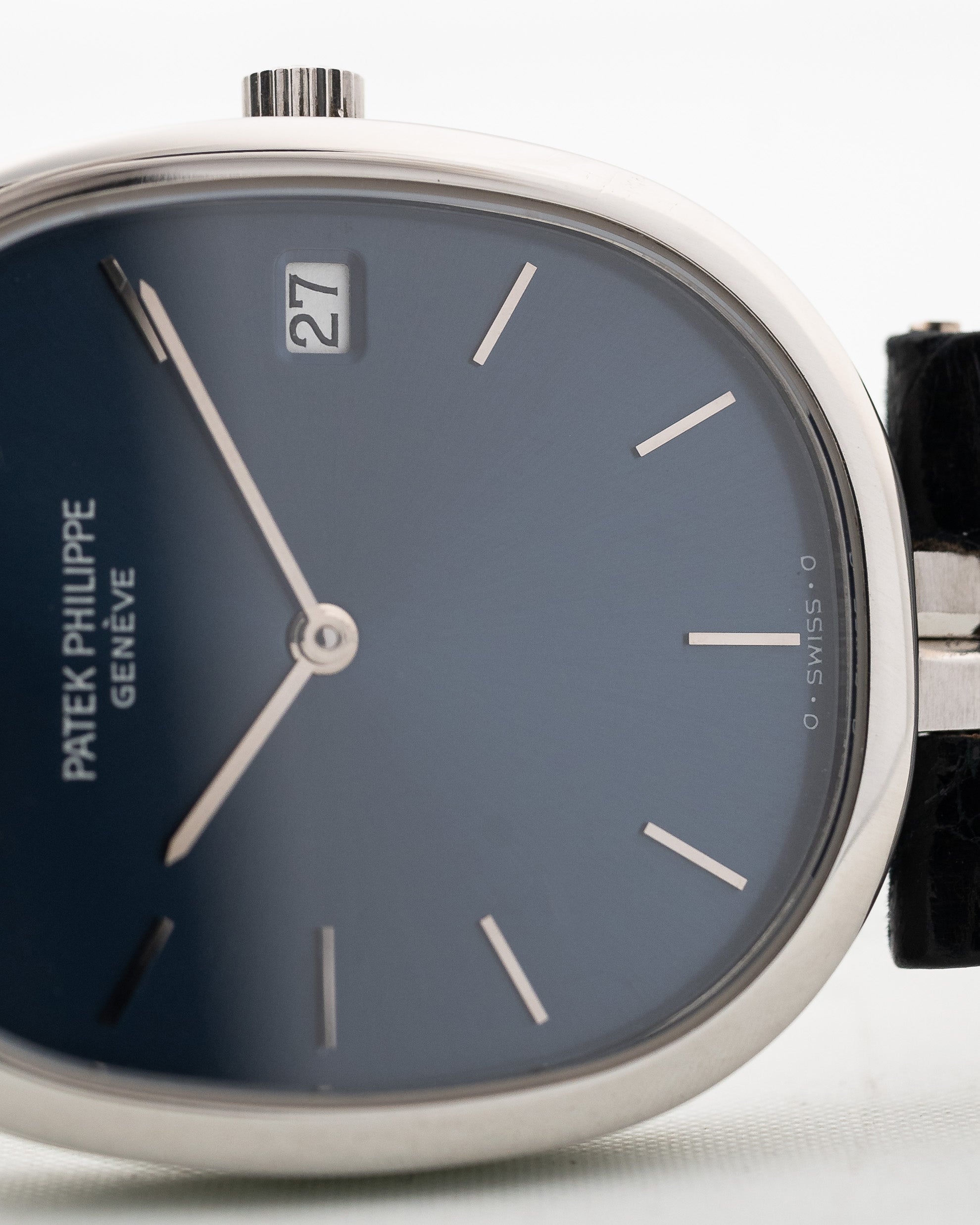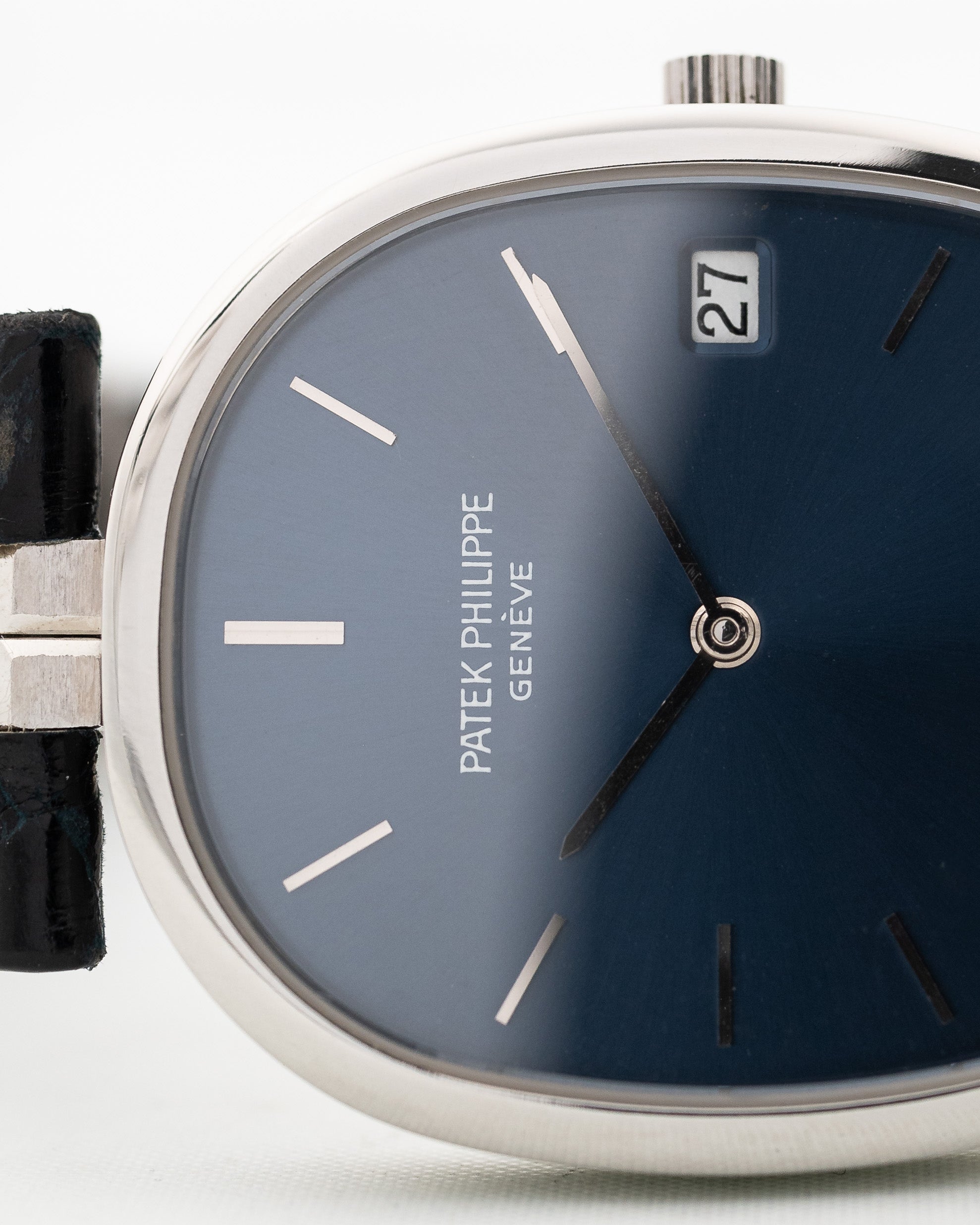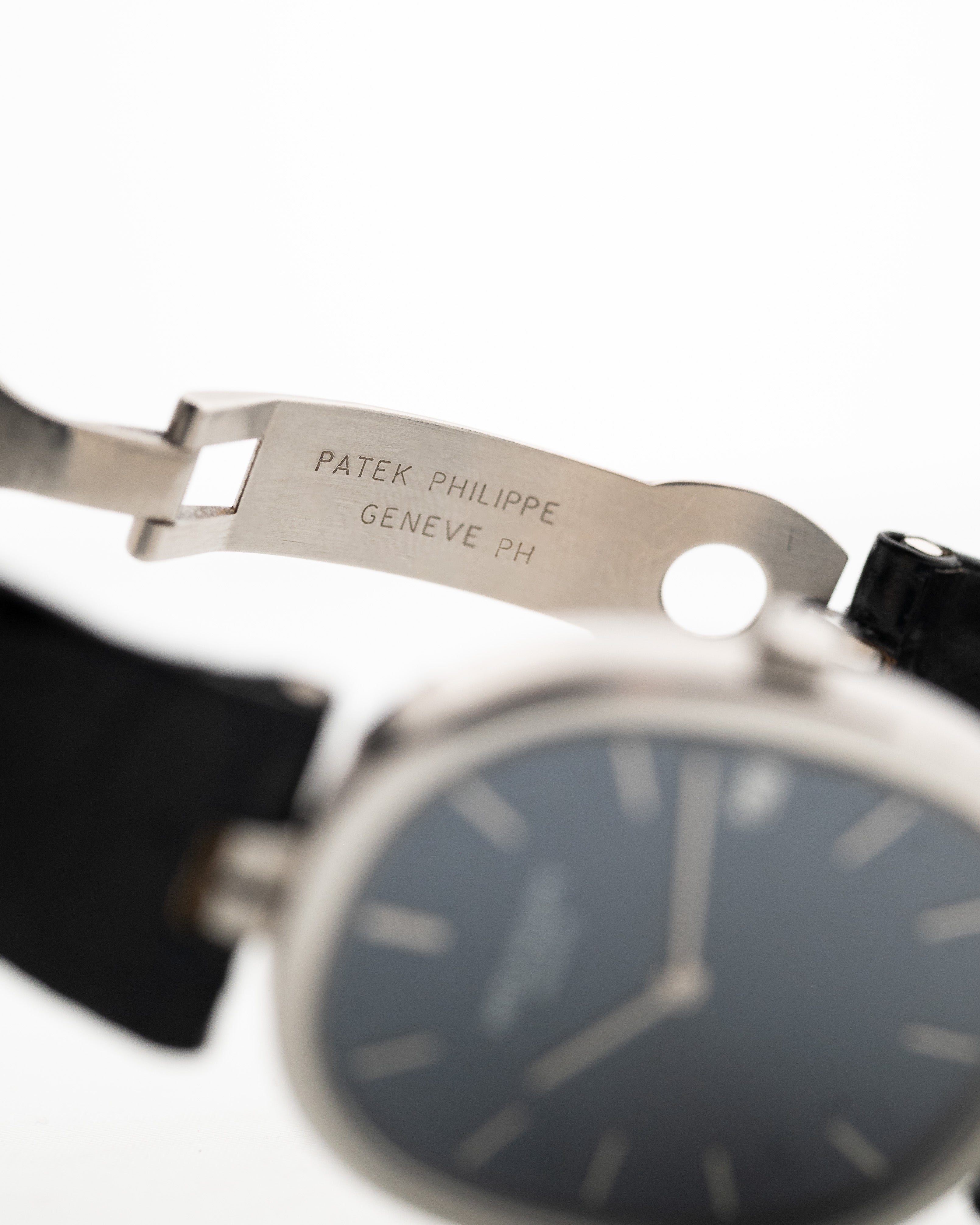 Hier haben wir einen exzellenten Vertreter der Patek Philippes Dress Watches, diese Ref. 3930 trifft alle hohen Töne mit einem seltenen Edelstahlgehäuse, integrierten Bandanstößen und einem wunderschönen tiefblauen Sigma-Zifferblatt in makellosem Zustand.