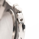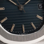 Die Patek Philippe Nautilus 3800/1 repräsentiert die zweite Generation der kultigen Nautilus-Linie - eine verfeinerte und kompaktere Weiterentwicklung des ursprünglichen 3700-Designs von Gérald Genta. Die 3800 wurde Anfang der 1980er Jahre eingeführt und verfügt über ein perfekt ausbalanciertes 37,5-mm-Edelstahlgehäuse, das alle charakteristischen Elemente der Nautilus beibehält: die abgerundete achteckige Lünette, die "Ohren" an den Seiten und das horizontal gerippte anthrazitfarbene Zifferblatt.