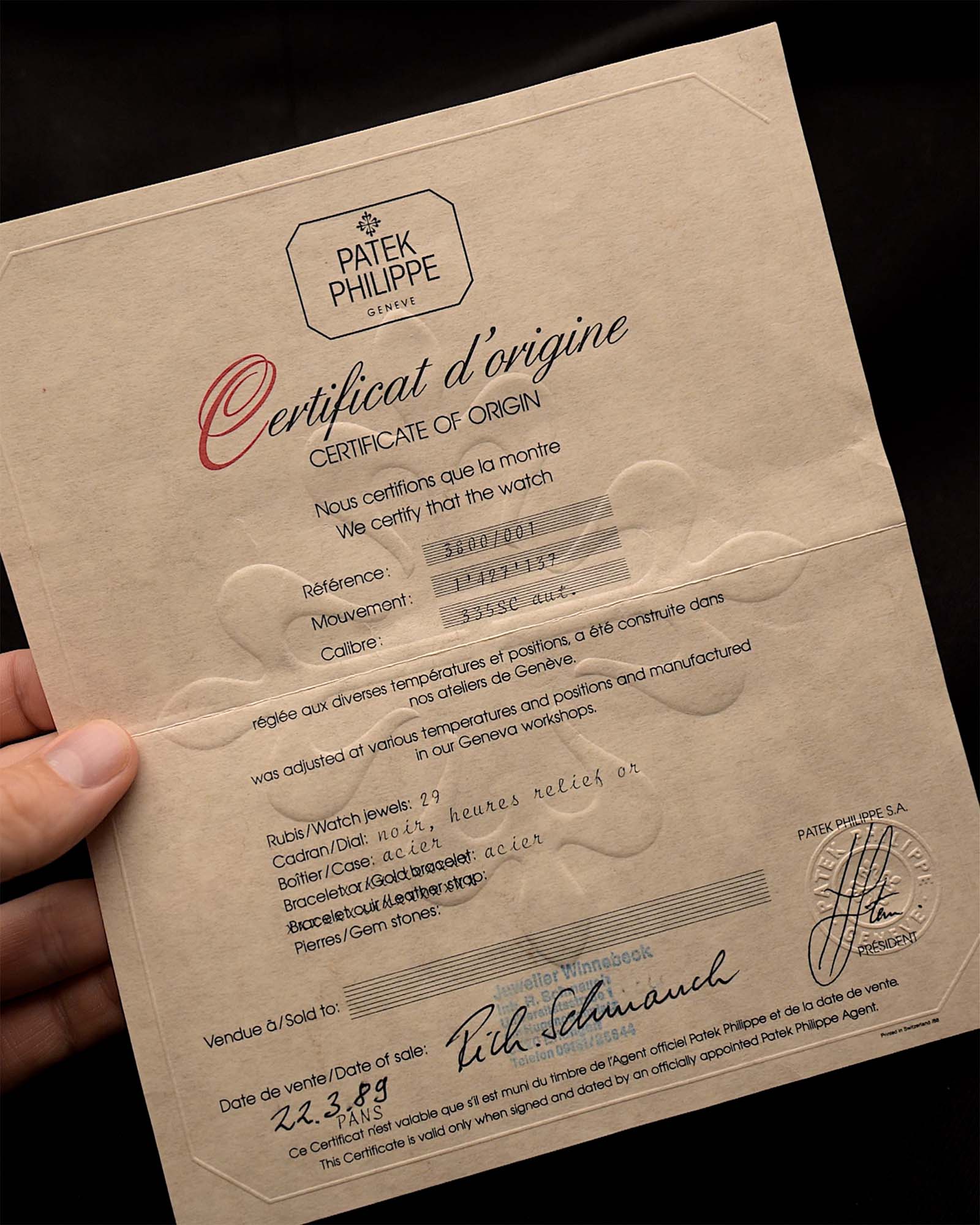 Das Besondere an diesem Stück ist das Originalzertifikat von Patek Philippe, das bestätigt, dass es erstmals im März 1989 bei einem deutschen Juwelier in Erlangen verkauft wurde.