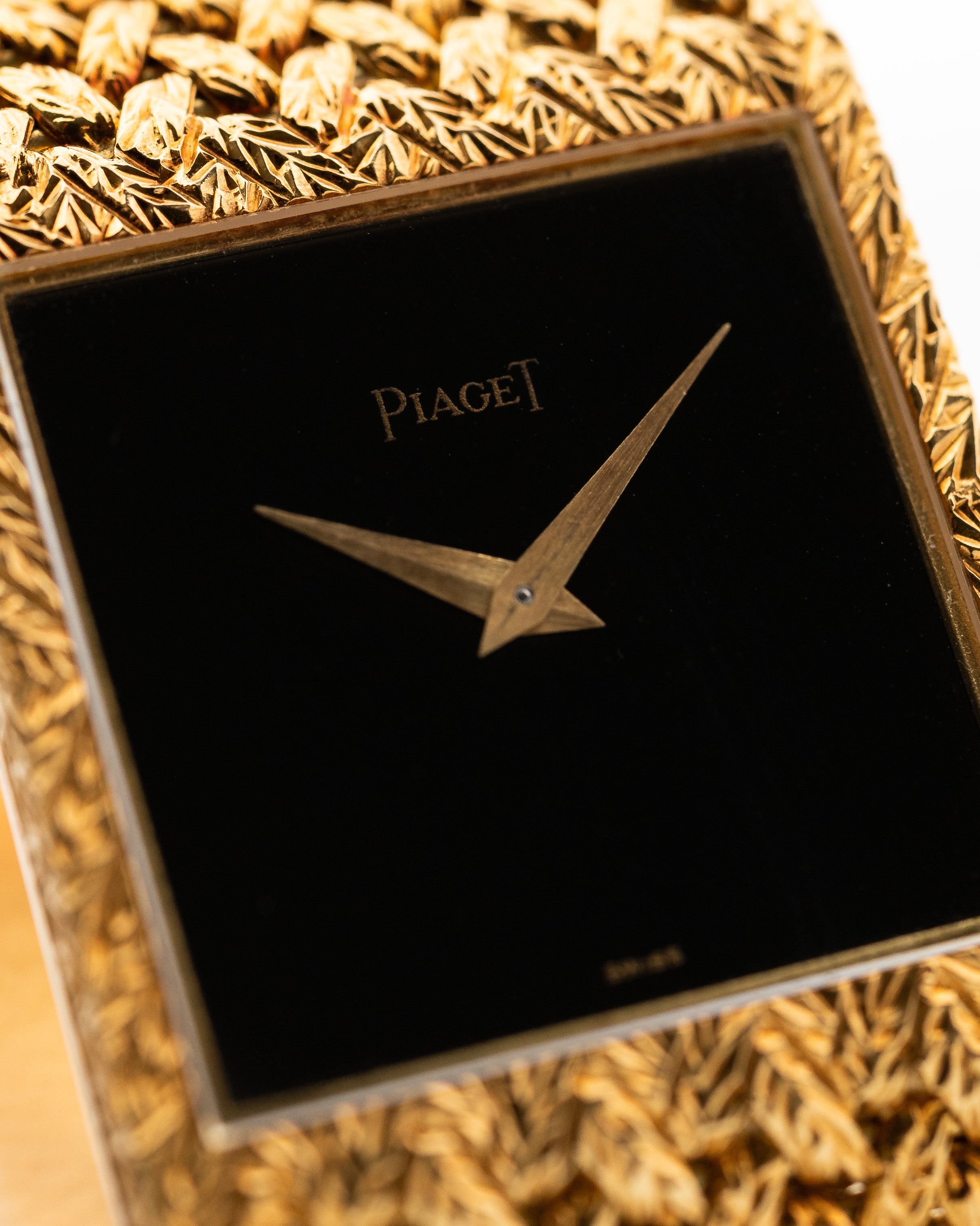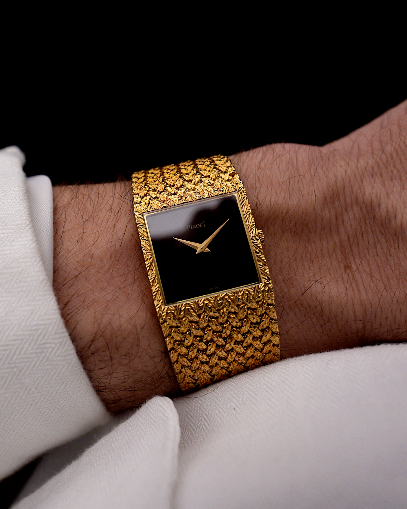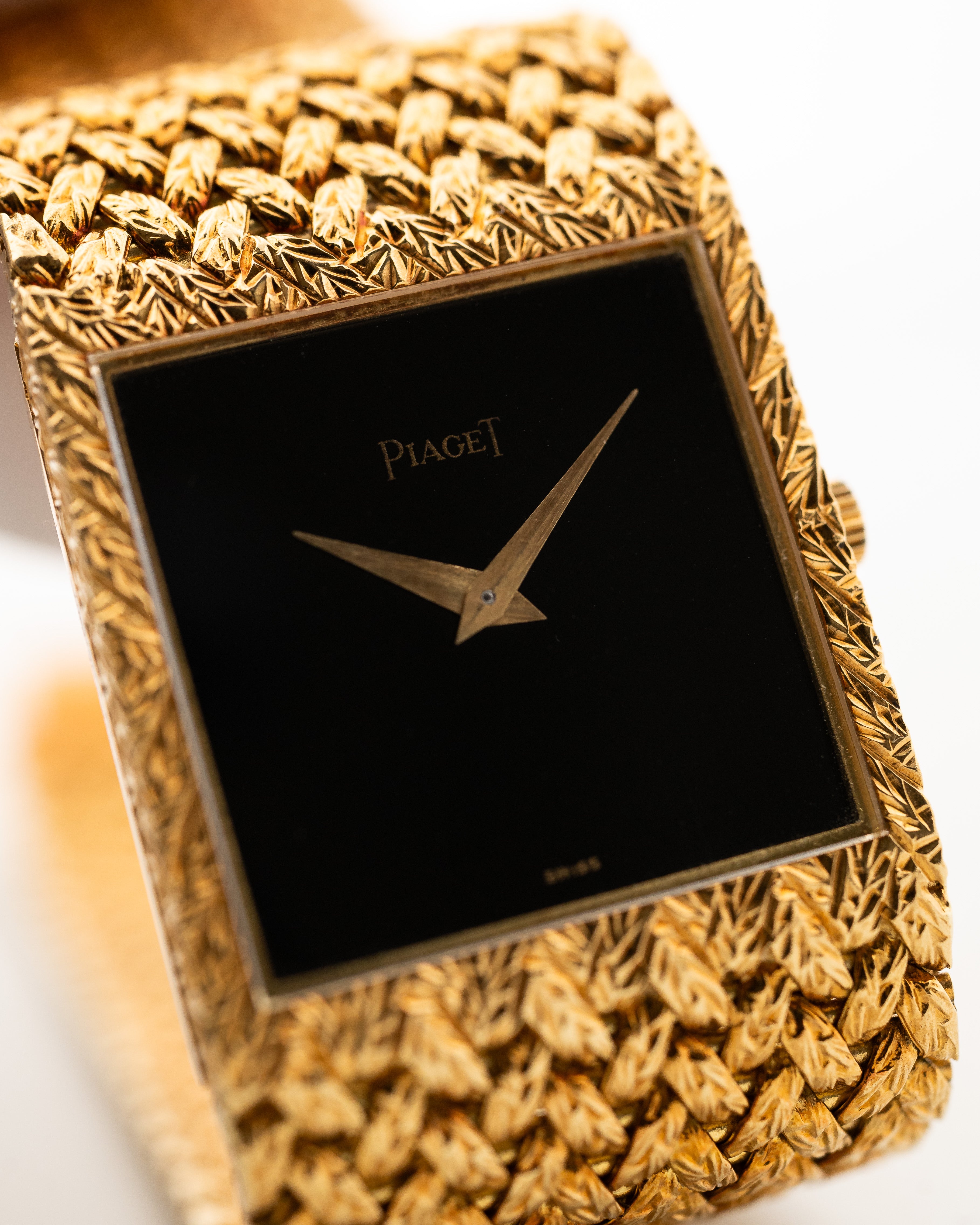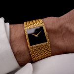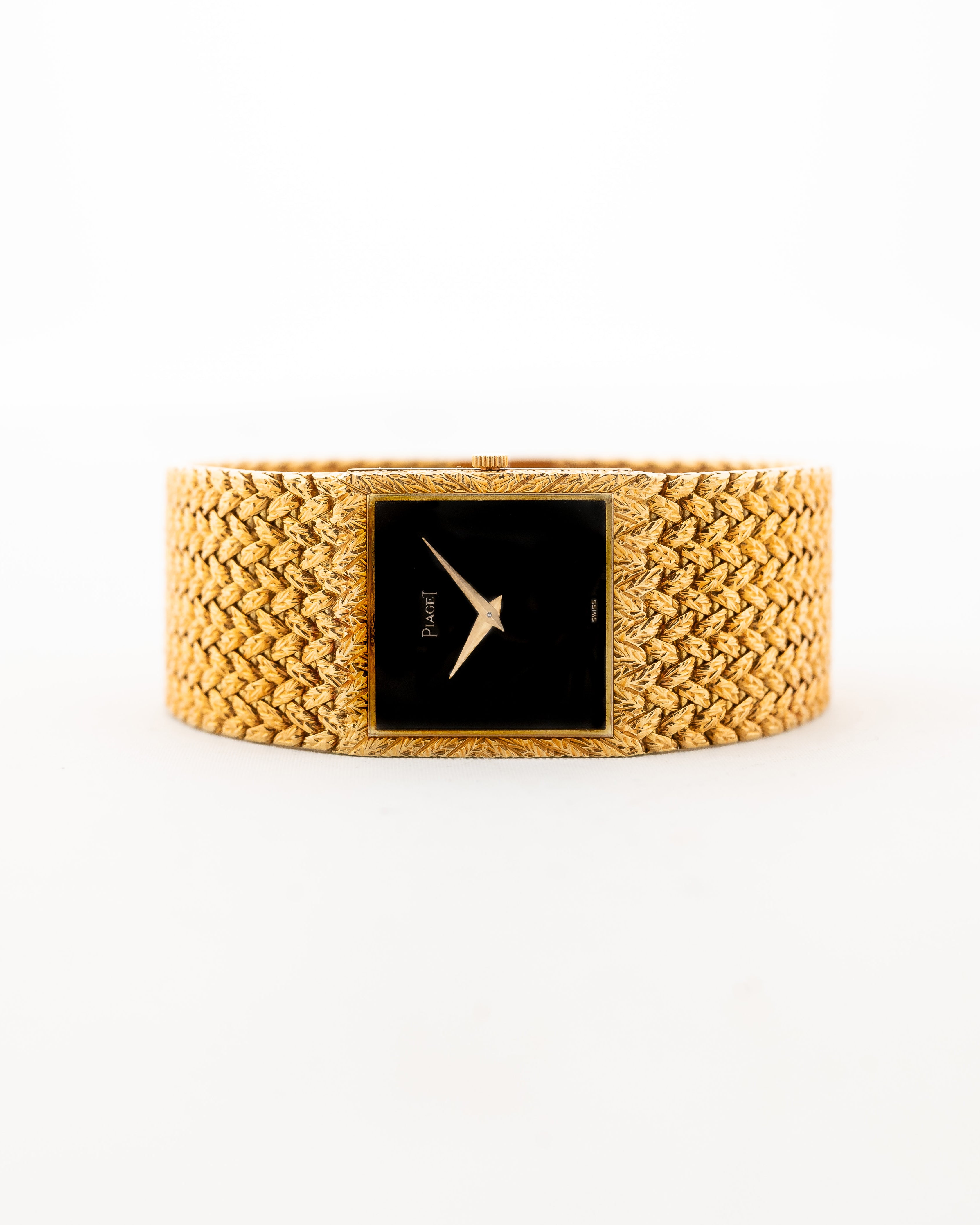 Diese Piaget hat uns auf den ersten Blick den Atem verschlagen. Diese geometrischen Formen in Kombination mit dem geflochtenen Armband aus 18 Karat Gelbgold, dem Onyx-Zifferblatt, dem Alpha-Zeiger und dem klassischen Piaget-Logo sind wahre Kunst.