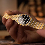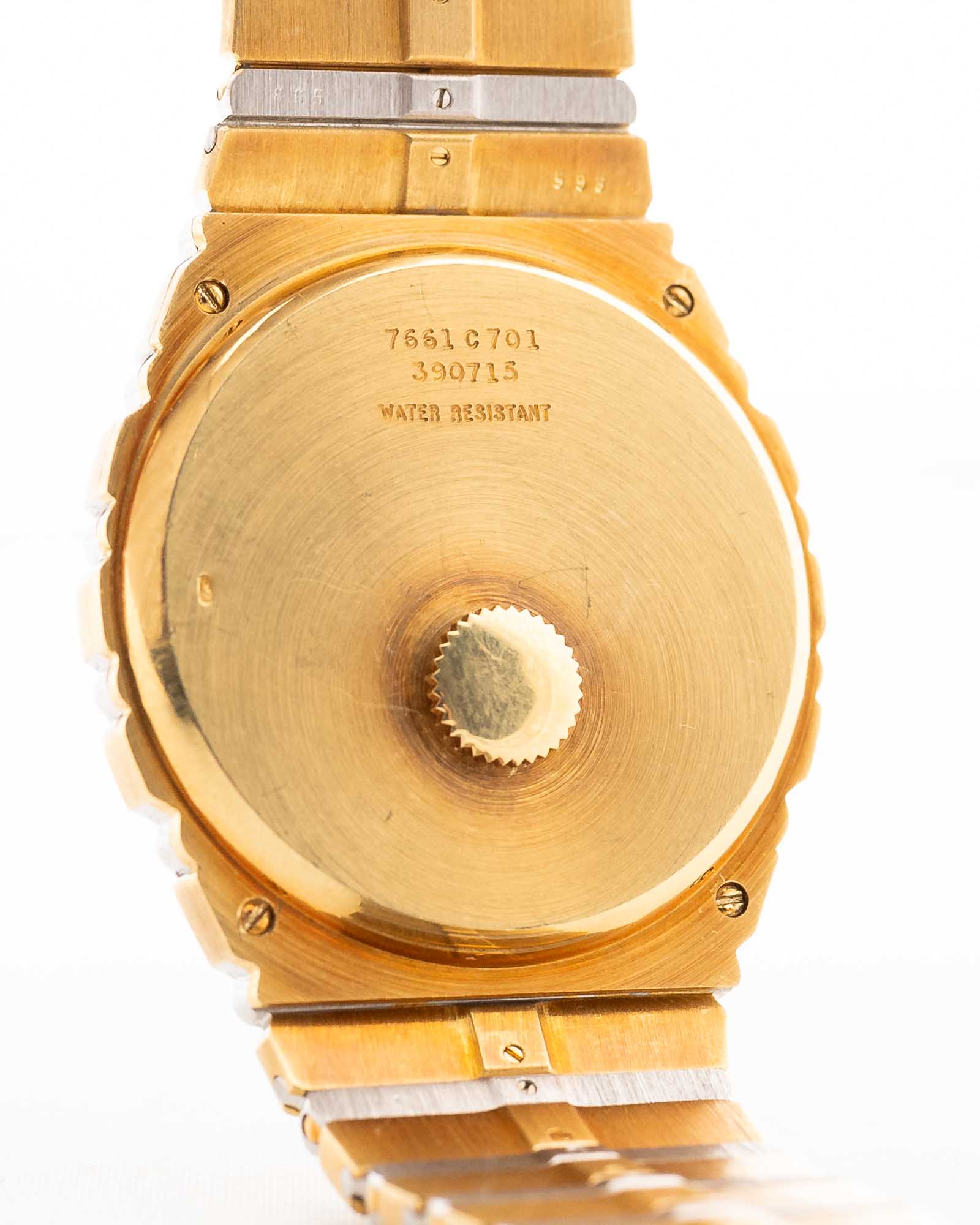 Die Piaget Polo Ref. 7661 C 701 ist der kühnste Ausdruck des Luxus der 1980er Jahre: eine34-mm-Jumbo-Version, vollständig aus 18 Karat Gelb- und Weißgold gefertigt, mit einem makellosen Zifferblatt aus Onyx, das ihr eine Opulenz verleiht, die selbst unter den Polo-Modellen selten zu finden ist.