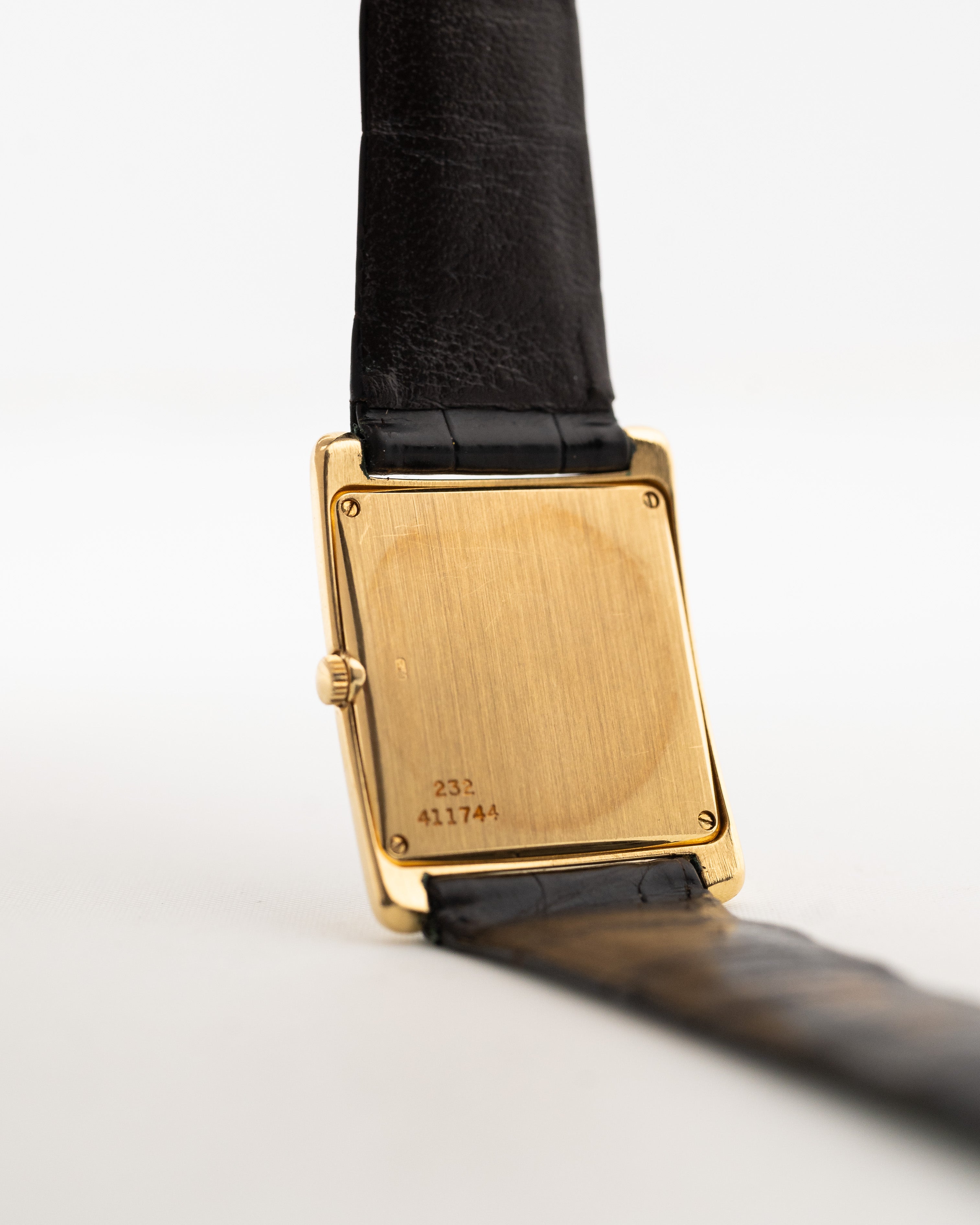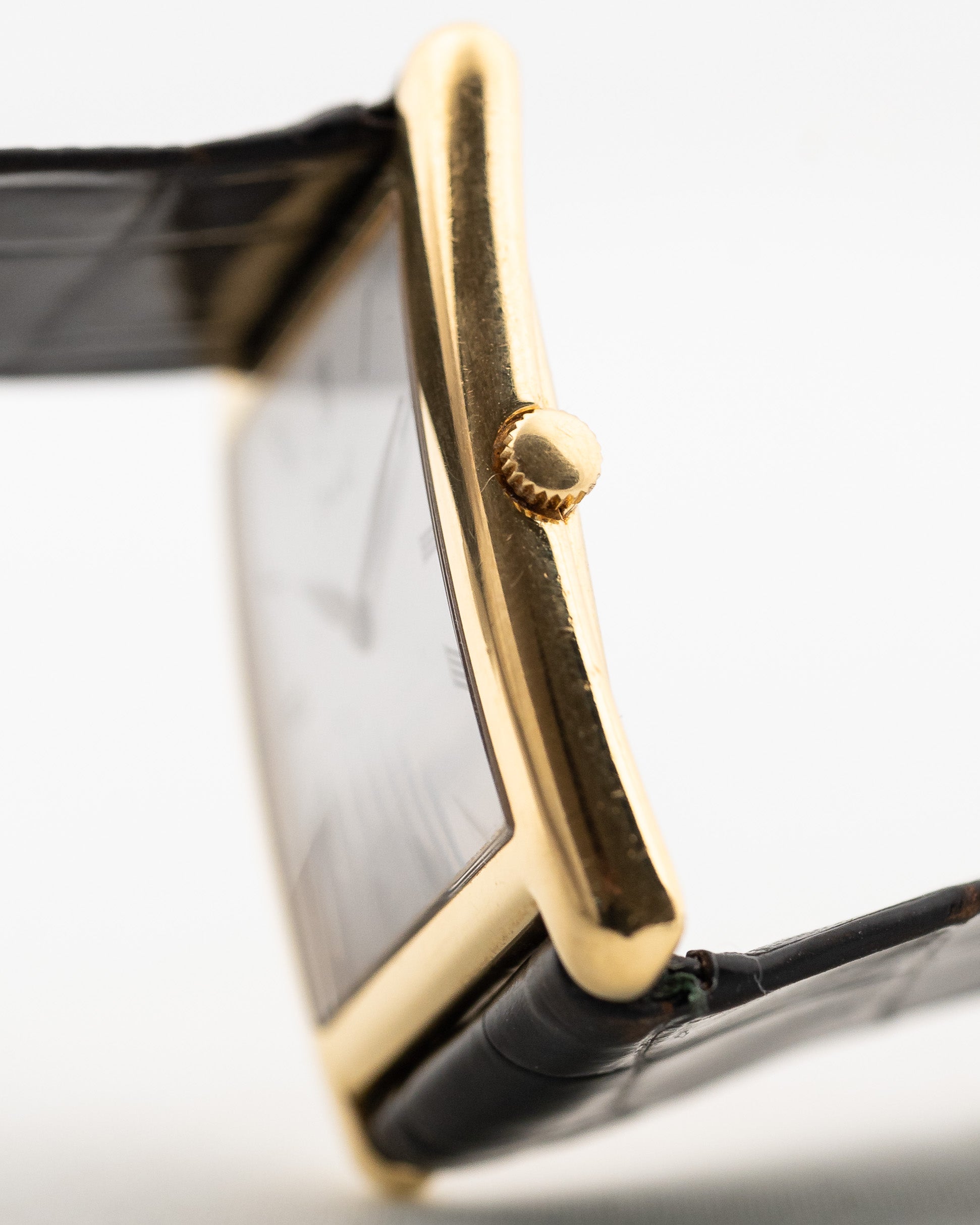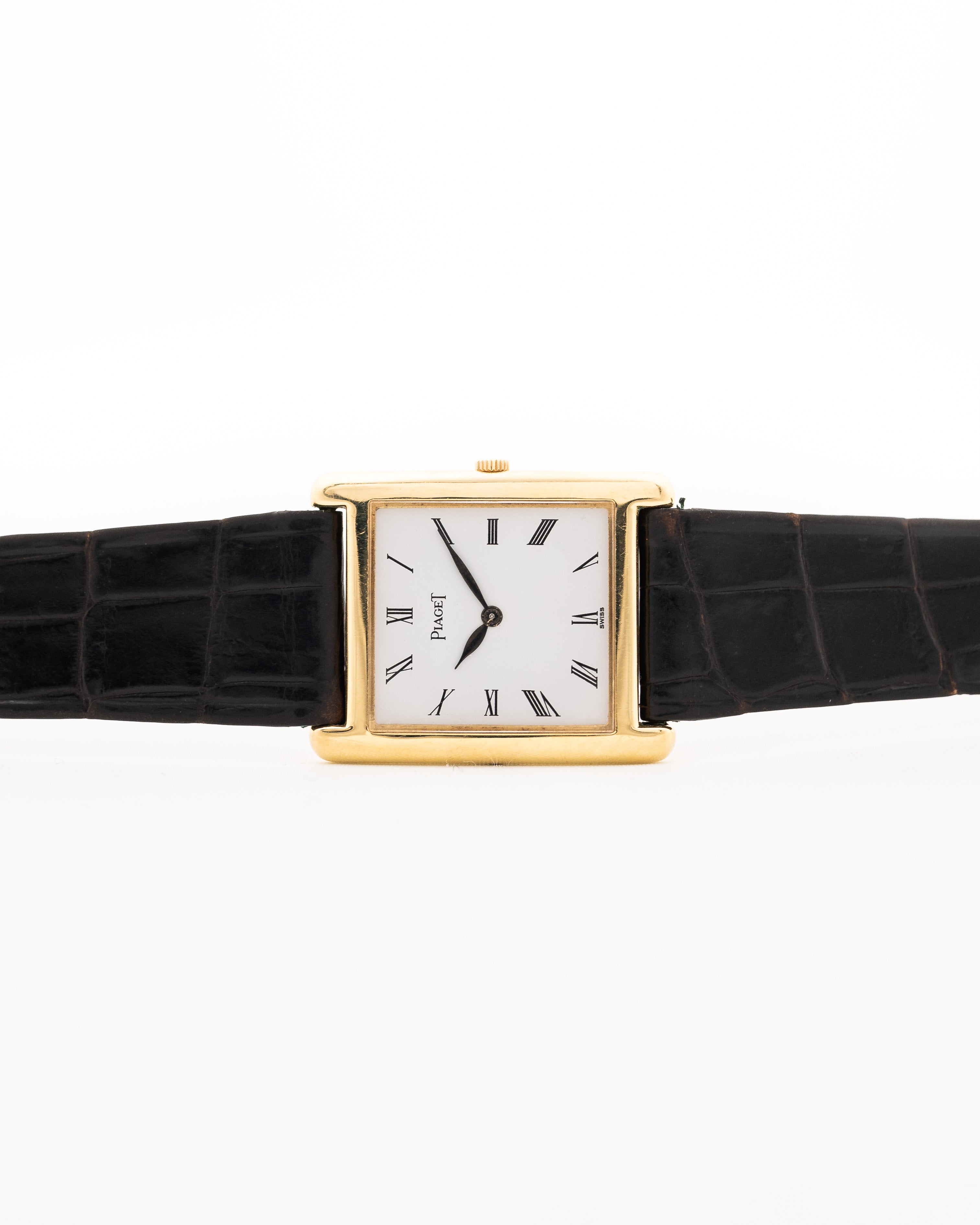 Unser Exemplar ist in unpoliertem Zustand mit dem originalen Piaget-Lederarmband und der 18k Gelbgoldschließe. Das Zifferblatt ist makellos und die Form des Panzergehäuses ist wirklich klassisch und zeitlos.