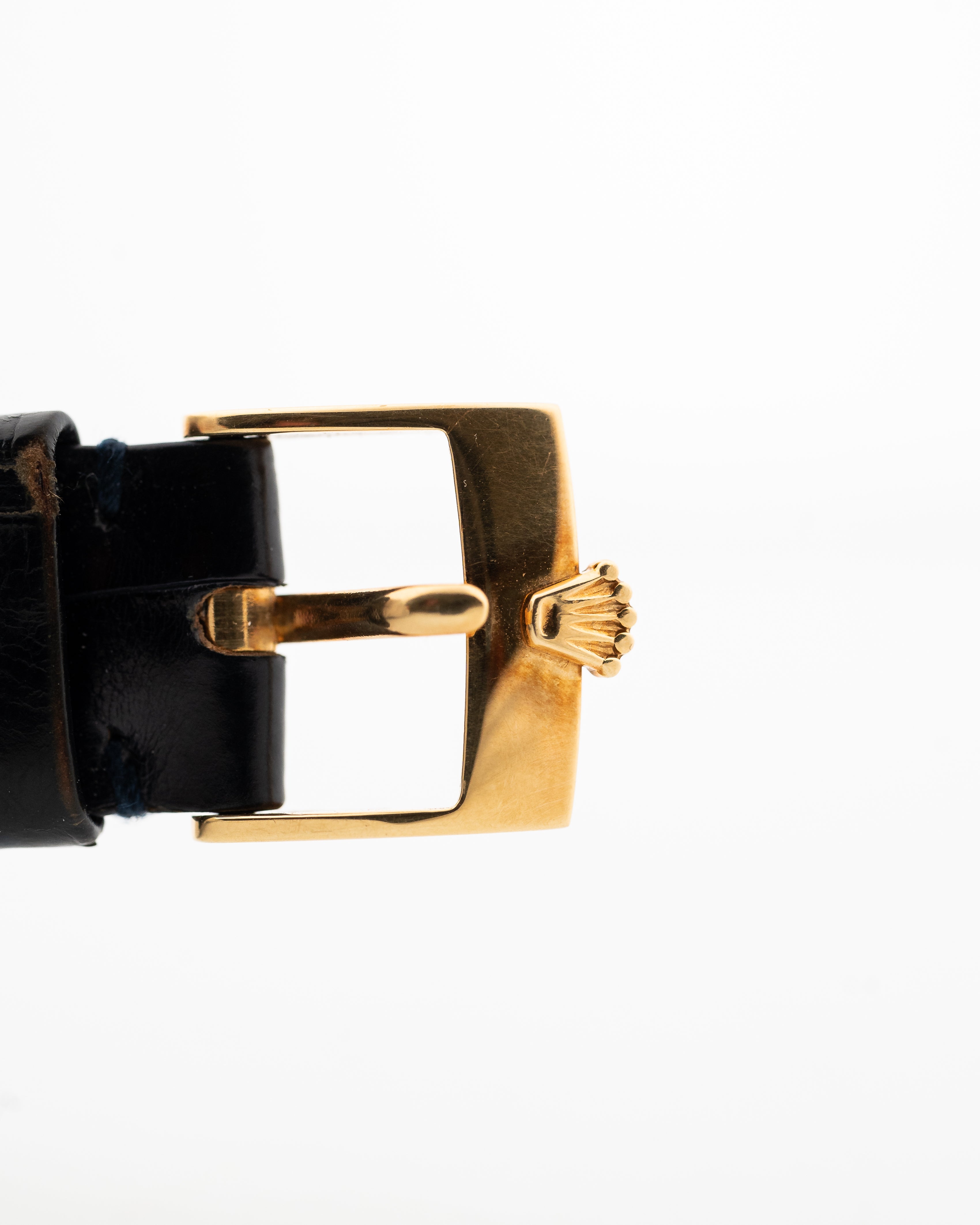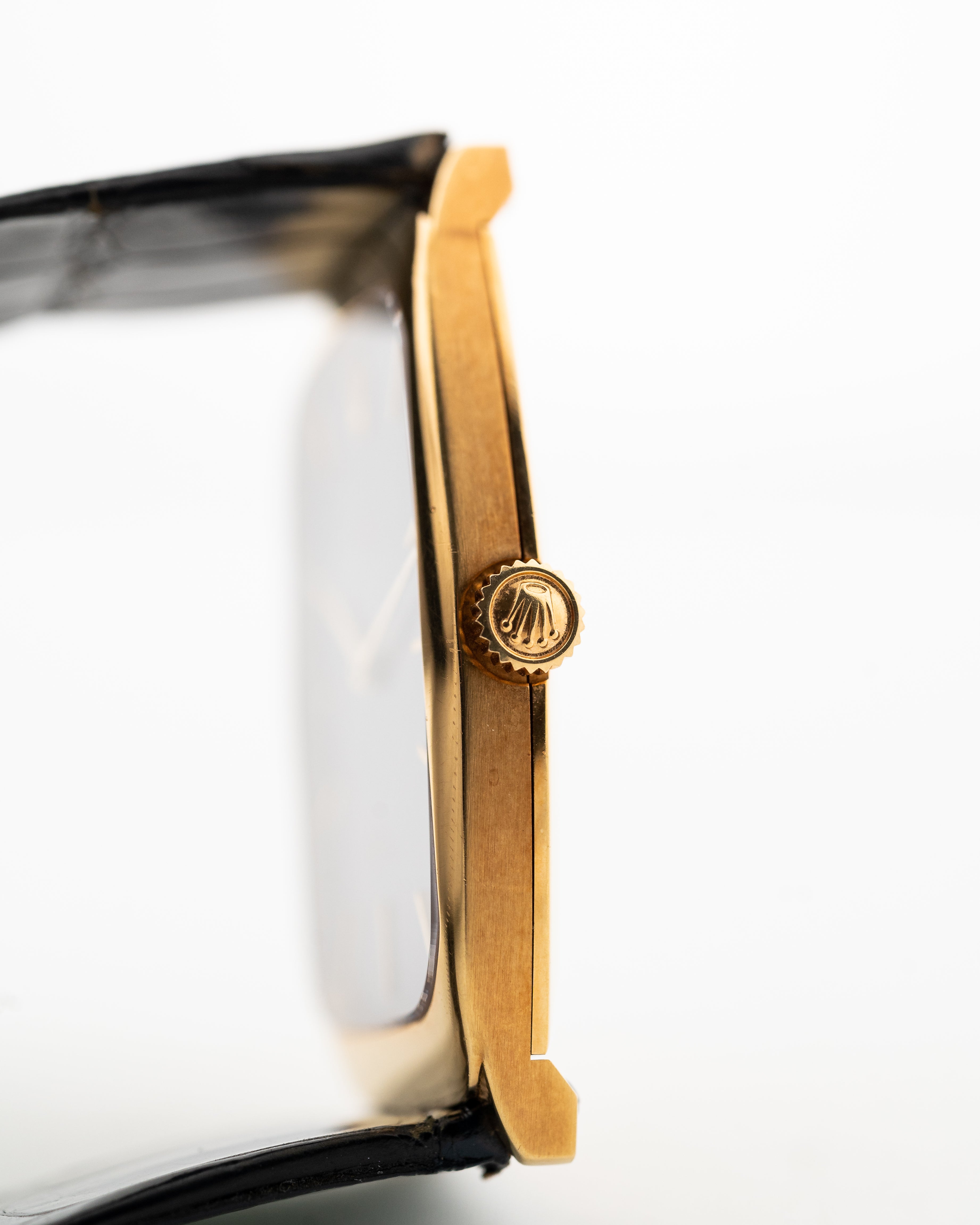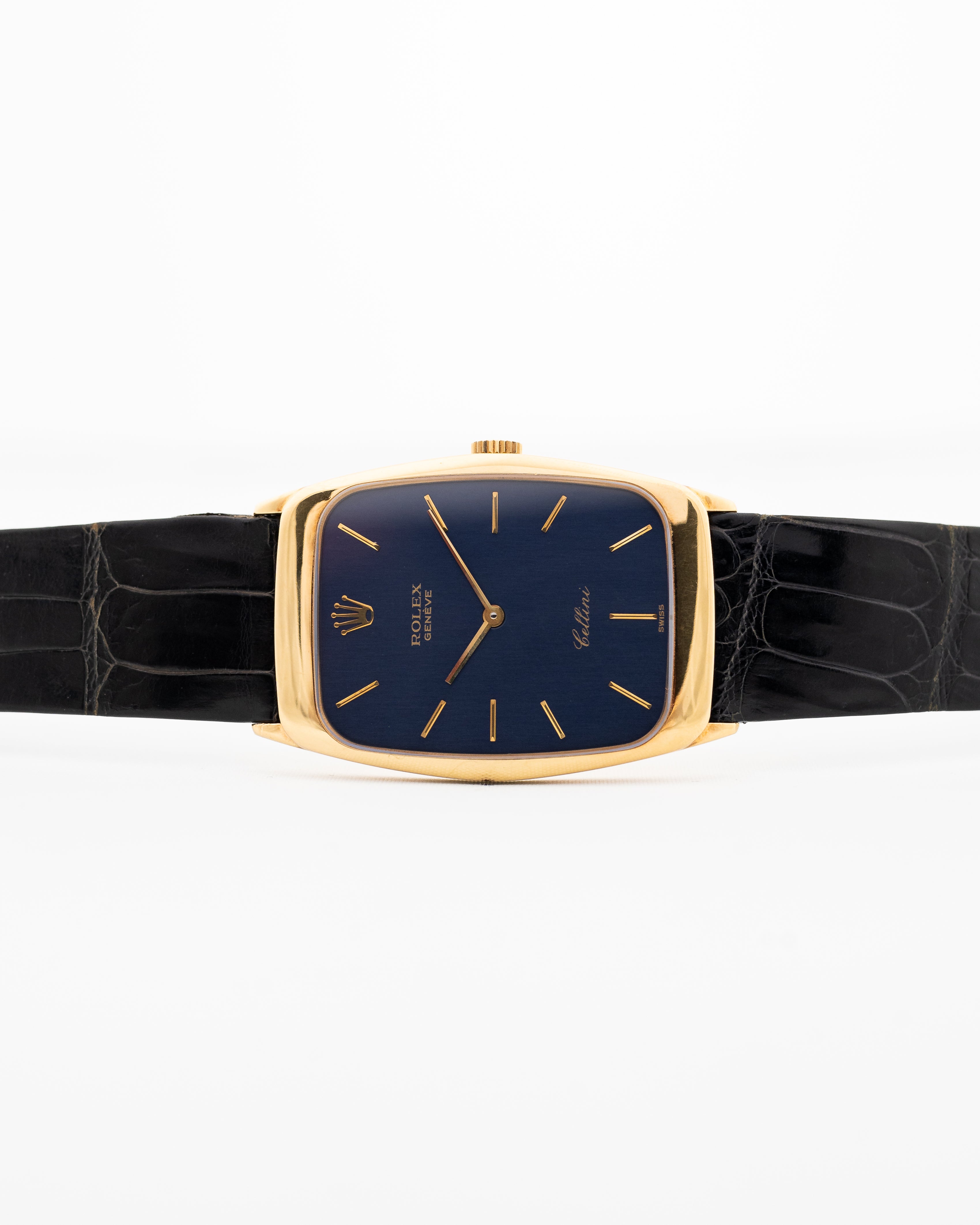 Die Rolex Cellini Linie zeigt die elegantere Seite von Rolex im Vergleich zu seinen bekannteren Sportmodellen. Diese Version ist in einem tonneauförmigen Gehäuse aus 18k-Gelbgold untergebracht, eine ungewöhnliche Gehäuseform für Rolex.