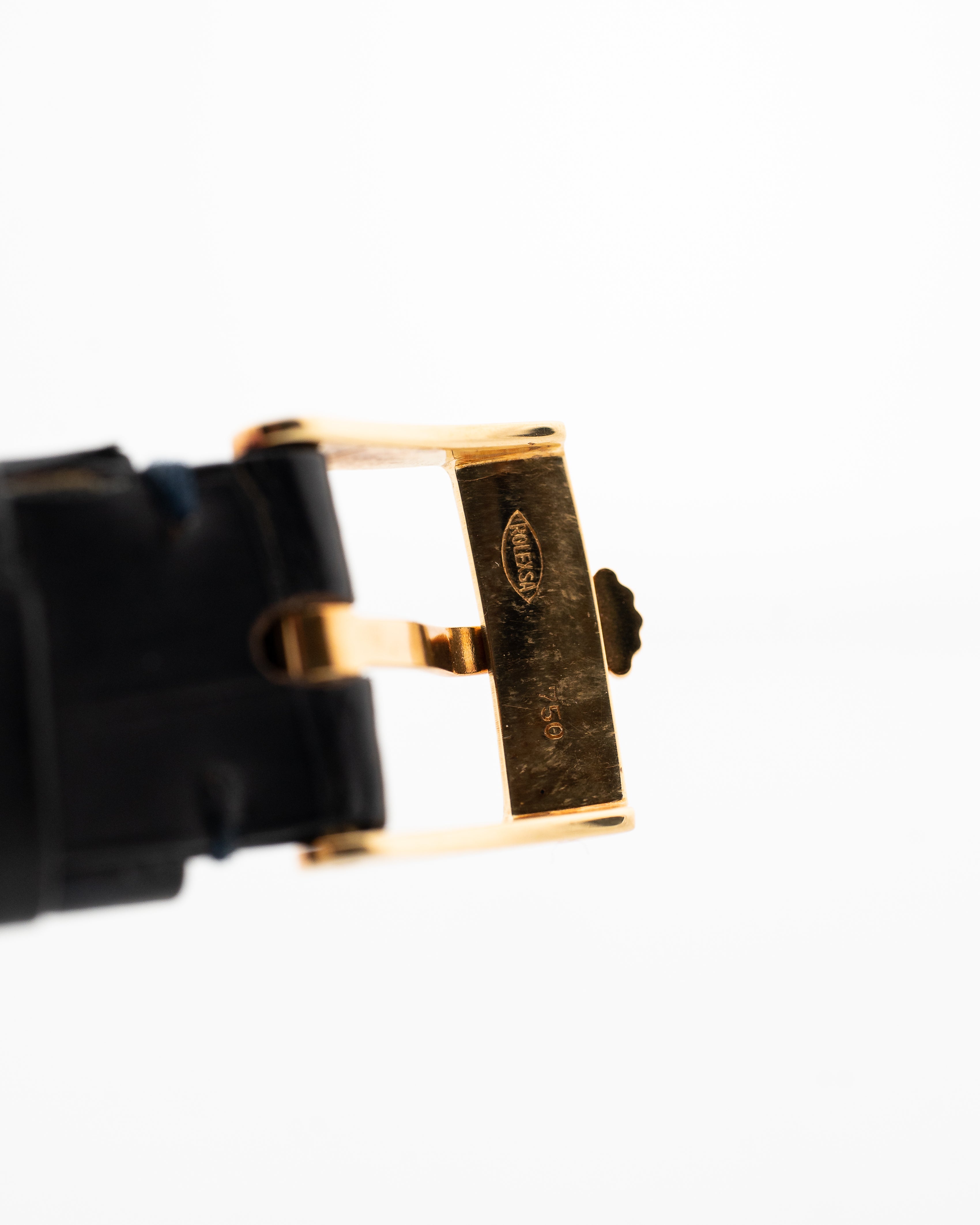 Die sehr seltene Farbe des Zifferblatts ist ein tiefes Blau, das in dieser Ära nicht sehr populär für Anzuguhren war. Dieses Modell ist sehr vielseitig, da es sowohl in legeren als auch in eleganten Anlässen getragen werden kann.