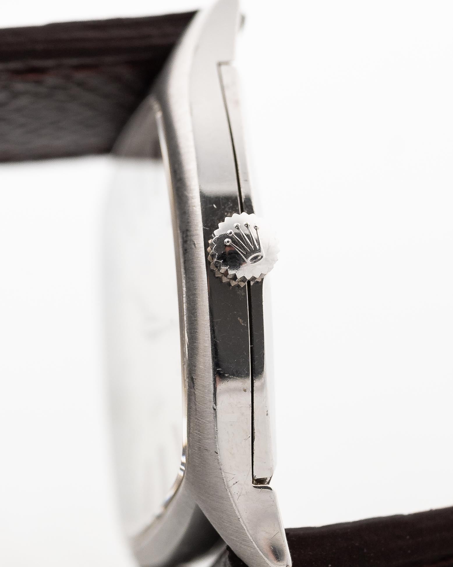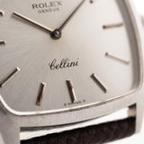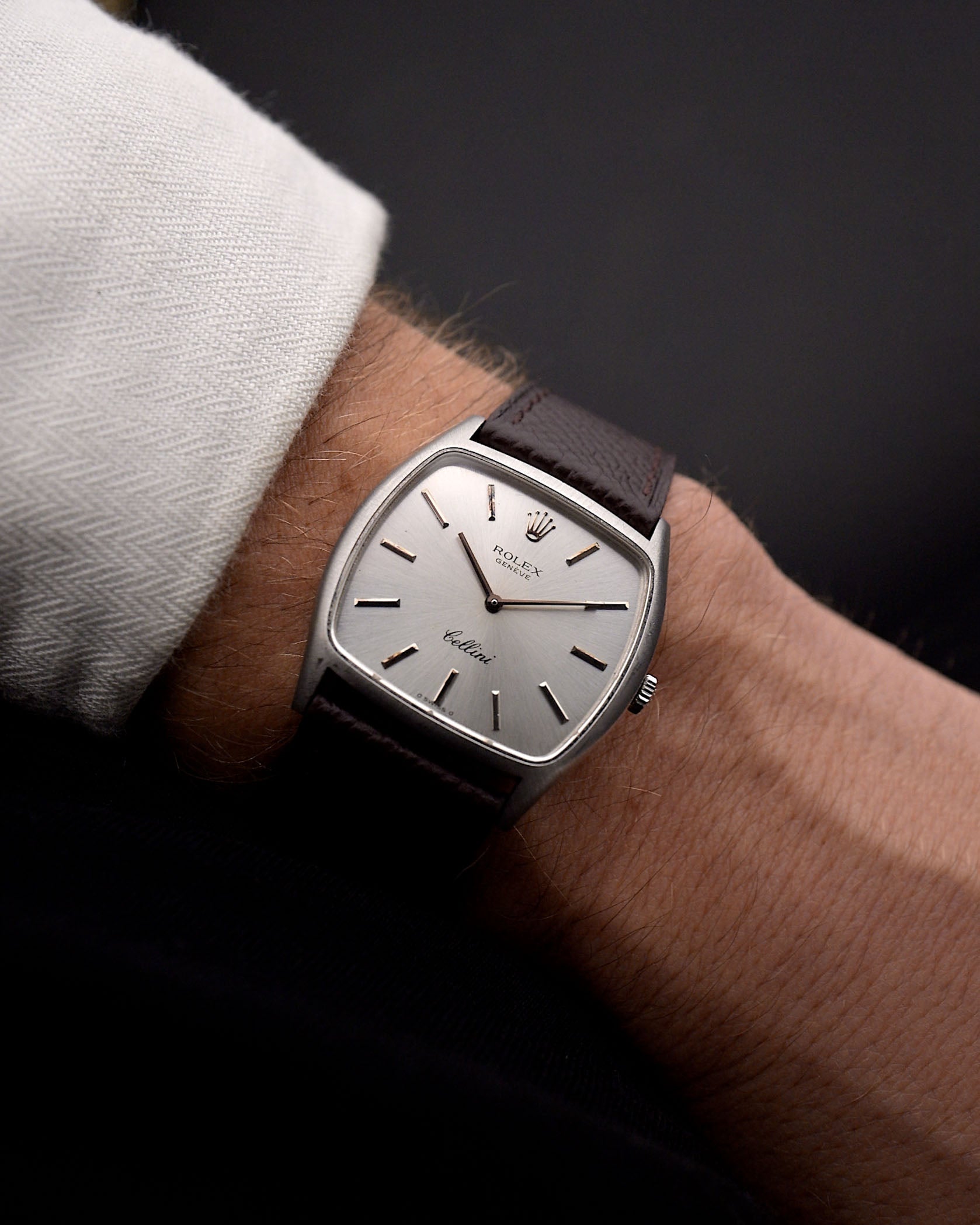 Die Rolex Cellini Linie zeigt die elegantere Seite von Rolex im Vergleich zu seinen bekannteren Sportmodellen. Diese Version ist in ein quadratisches Gehäuse aus 18 Karat Weißgold eingepasst, eine ungewöhnliche Gehäuseform für Rolex.