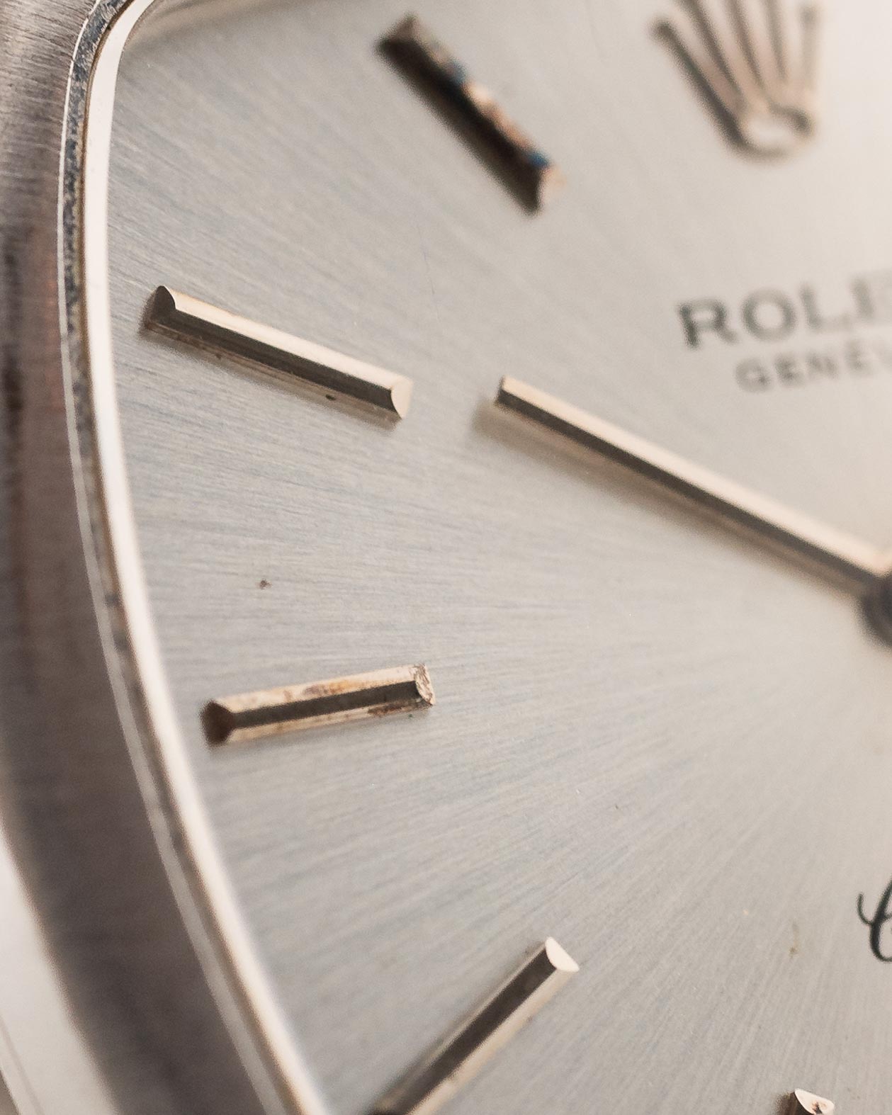 Dieses Modell ist sehr vielseitig, denn es kann sowohl in legeren als auch in eleganten Anlässen getragen werden. Das Sigma am unteren Rand des Zifferblatts weist darauf hin, dass die Indexe und Zeiger ebenfalls aus 18 Karat Weißgold gefertigt sind. Das silberfarbene Zifferblatt mit Sonnenschliff bildet einen schönen Kontrast zur matten Lünette. Sie wird mit dem originalen Rolex Zertifikat von 1979 geliefert.