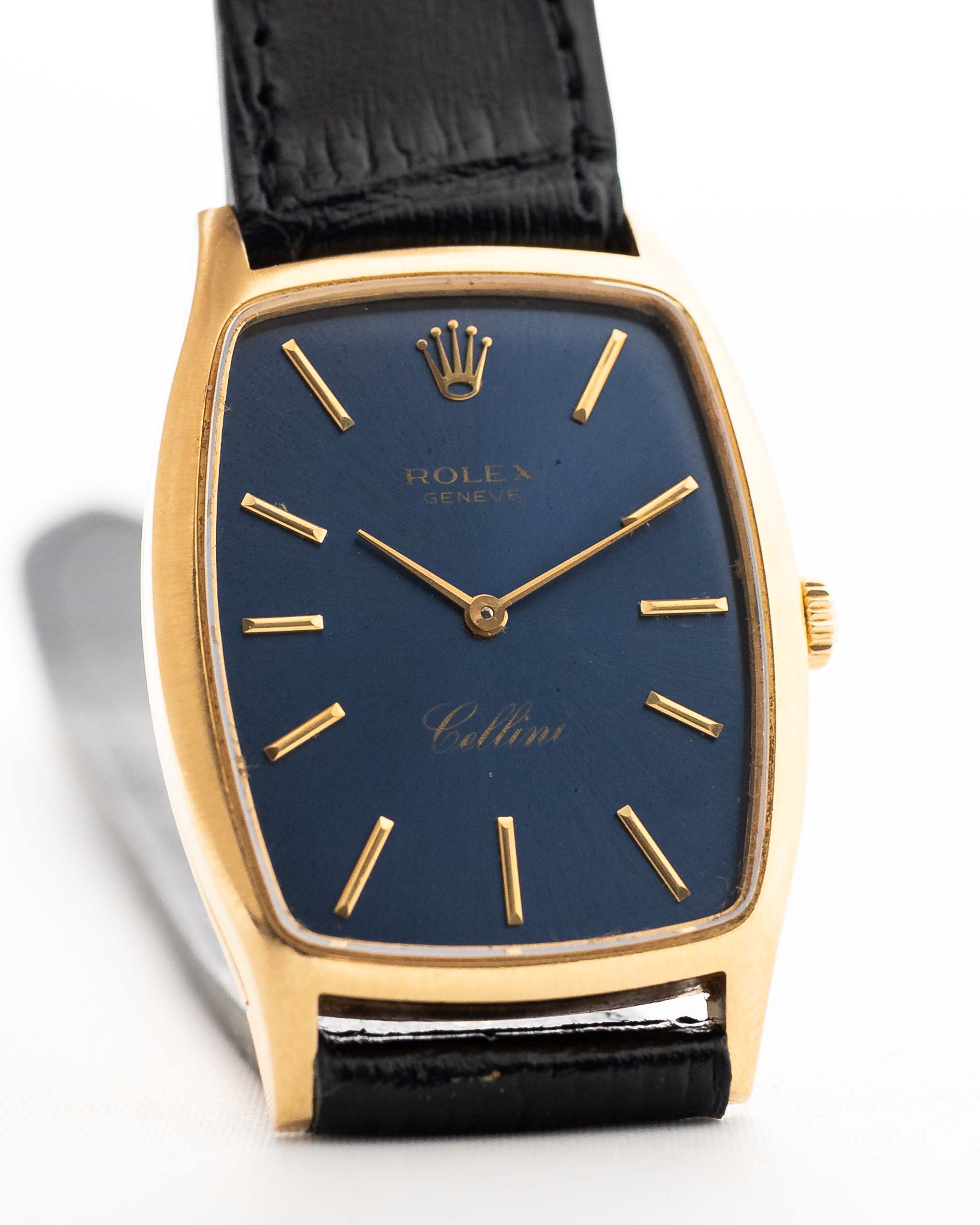 This Ref. 3807 from 1973 is a perfect embodiment of that philosophy. Its 18k yellow gold tonneau case, crafted by famed case maker Fabior (Olivier Judas), frames a deep blue dial that’s untouched — a striking contrast to the gold hands and applied hour markers. The minimalist design is elevated by the signature Rolex crown at 12 o’clock.