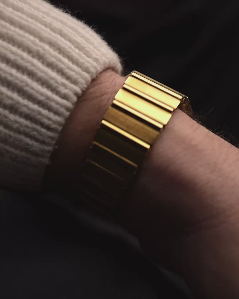 Dieses besondere Stück aus dem Jahr 1966 zeichnet sich durch seine geriffelte Lünette und Krone aus Gelbgold, ein stabiles Gehäuse mit scharfen Kanten und ein herausragendes Tortenzifferblatt in einem seltenen goldbraunen Farbton aus.