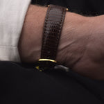 Klassische Vintage Uhr am Handgelenk getragen über Vintage Uhren und Luxusuhren auf einem Schreibtisch.