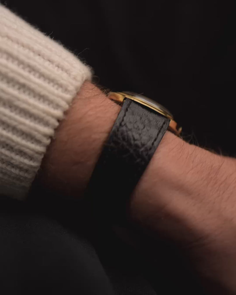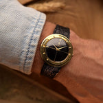 Crafted in 18k yellow gold, the 34 mm case floats effortlessly on the wrist with its ultra-slim profile and wide polished bezel. The minimalist black dial, free of superfluous text or decoration, highlights Universal Genève’s sophisticated restraint. It’s a design that feels as modern today as it did in the 1950s.