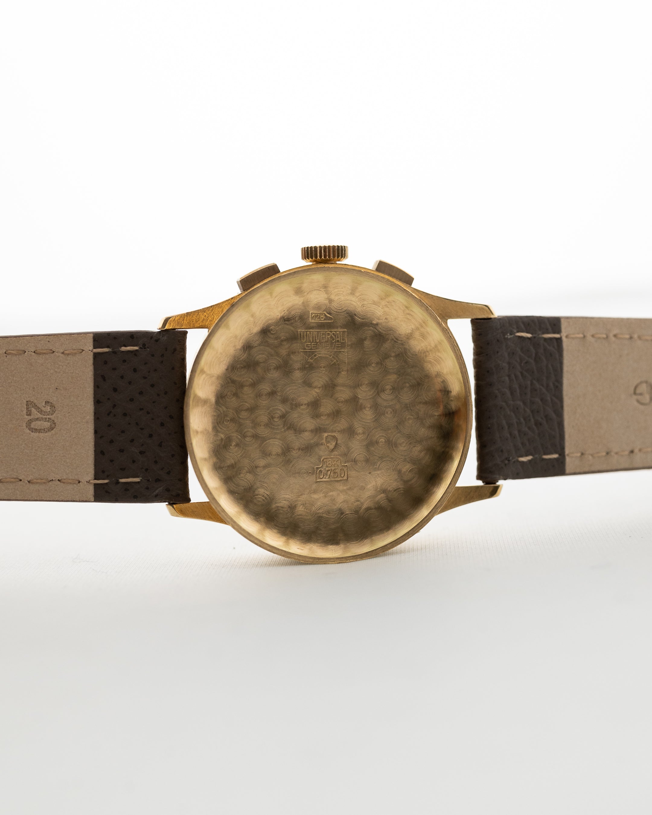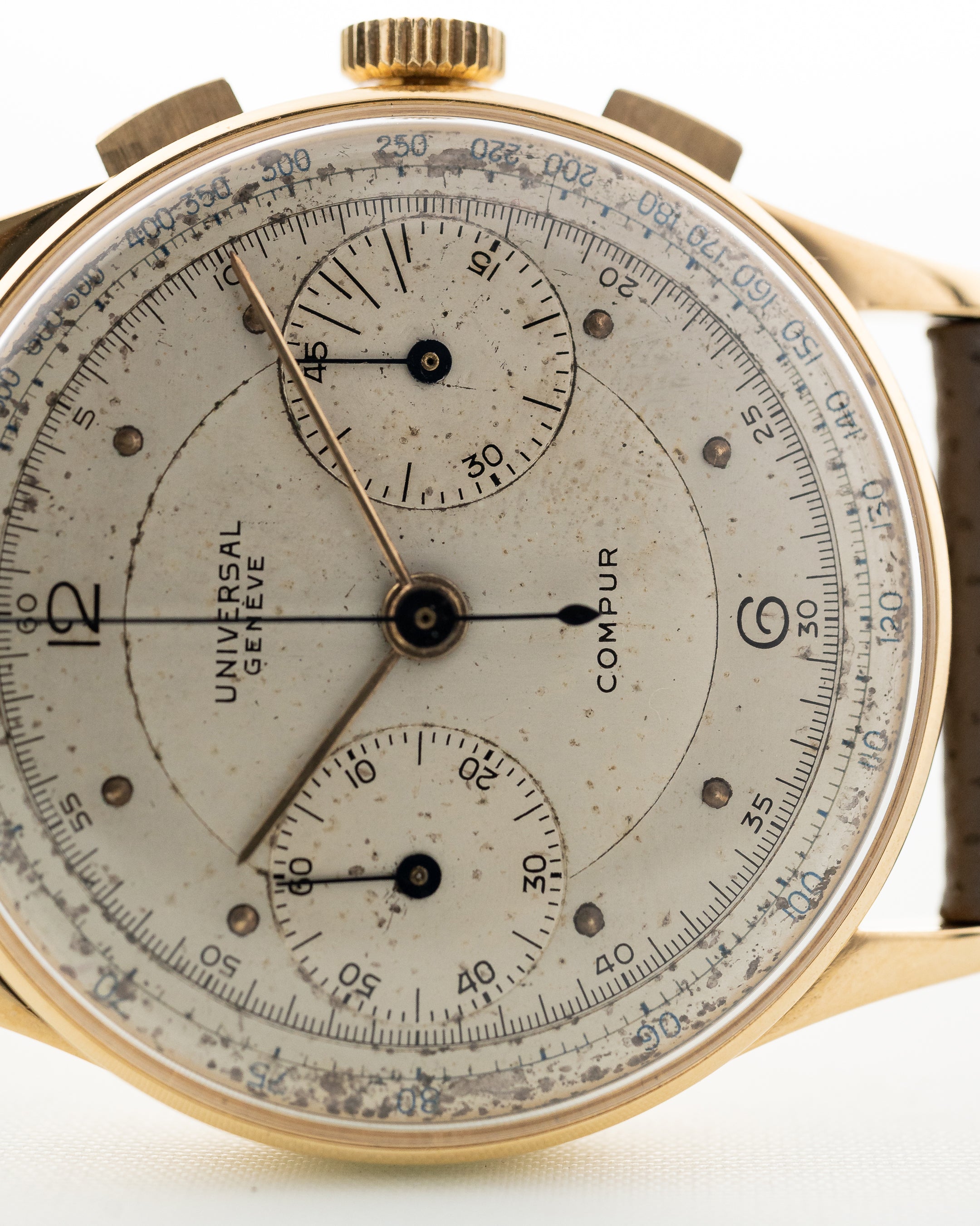 Diese Universal Geneve Compur ist ein fantastisches Beispiel dafür, was der Hersteller in den 1940er Jahren so gut gemacht hat. Das kompakte Gehäuse aus 18 Karat Gelbgold mit quadratischen Drückern beherbergt das begehrte Uhrwerk Kaliber 285.