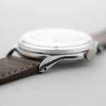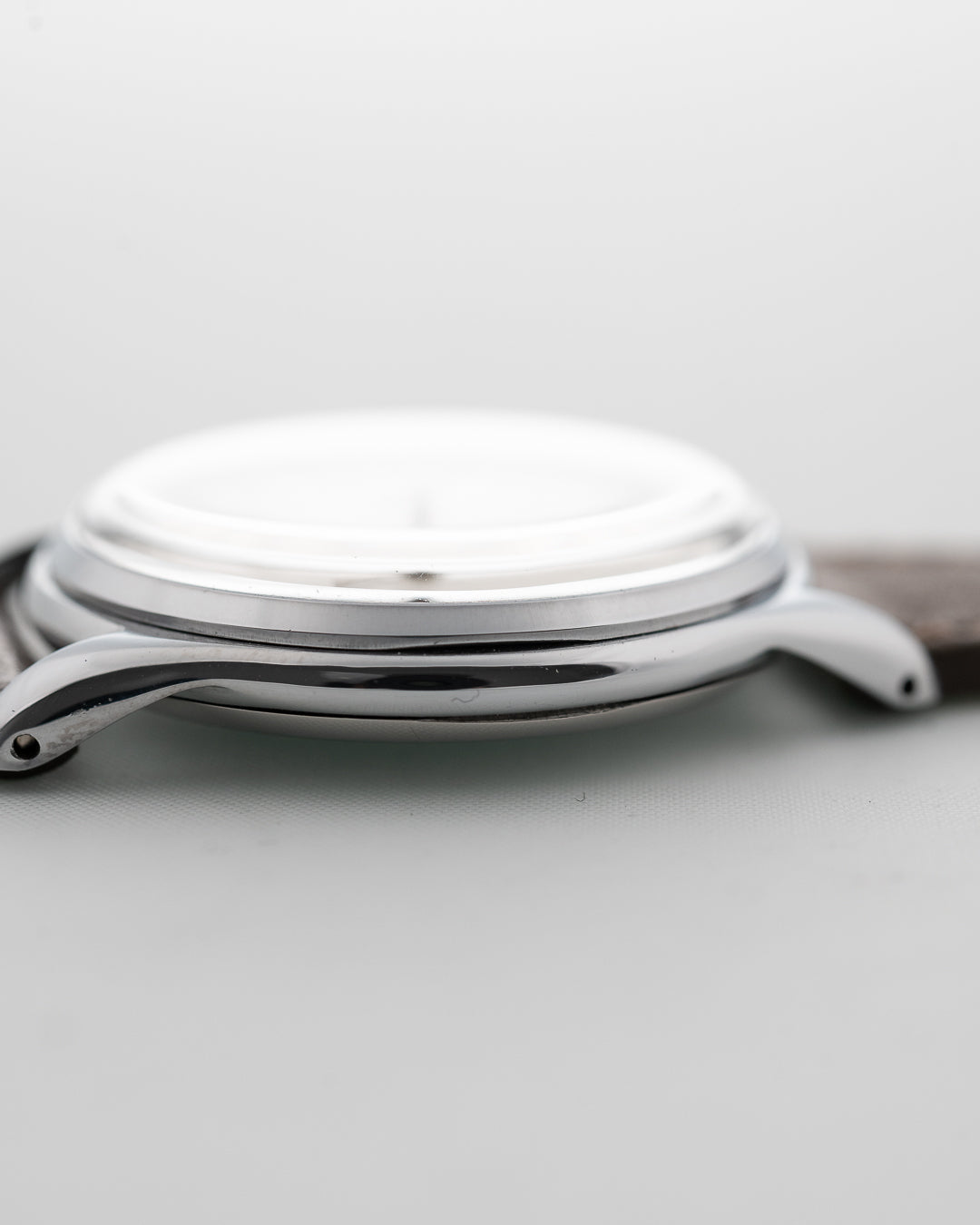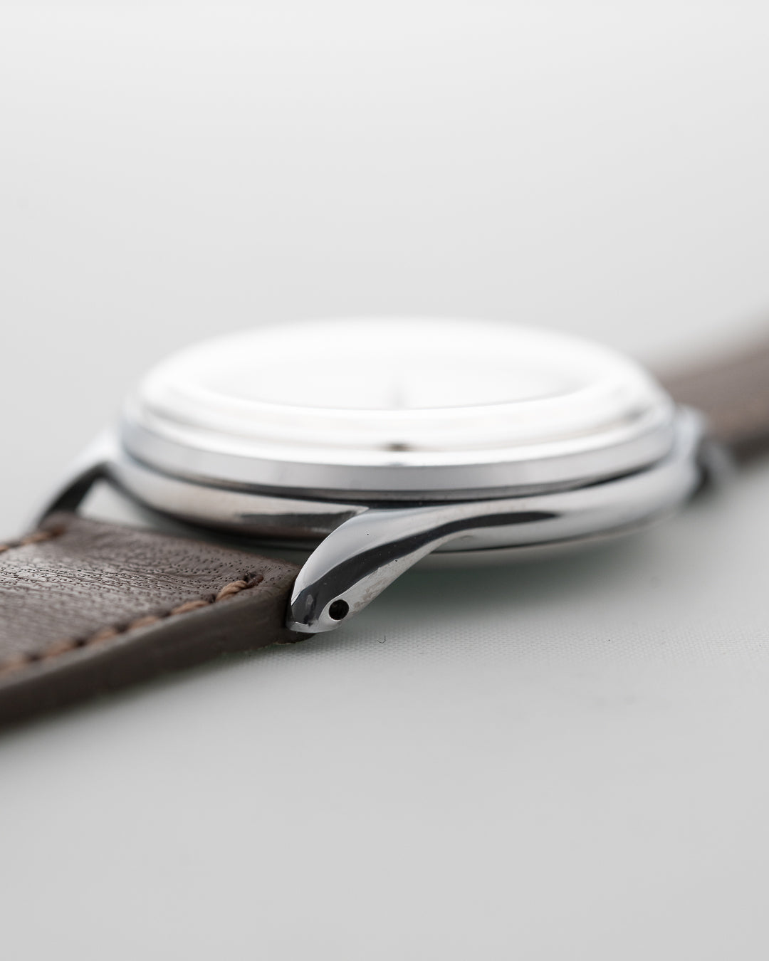 Ausgestattet mit einem 35 mm Stahlgehäuse, nach unten gedrehten Bandanstößen und einem wunderschönen silbernen Zifferblatt, ist diese Uhr wirklich unschlagbar. Das Zifferblatt ist wunderschön gealtert und verfügt über arabische Ziffern und einen blauen Sekundenzeiger, was diese Uhr noch einen Tick eleganter macht.