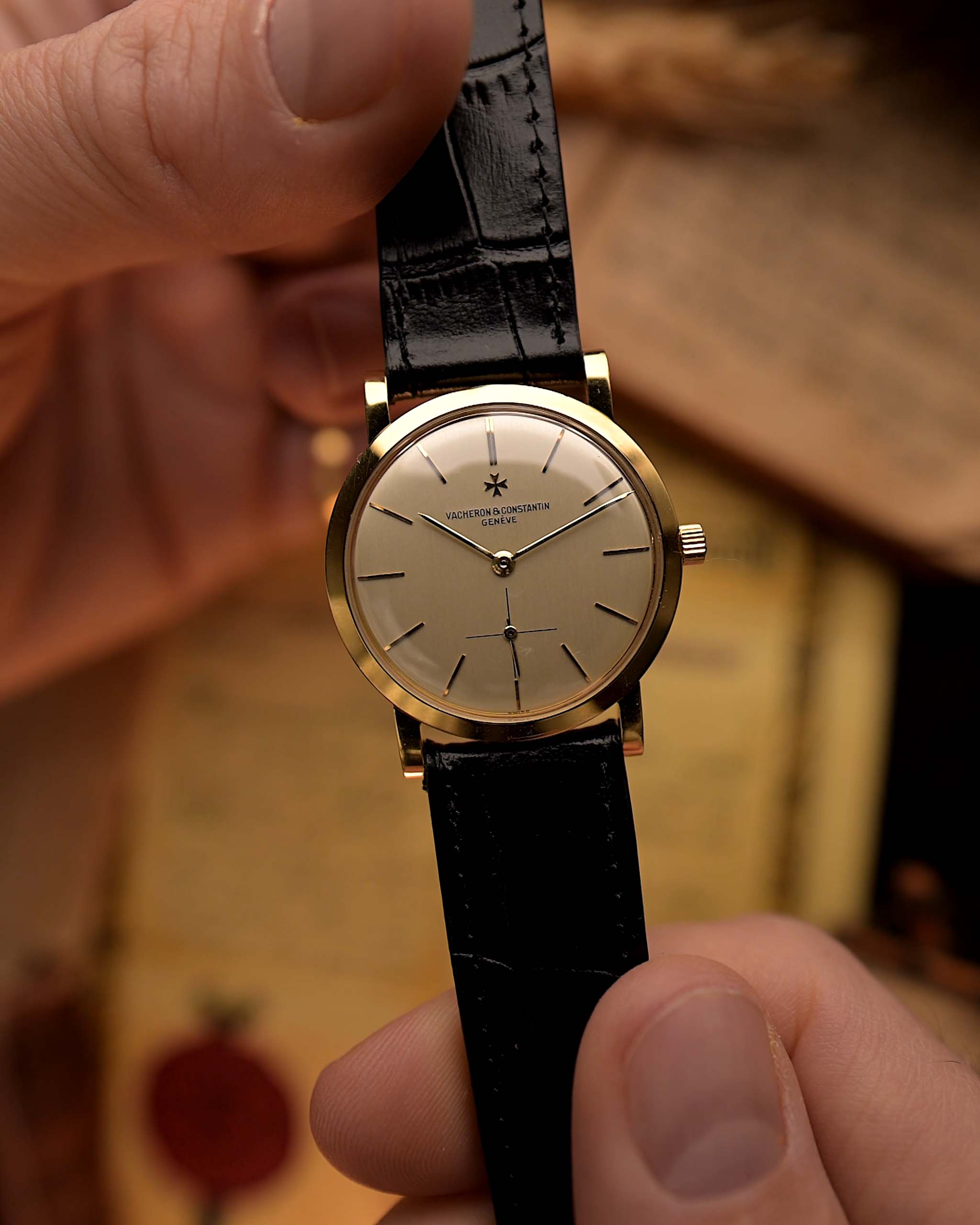 Vintage Vacheron Constantin Uhr 4667 Patrimony aus dem Jahr 1956, 32mm Gehäuse aus 18k Roségold, silbernes Zifferblatt, Handaufzugswerk, schwarzes Lederarmband am Handgelenk
