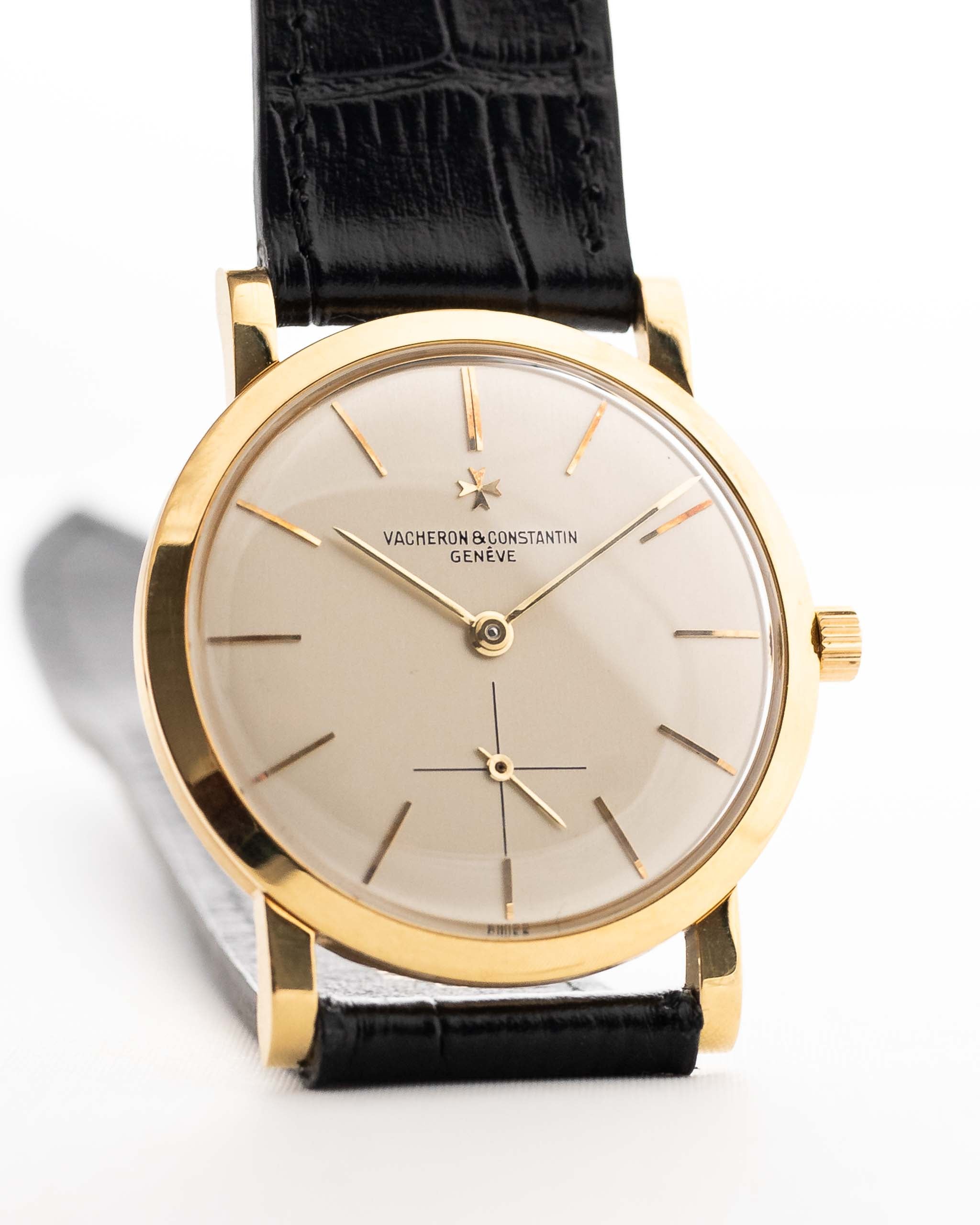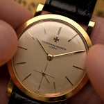 Vintage Vacheron Constantin 4667 Patrimony Uhr von 1956, 32mm Gehäuse aus 18k Roségold, silbernes Zifferblatt, Handaufzugswerk, schwarzes Lederband am Handgelenk