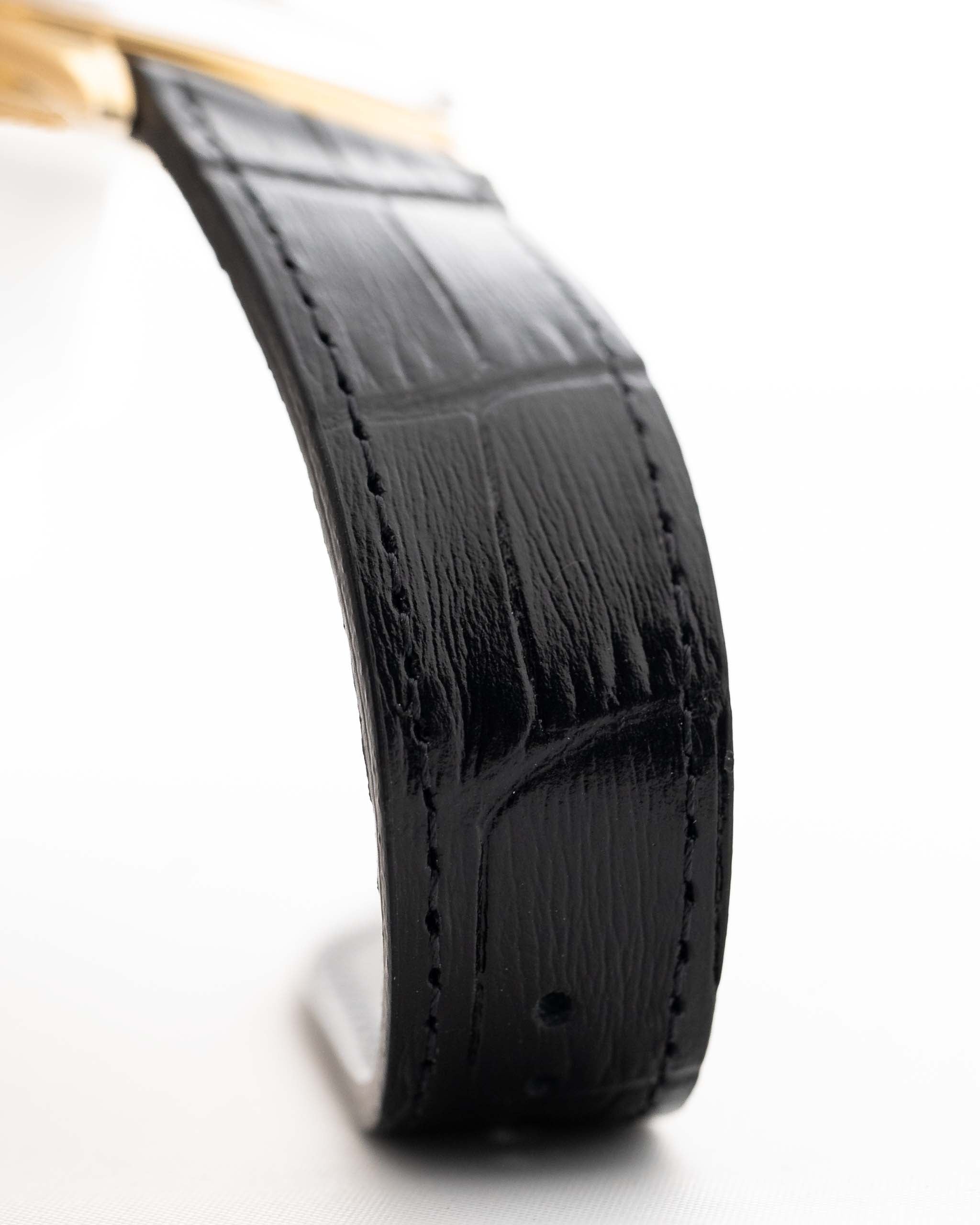 Crafted in 18k yellow gold, the case measures a generous 36mm, offering a perfect vintage proportion with contemporary wearability. The clean silver dial with gold hour markers and stick handset is a masterclass in minimalism, allowing the exquisite lines of the case to take center stage.