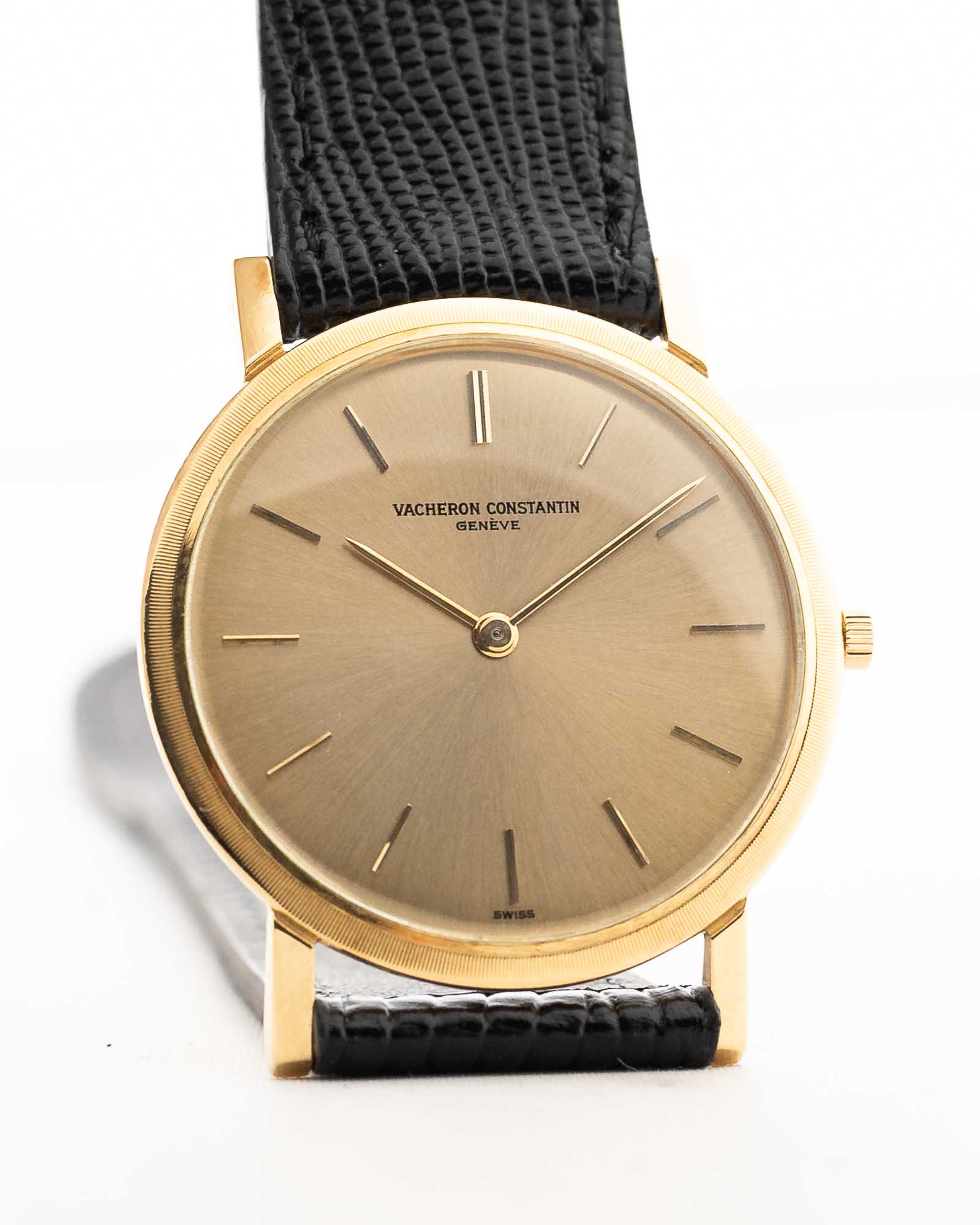 Eine elegante Vacheron Constantin Patrimony-Armbanduhr aus den 1960er Jahren, die sich durch ihr ultraflaches Gehäuse aus 18 Karat Gelbgold und ihre elegante Lünette mit Münzprägung auszeichnet. Das wunderschön erhaltene goldene Zifferblatt mit Sonnenschliff verfügt über Stabzeiger und Stundenmarkierungen, die einen subtilen und dennoch auffälligen Kontrast bilden und die Raffinesse der Mitte des Jahrhunderts verkörpern.