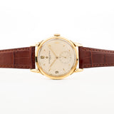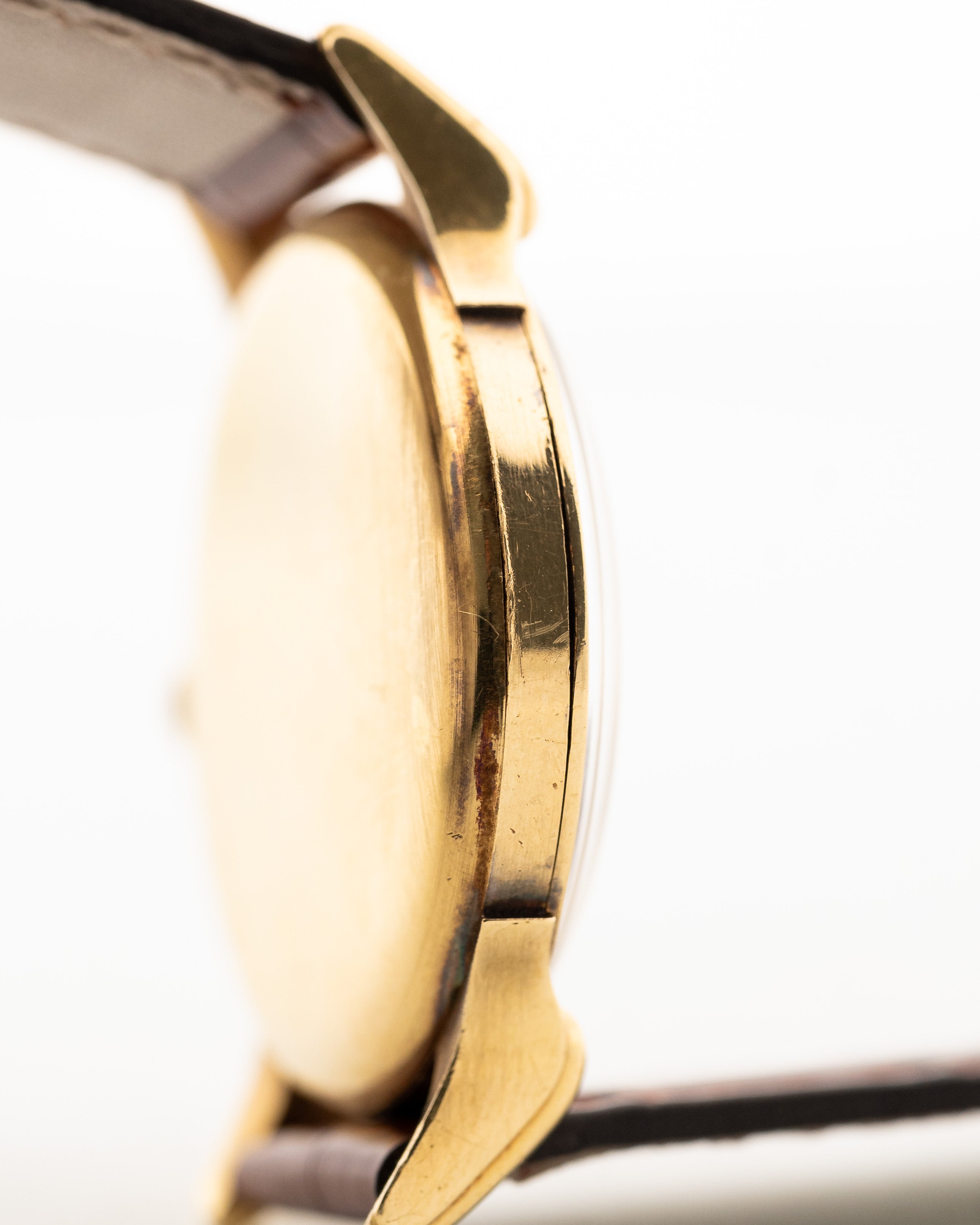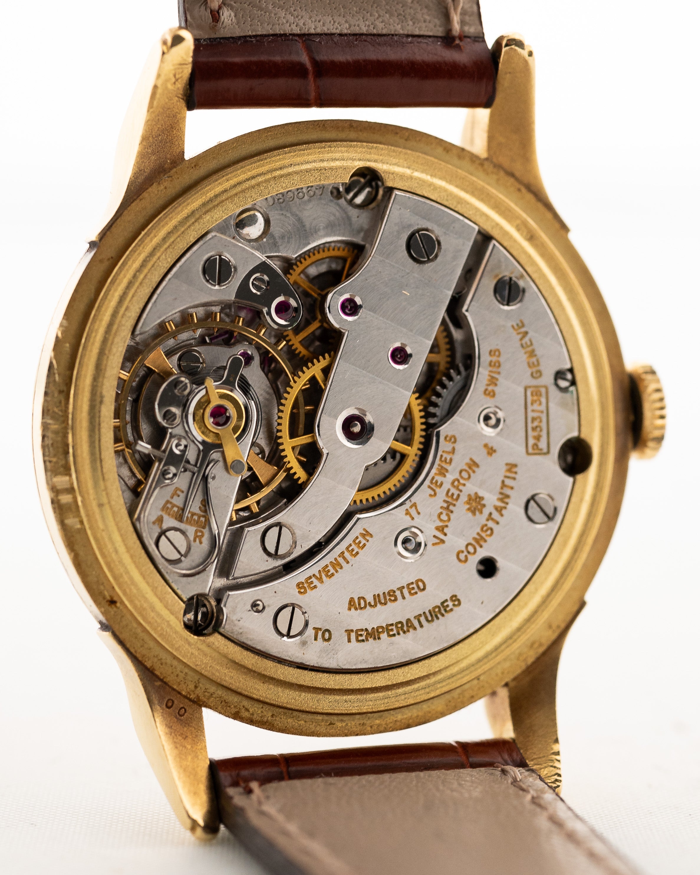 Hier haben wir ein wunderschönes Beispiel einer zeitlich begrenzten, 36 mm großen Vacheron Constantin aus 18k Gelbgold mit Gerlach 18k Grasshopper Gehäuse aus den 1950er Jahren.