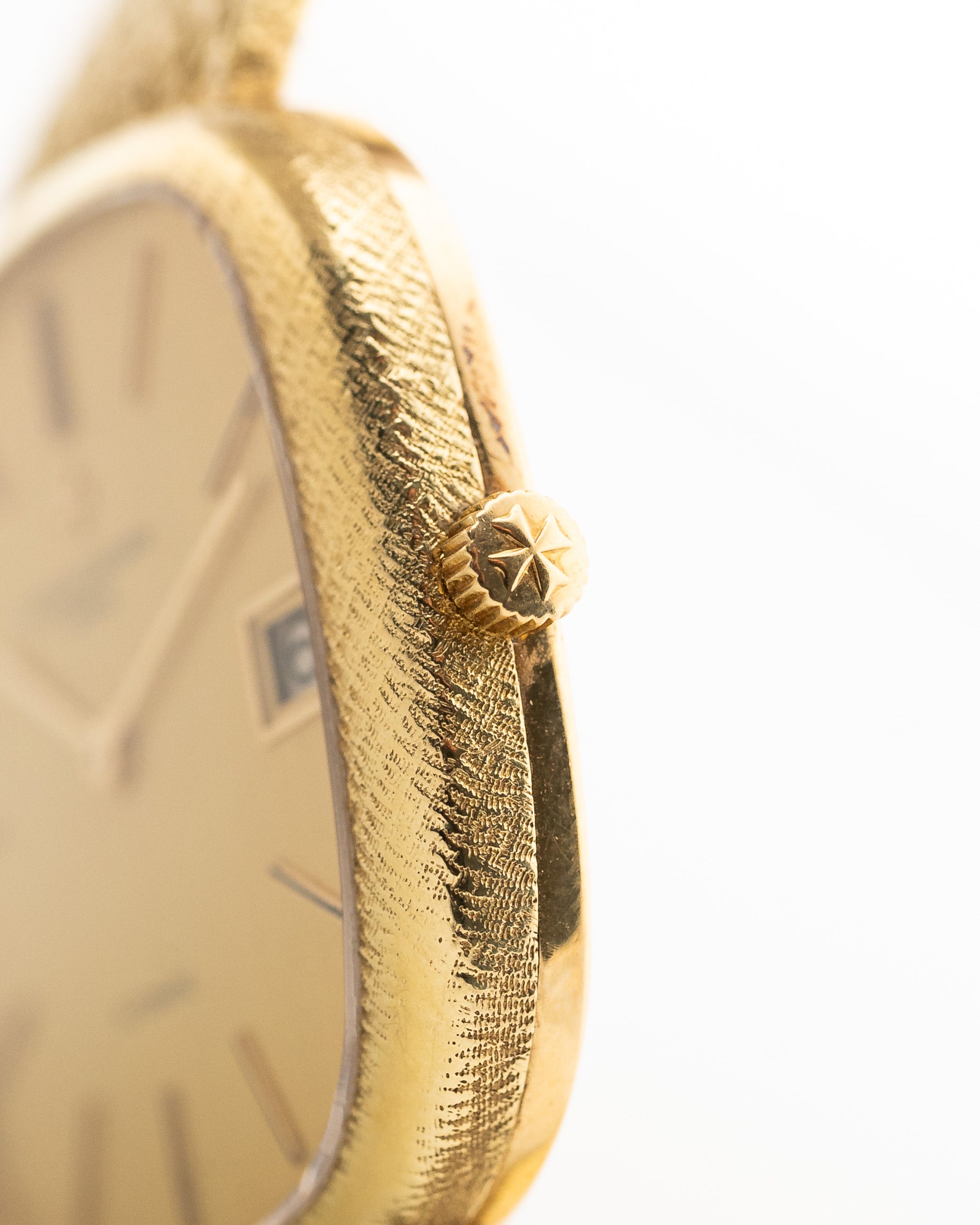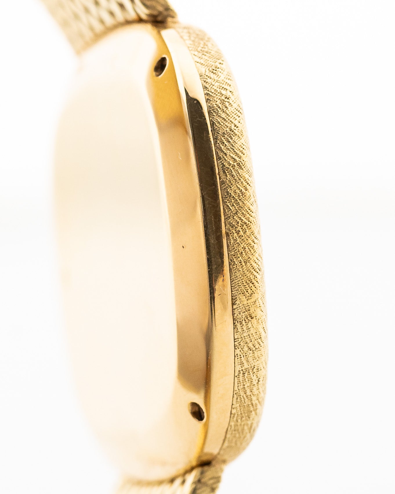 • 3-teiliges gehämmertes Gehäuse aus 18k Gelbgold mit verschraubtem Gehäuseboden