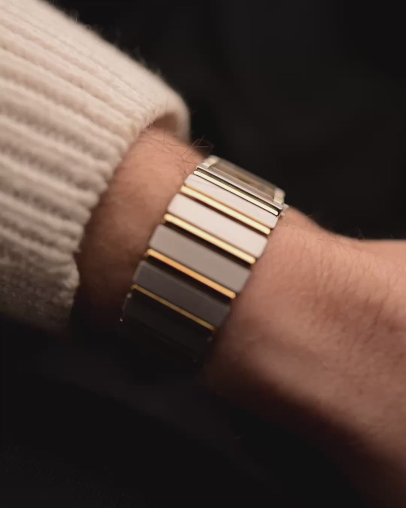 Dial. Esta es la parte "deportiva". Este modelo viene con una esfera bicolor plateada/blanca, límites de subesferas dorados, marcadores horarios gordos rellenos de ónice (similares a los marcadores Wide Boy de Rolex) y una firma LeCoultre dorada en relieve. Estos también vendrán con un 12 árabe y escala taquimétrica, firmada "T Swiss T". Los puntos de lume se encuentran fuera del marcador de las horas, como parte de la pista de los segundos.