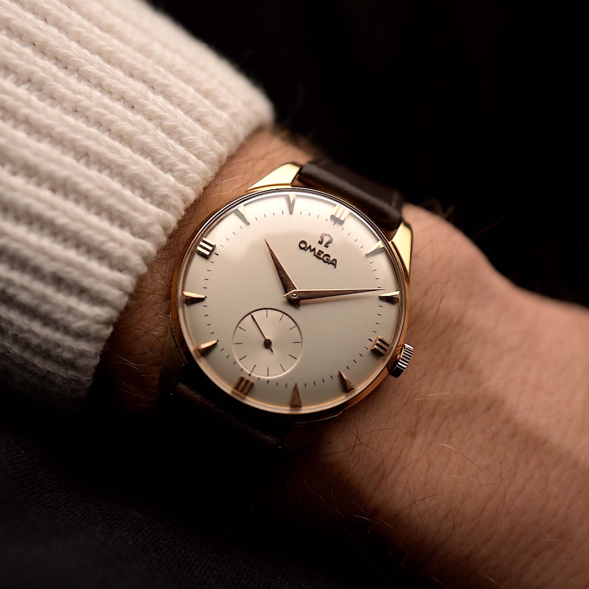 Reloj vintage Omega 2325 Jumbo Leaf, esfera plateada, caja de acero inoxidable, movimiento de cuerda manual, correa de piel gris, en la muñeca, fondo negro