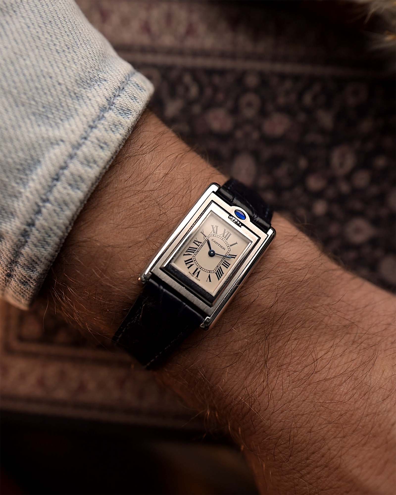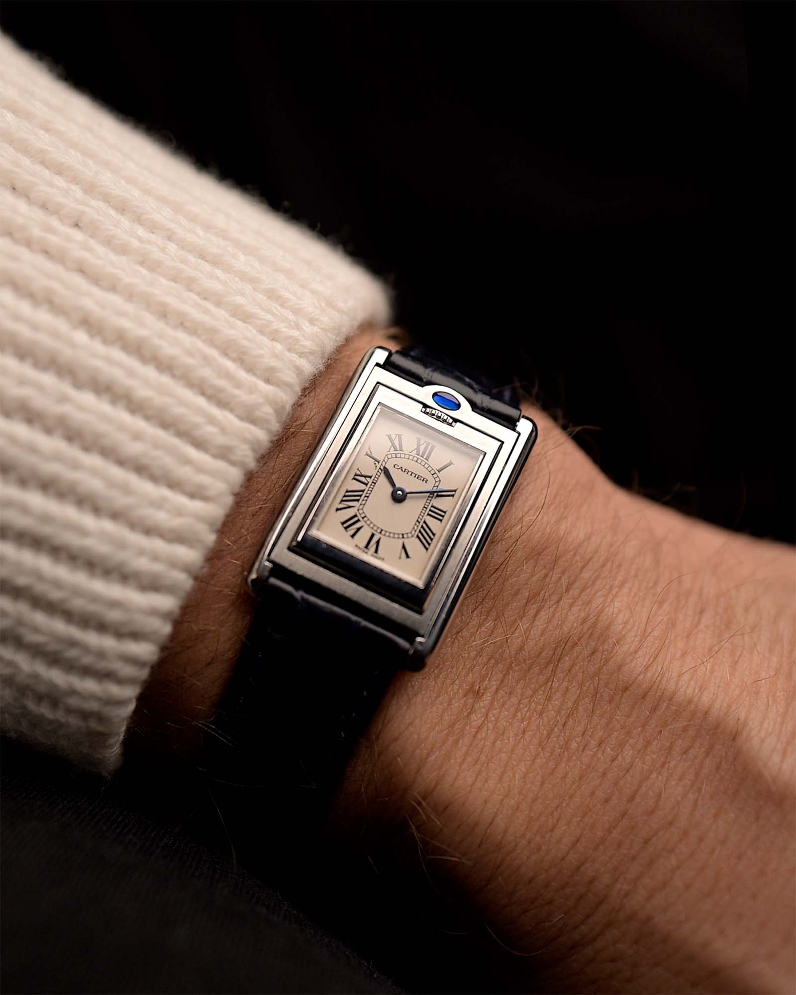 The stainless steel case is slim, balanced, and unmistakably Cartier. Its white dial with blued sword hands and minimalist design speaks to refined taste, while the original blue Cartier leather strap and deployant clasp complete the signature look.