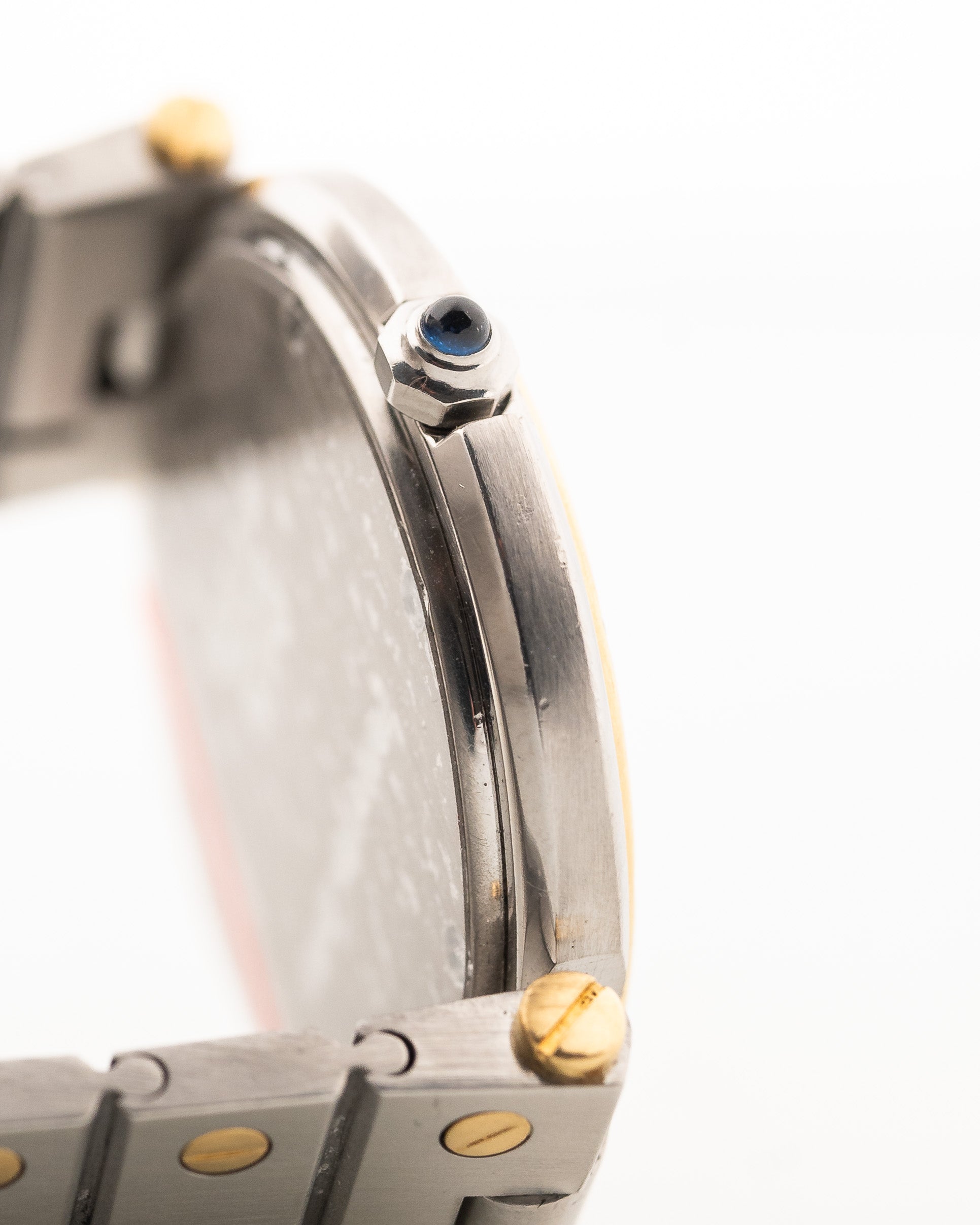 Este Cartier Santos Vendome Ronde bicolor de acero inoxidable destaca por su esfera con números romanos blancos, sus agujas de acero azulado y, por supuesto, sus detalles de oro de 18 quilates.