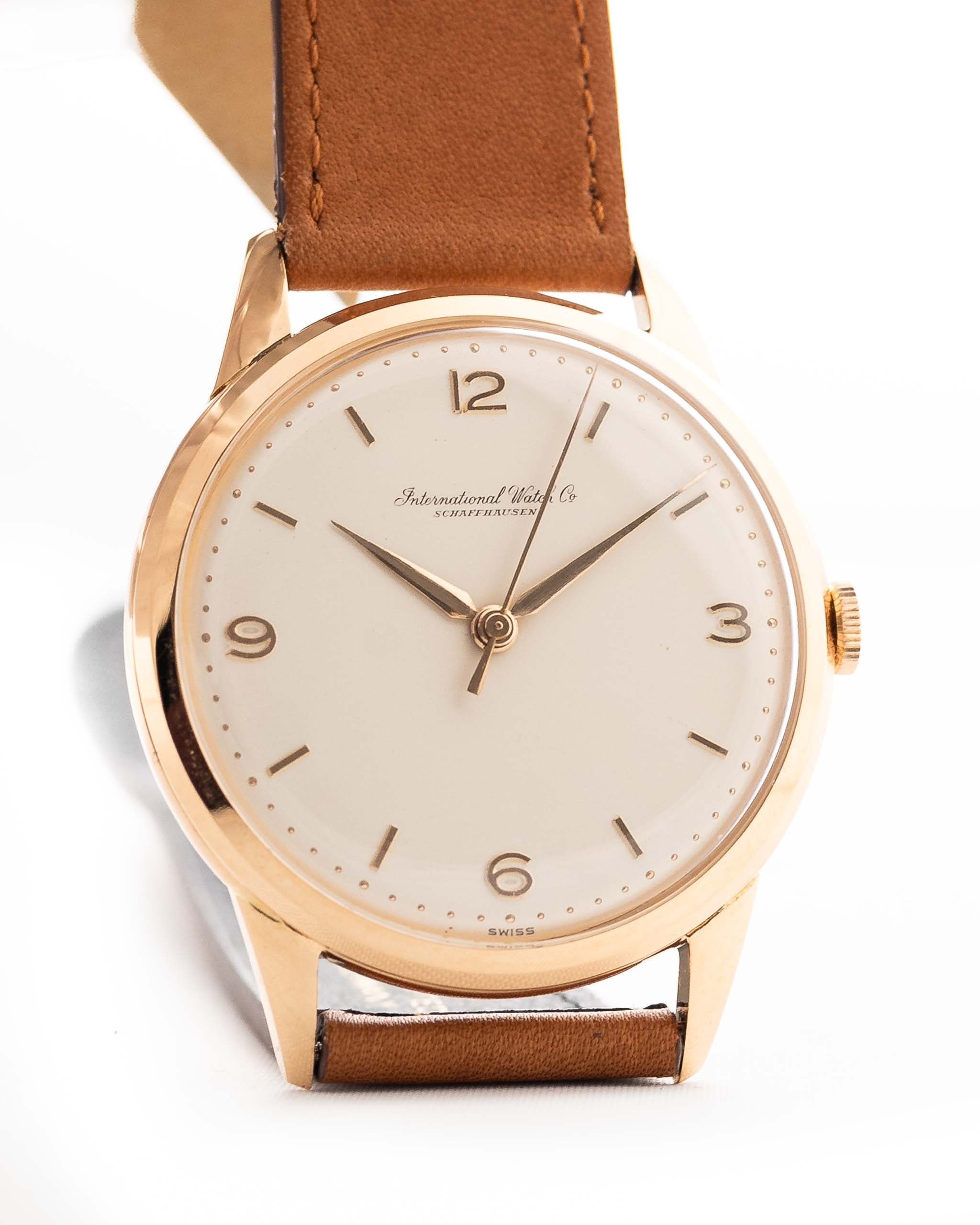 Vintage IWC Cal. 89 de 1958, caja de 36 mm de oro rosa de 18 quilates, esfera plateada original, cuerda manual, correa de cuero coñac, en manos