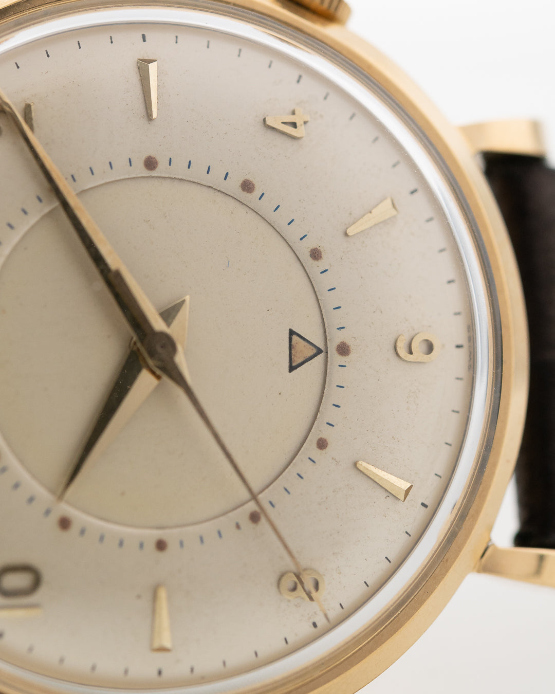 Junto al Reverso, el Memovox es probablemente el segundo reloj de pulsera vintage más reconocible popularizado por la manufactura. La función de alarma no sólo fue una visión de futuro, sino también increíblemente útil. Este ejemplo que ve aquí es la versión de cuerda manual de 1951 y presenta un diseño limpio sin fecha y una preciosa esfera de color crema.