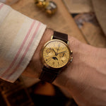 Este cronógrafo Longines Moonphase Ref. 6574 de la década de 1980 está fabricado en oro amarillo macizo de 18 quilates y presenta una de las complicaciones más encantadoras de la relojería, con una edición limitada a solo 100 piezas. La fecha y la fase lunar se muestran en perfecto equilibrio, complementadas pordos refinadosregistros de cronógrafo, todo ello dispuesto con la claridad y la sobriedad características de Longines.