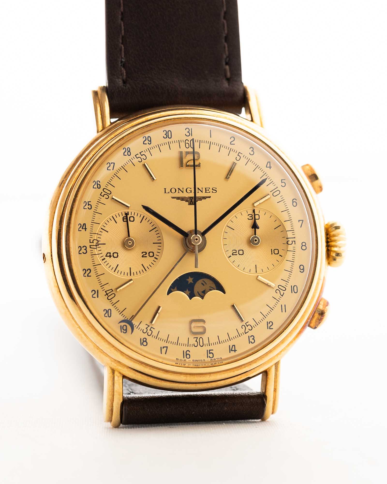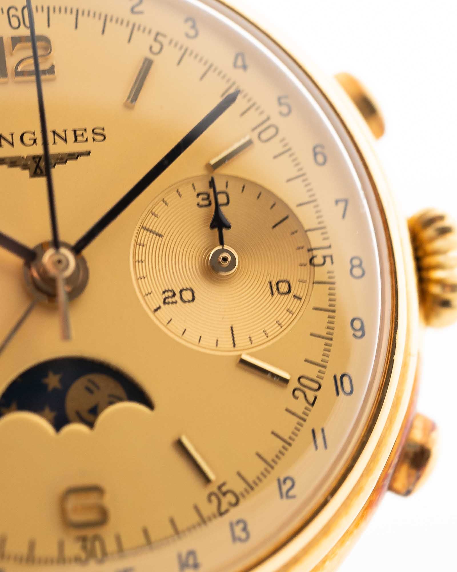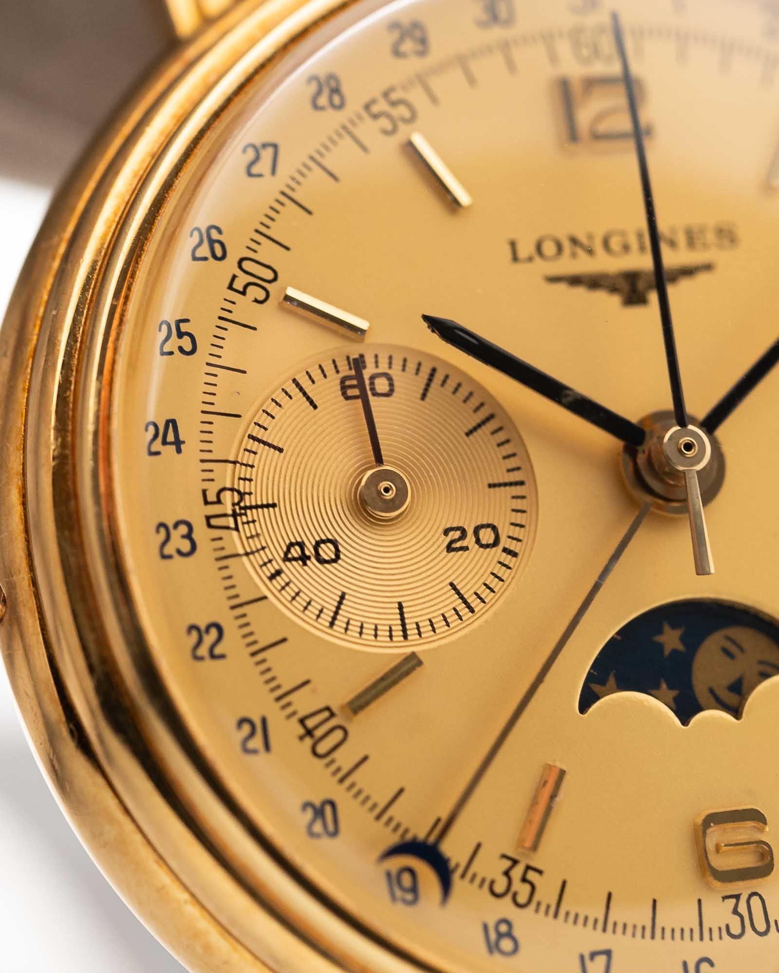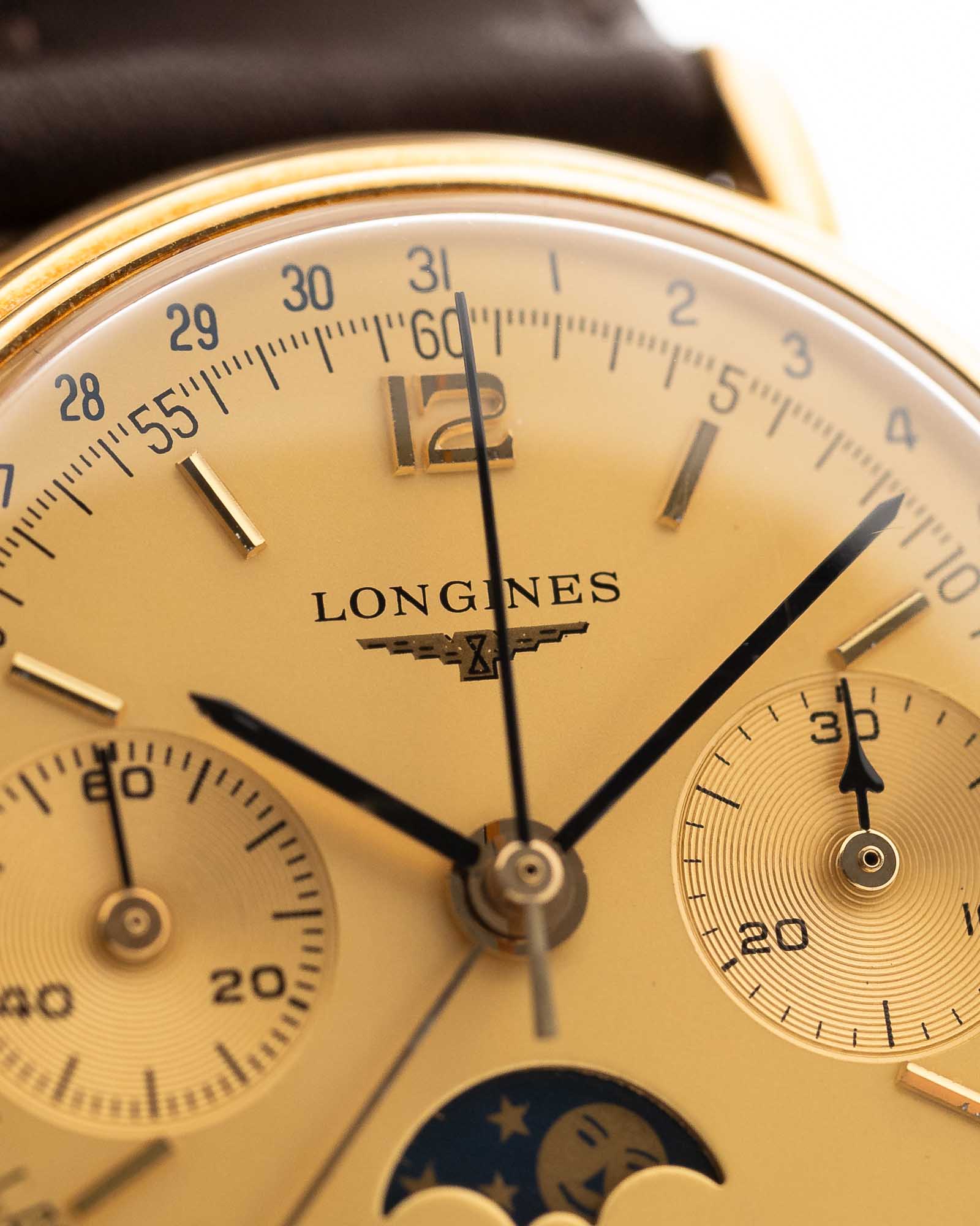 Cronógrafo Longines 6574 con fase lunar, oro de 18 quilates, década de 1980