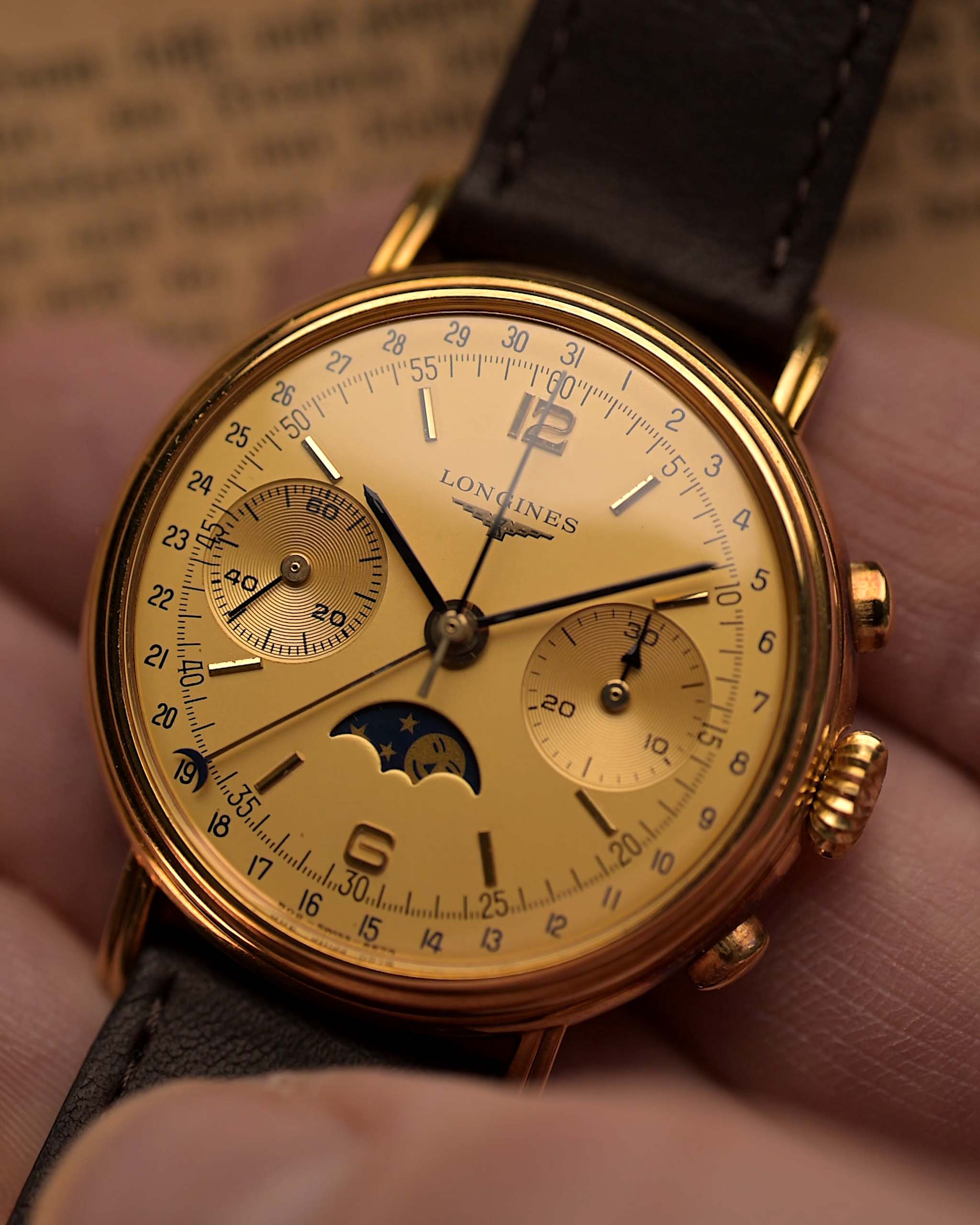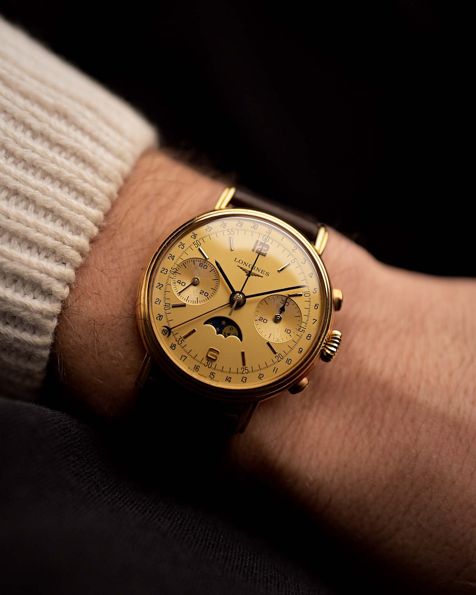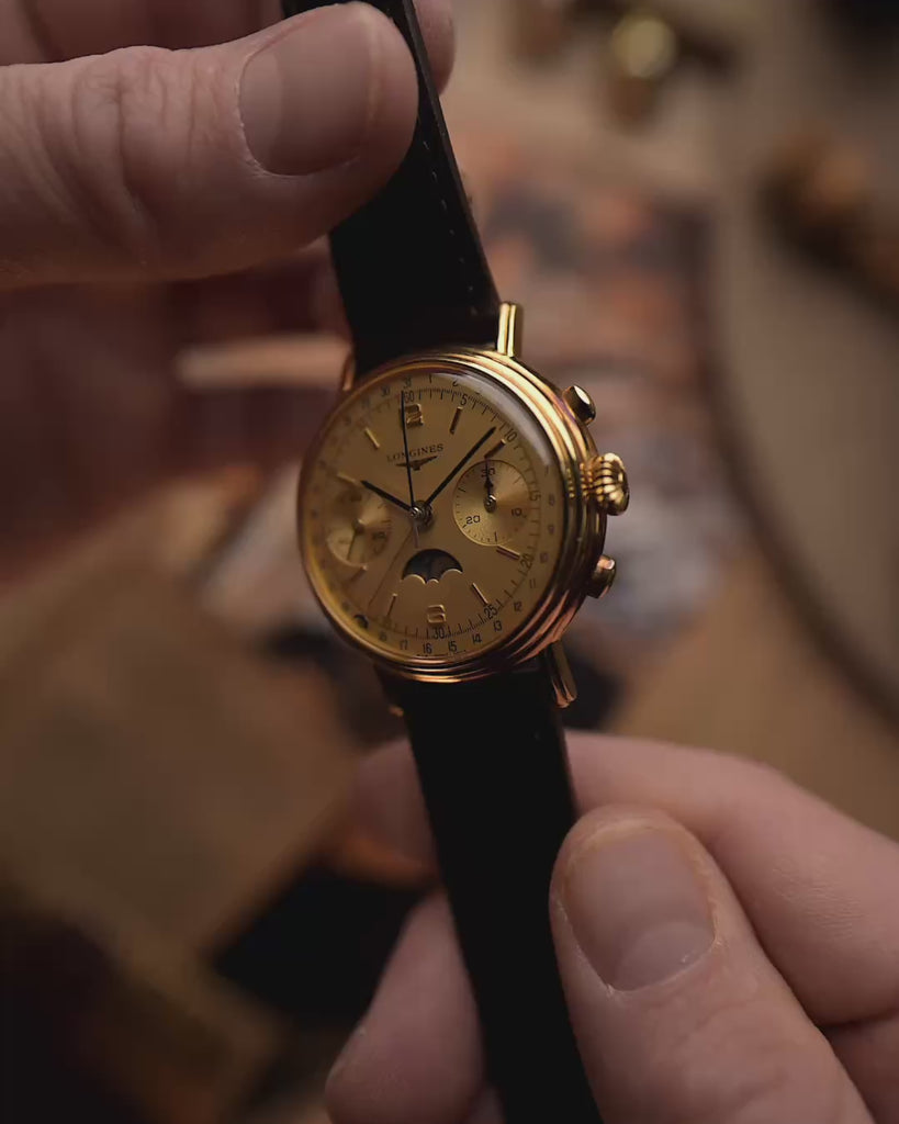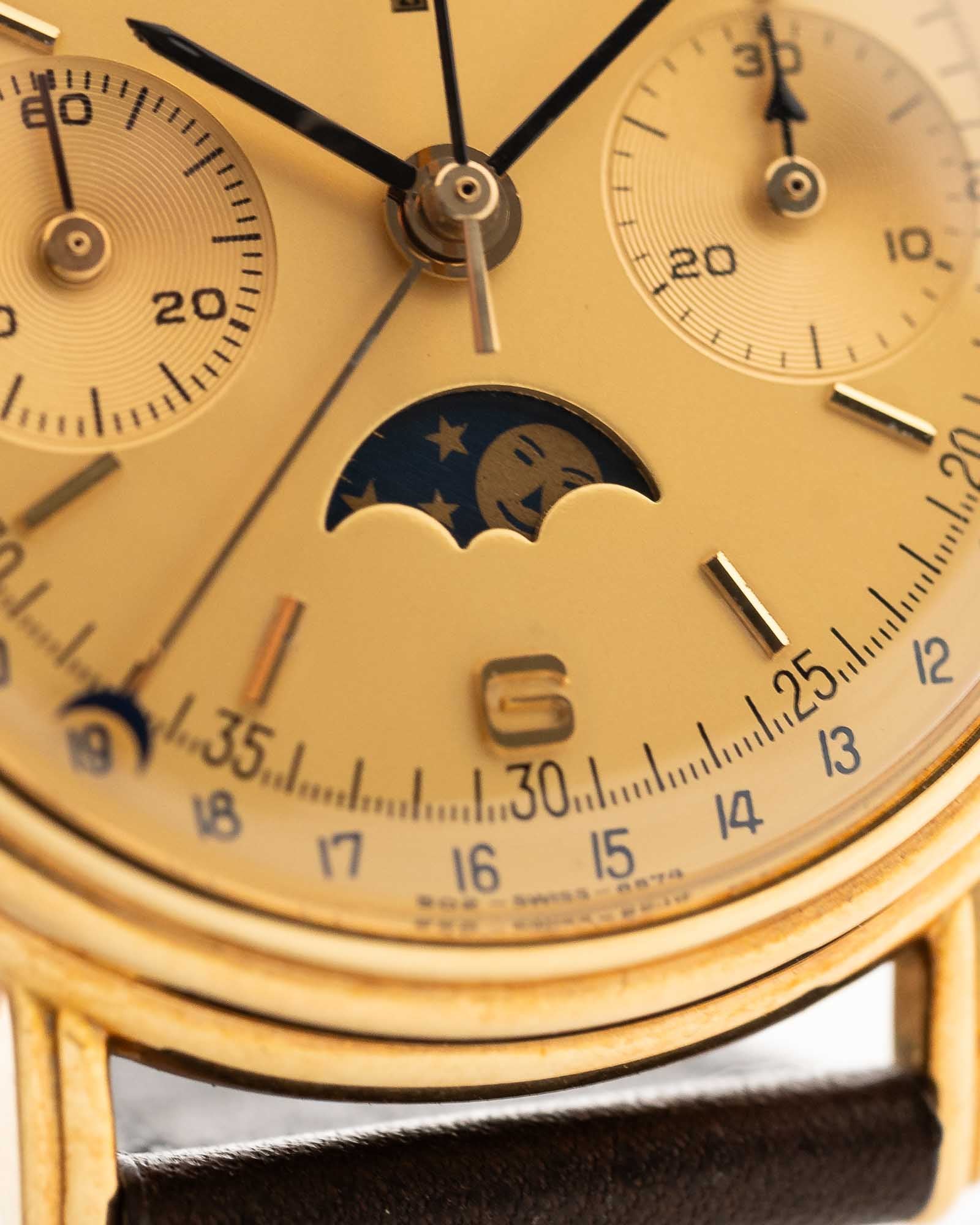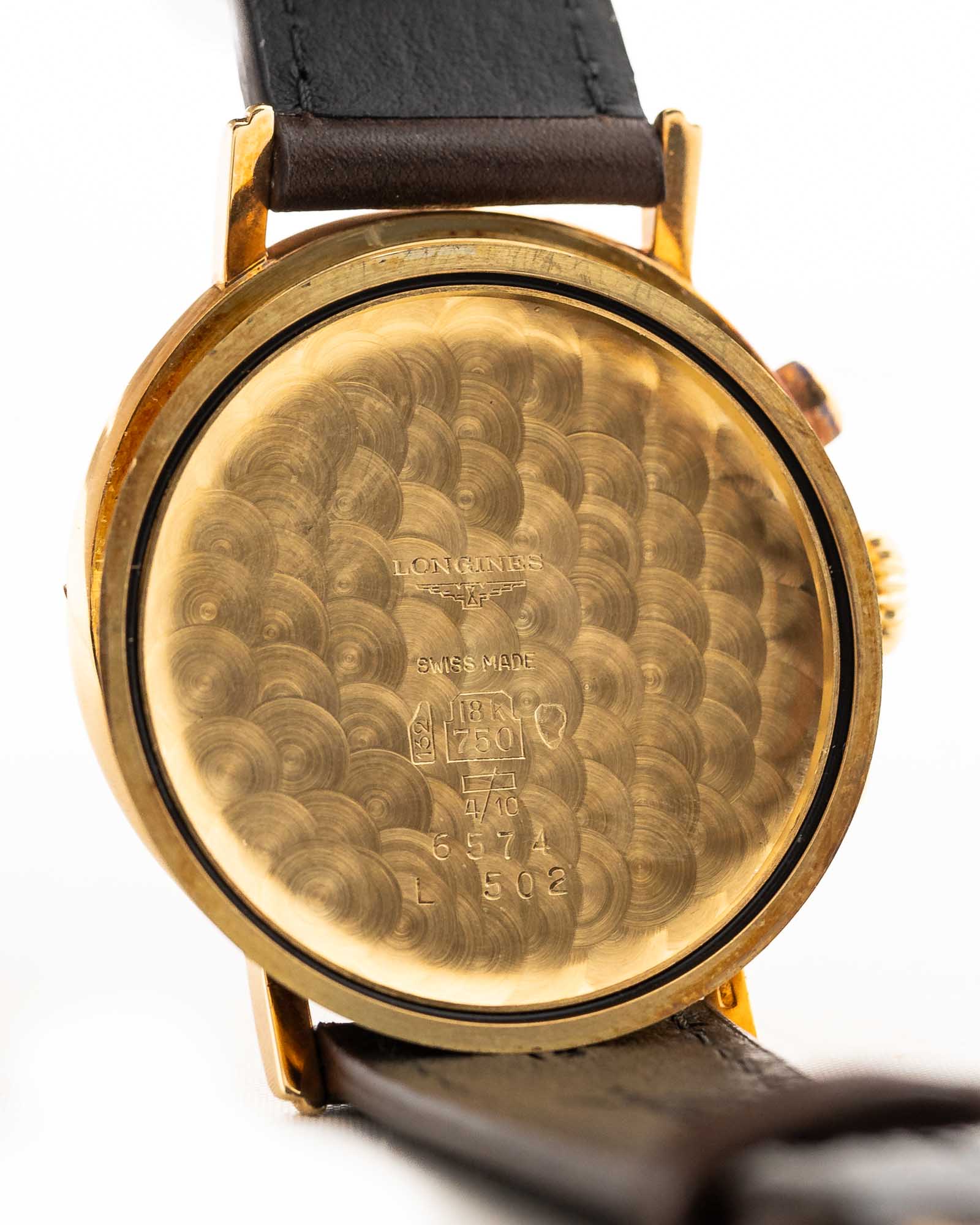 Cronógrafo Longines 6574 con fase lunar, oro de 18 quilates, década de 1980
